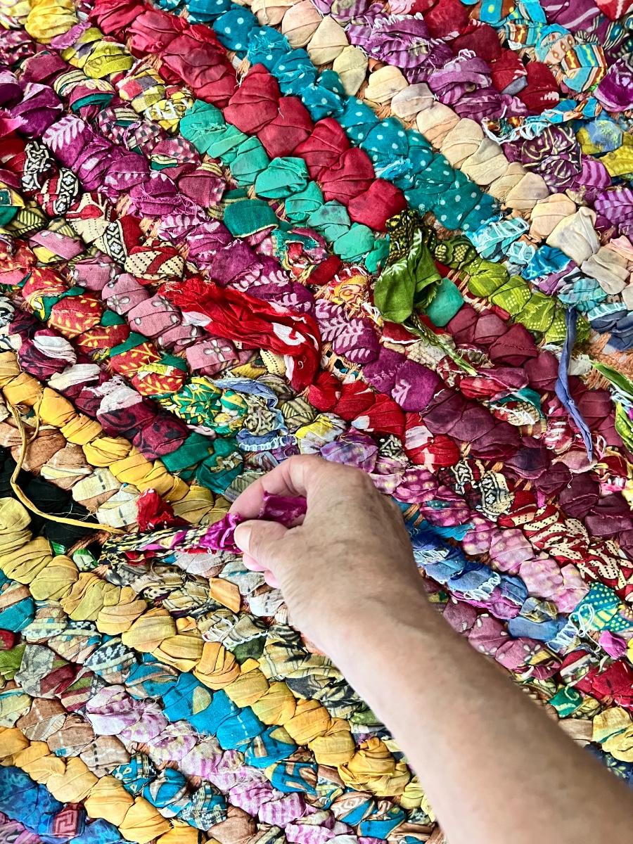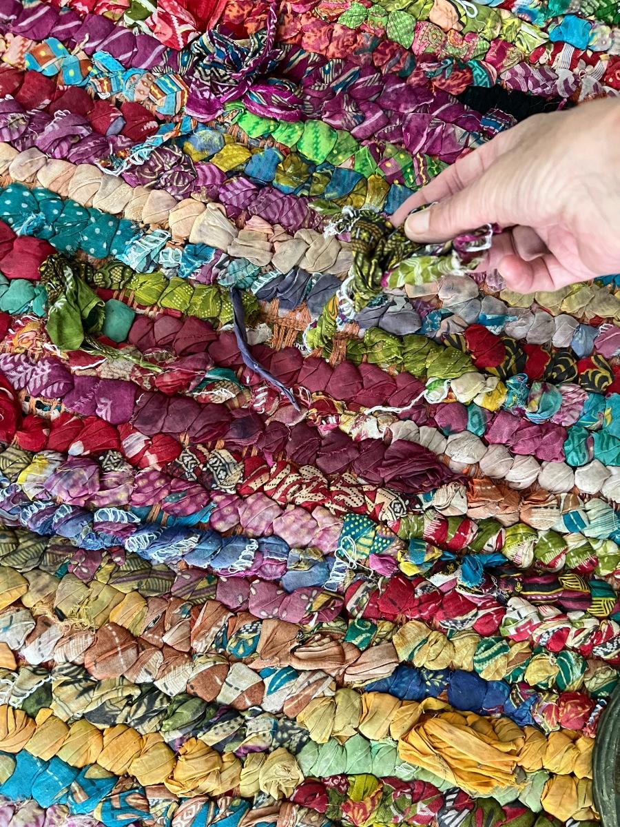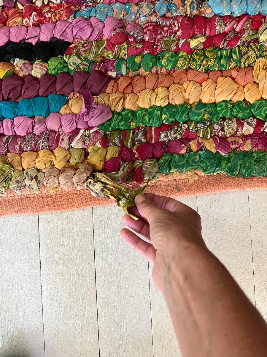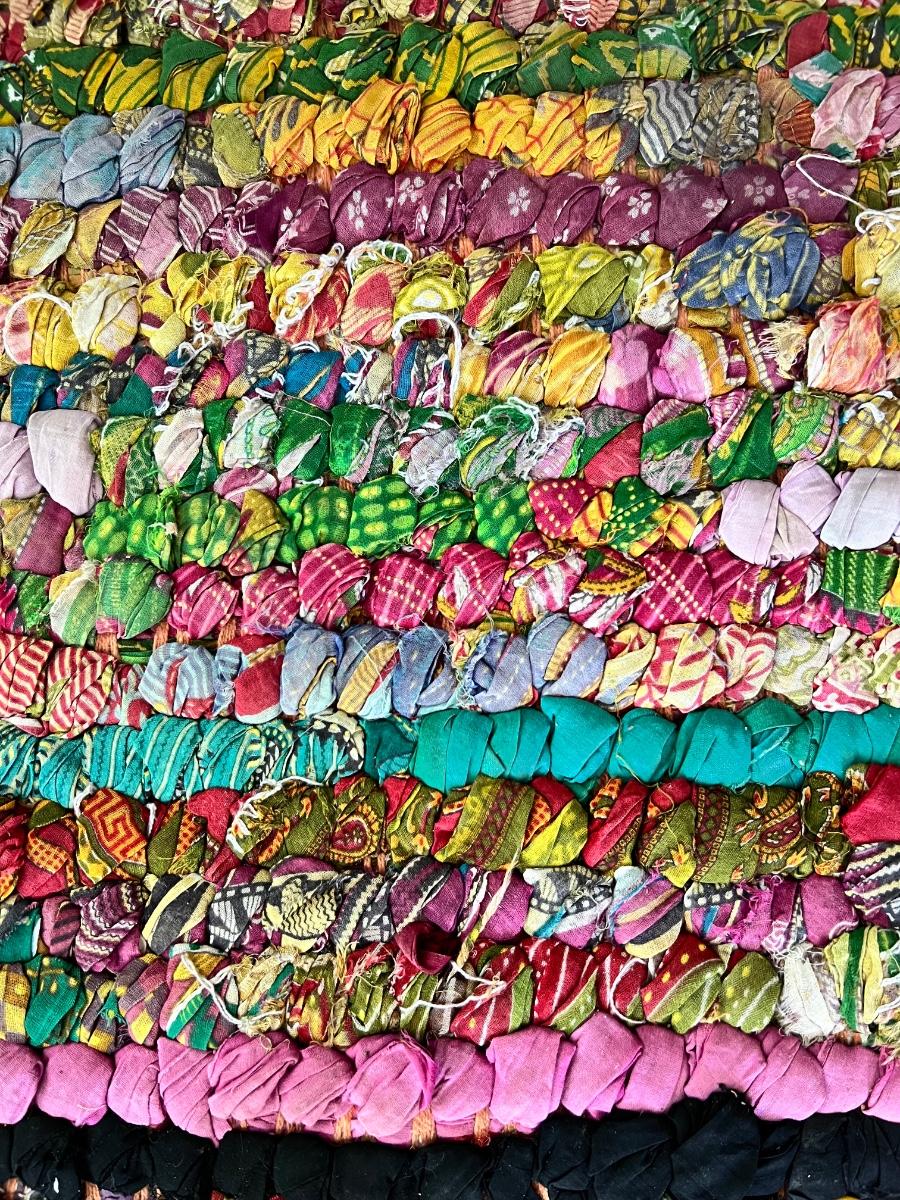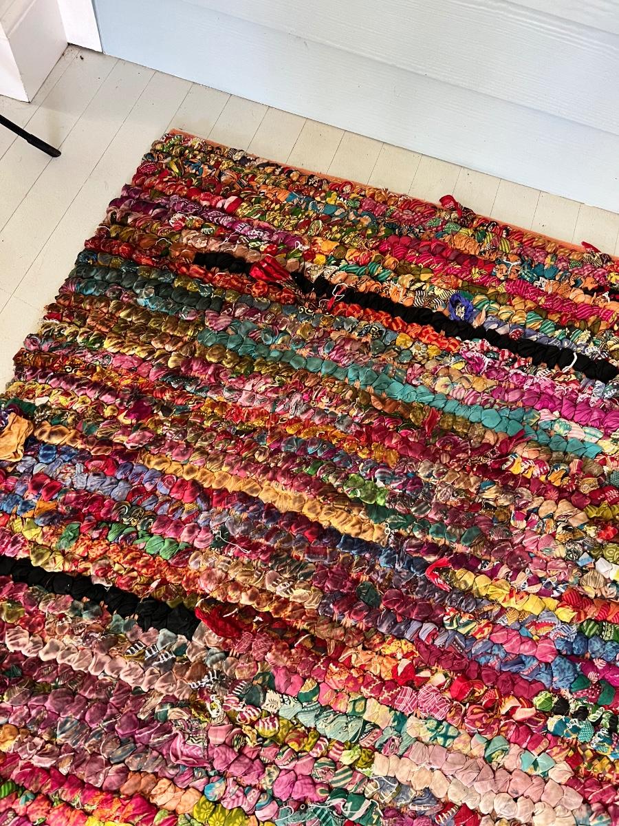 This colorful and cheerful rag rug will brighten up any space! It has some blemishes which includes numerous areas where the rags have come loose and there is a dark stain on the one corner, see photos.