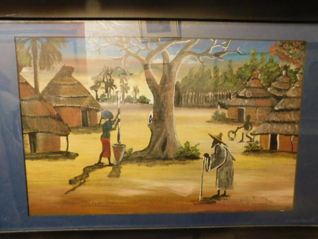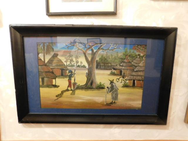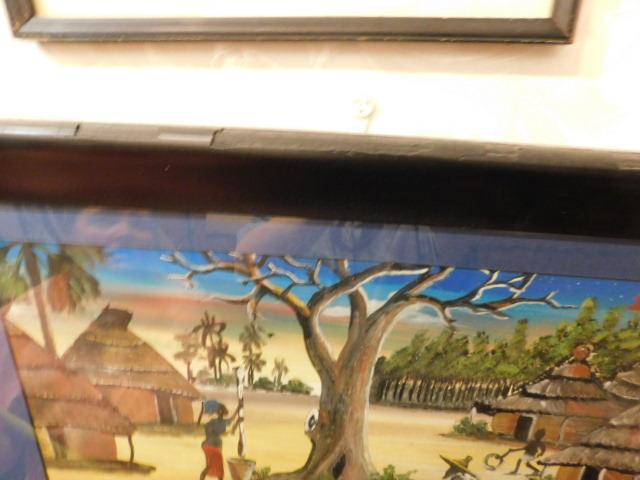Colorful African Village Framed Art 27"x17" frame has some damage as shown
