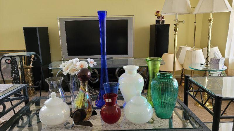 31" Tall cobalt blue handmade in Poland art glass vase, white irresdesent 14" vase and covered 9" candy dishes made in Italy and several more.