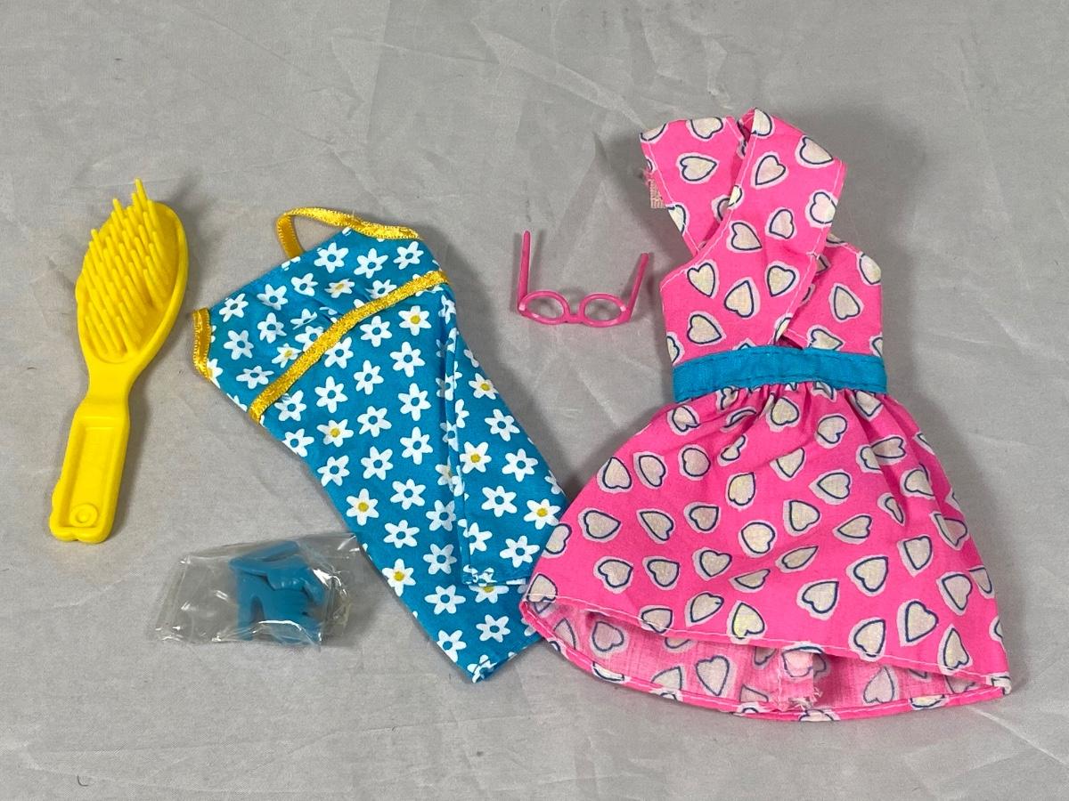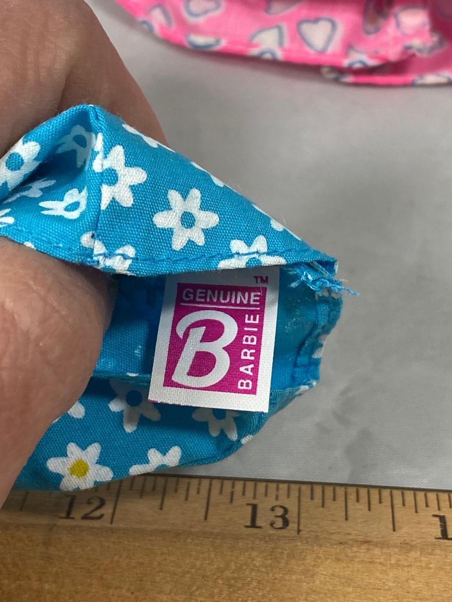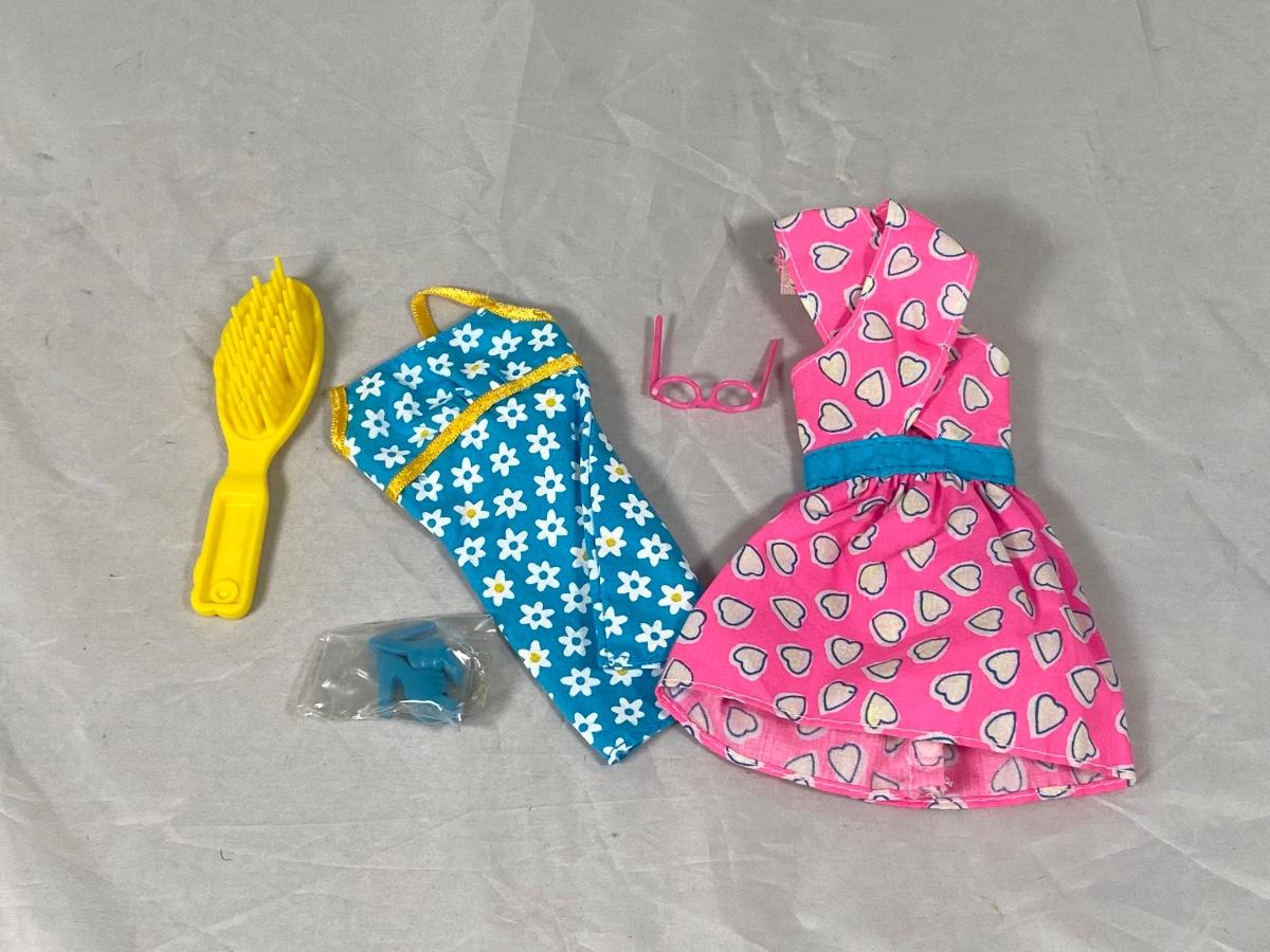 Pair of colorful Barbie dresses. Come with a pair of matching blue high heels, pink sunglasses and a hairbrush. Glasses are a little bent up. Good condition, dresses would fir any 12" doll.