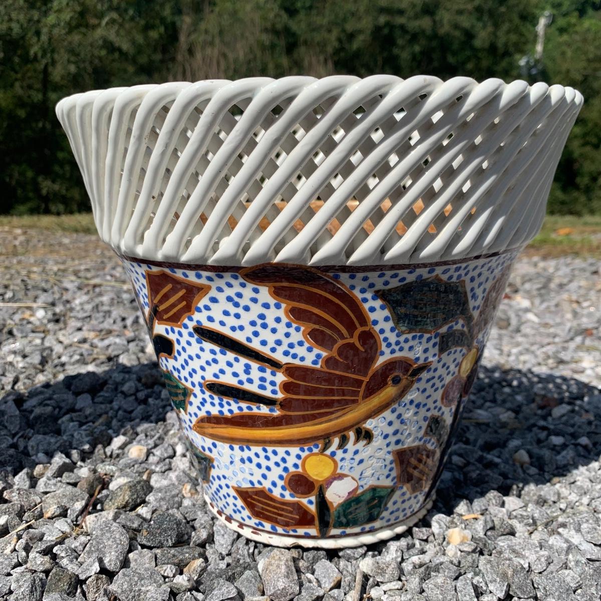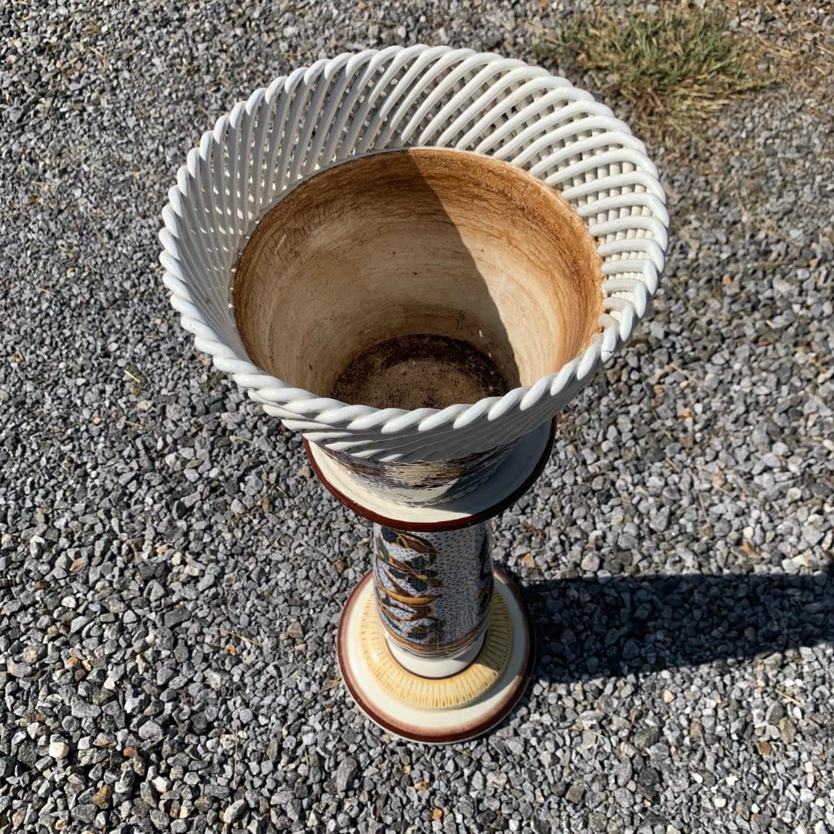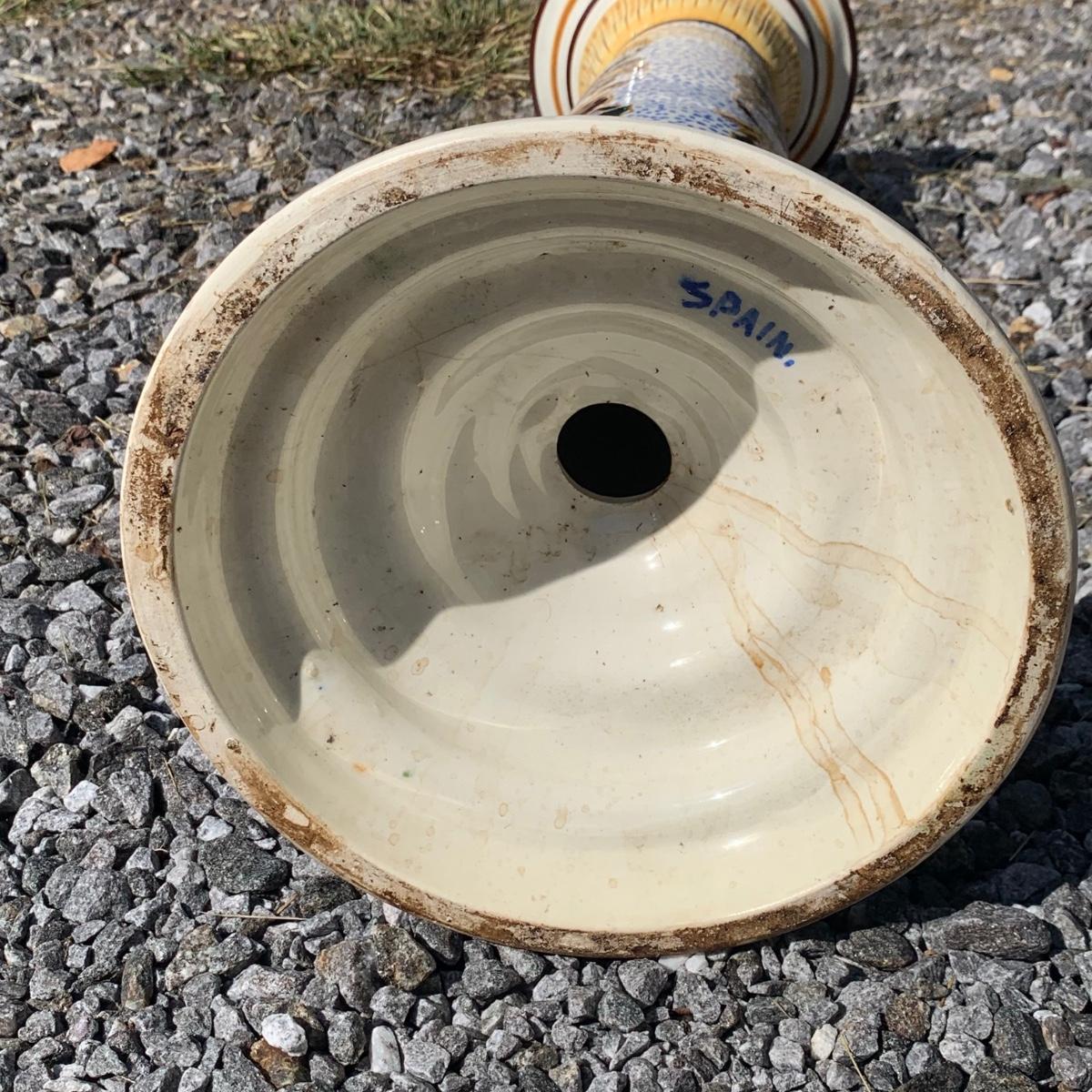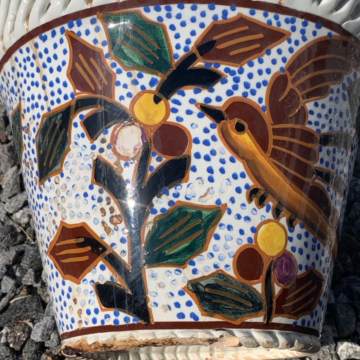 A planter with matching stand that features a colorful bird and flower motif. They are ceramic and feel like porcelain. The set appears to be hand painted. Both planter and stand show signs of use and wear. The inside of the planter and top of the stand are stained and the bottom of the planter has some chips. The top of the planter is 11”D and it is about 9.5”H. The stand is about 26”H. “Spain” is written on the bottom of the stand.