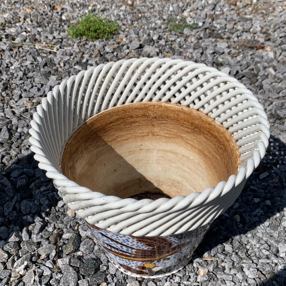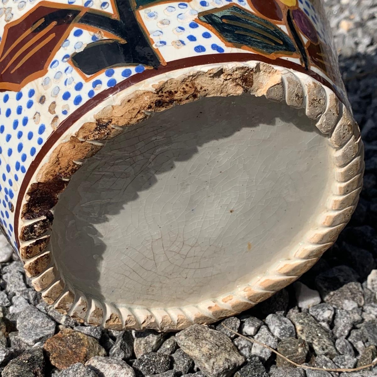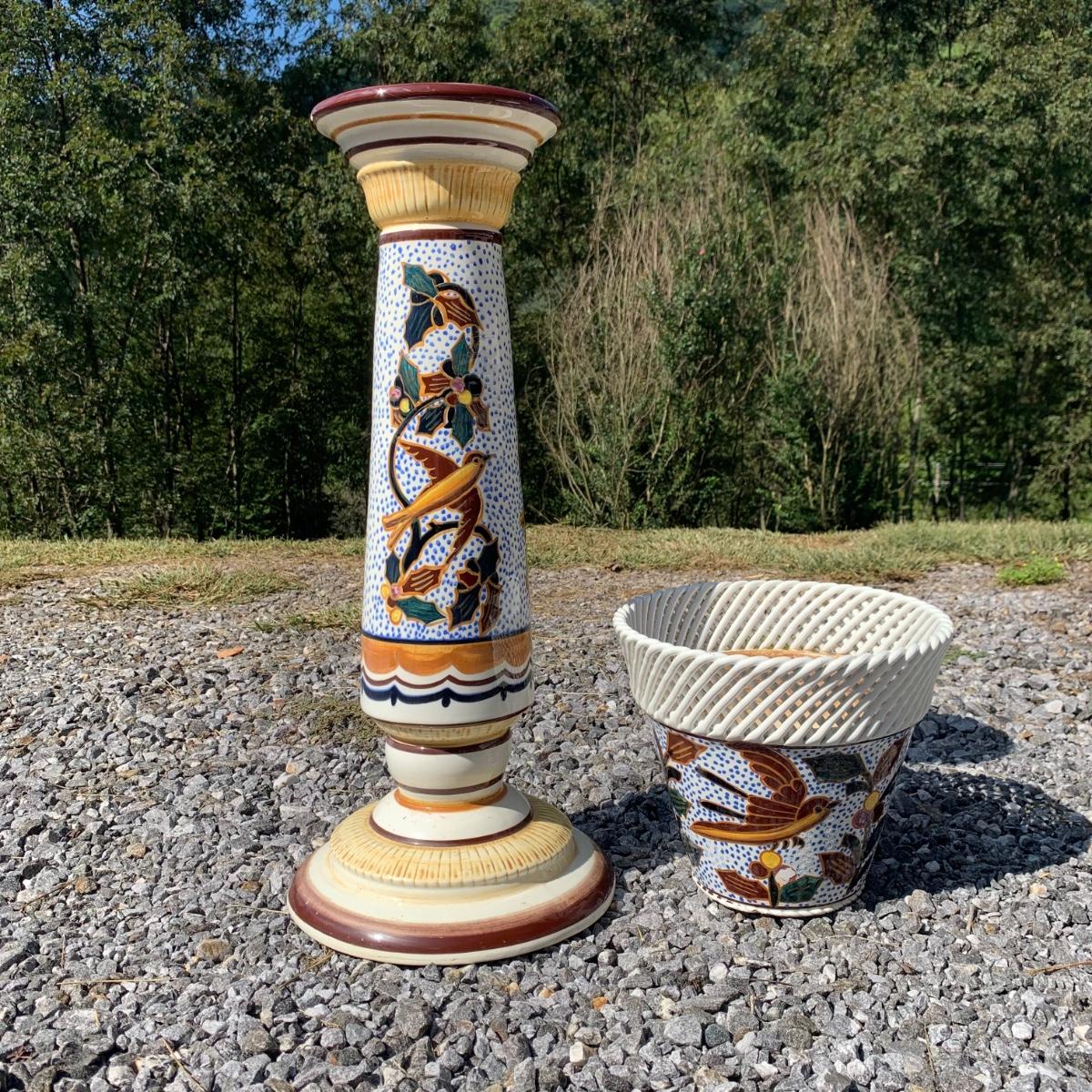 A planter with matching stand that features a colorful bird and flower motif. They are ceramic and feel like porcelain. The set appears to be hand painted. Both planter and stand show signs of use and wear. The inside of the planter and top of the stand are stained and the bottom of the planter has some chips. The top of the planter is 11”D and it is about 9.5”H. The stand is about 26”H. “Spain” is written on the bottom of the stand.