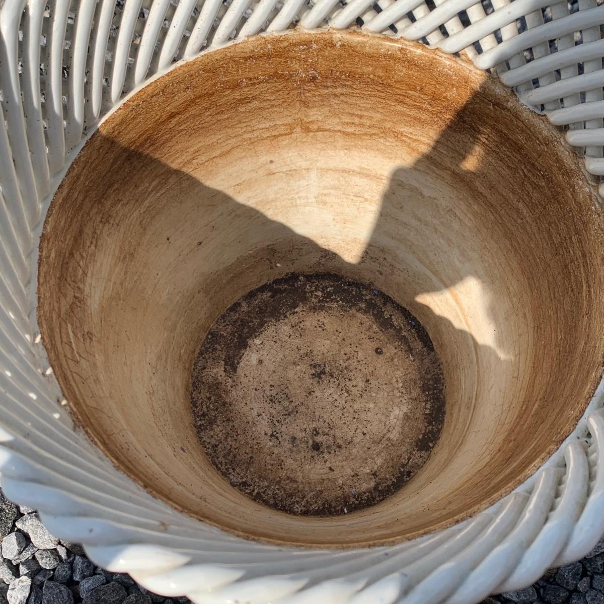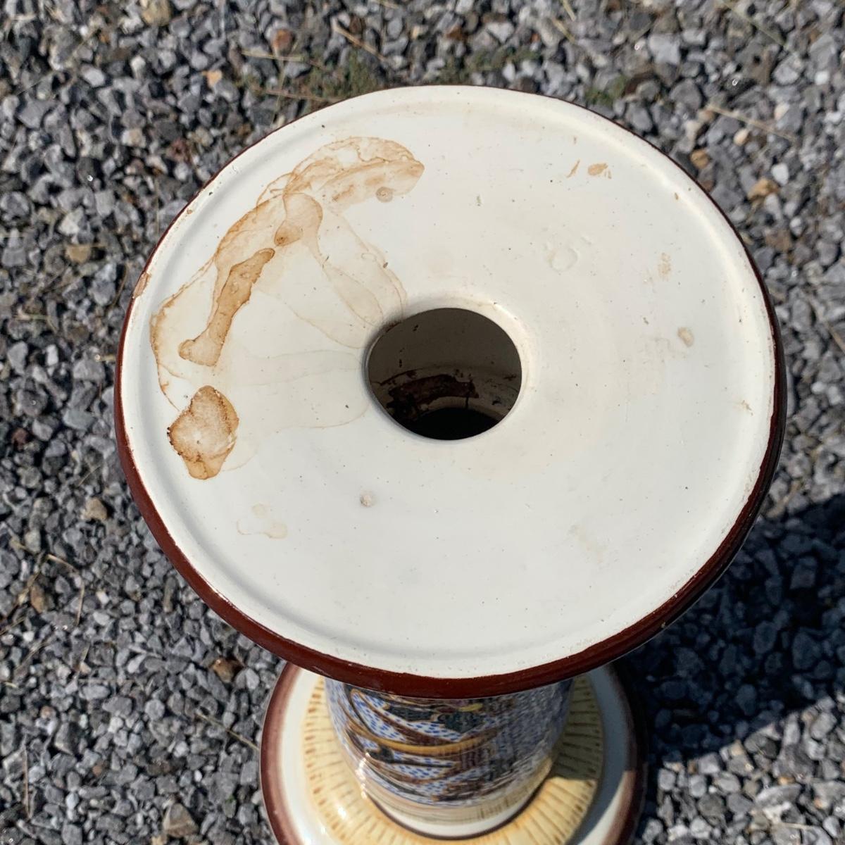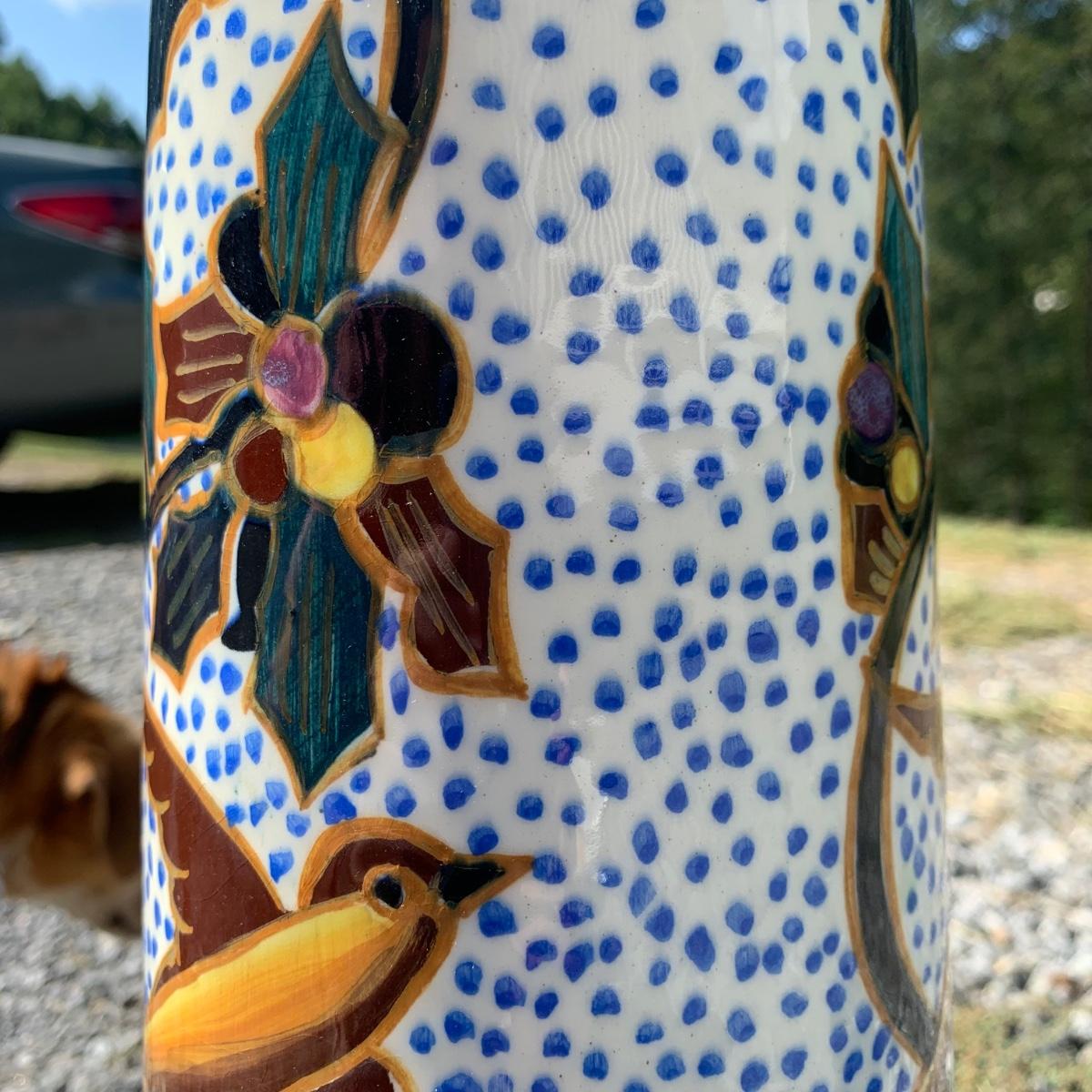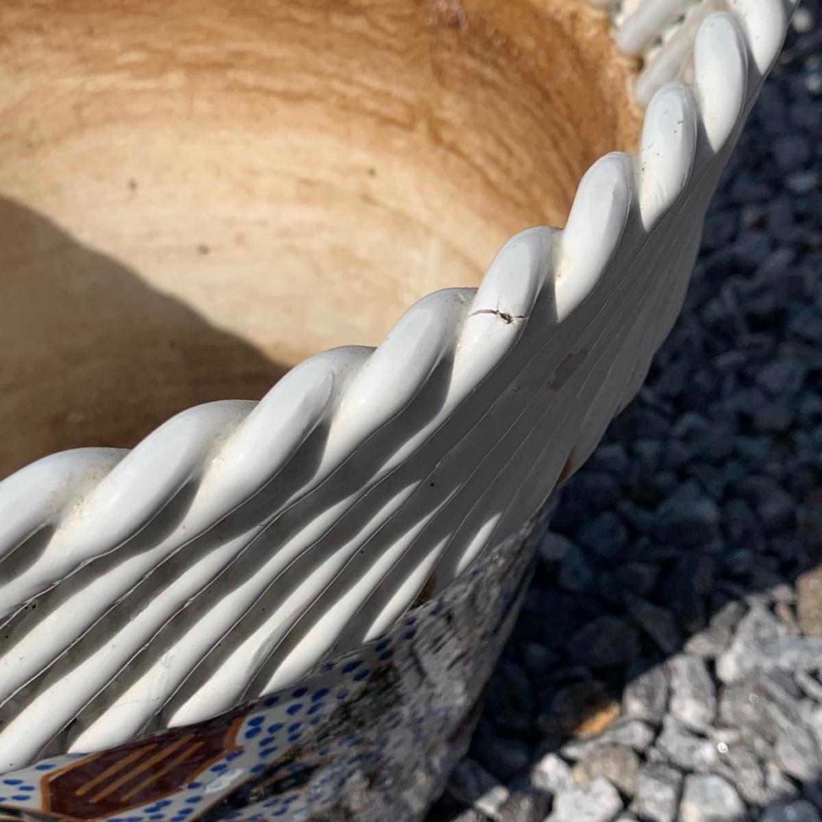 A planter with matching stand that features a colorful bird and flower motif. They are ceramic and feel like porcelain. The set appears to be hand painted. Both planter and stand show signs of use and wear. The inside of the planter and top of the stand are stained and the bottom of the planter has some chips. The top of the planter is 11”D and it is about 9.5”H. The stand is about 26”H. “Spain” is written on the bottom of the stand.