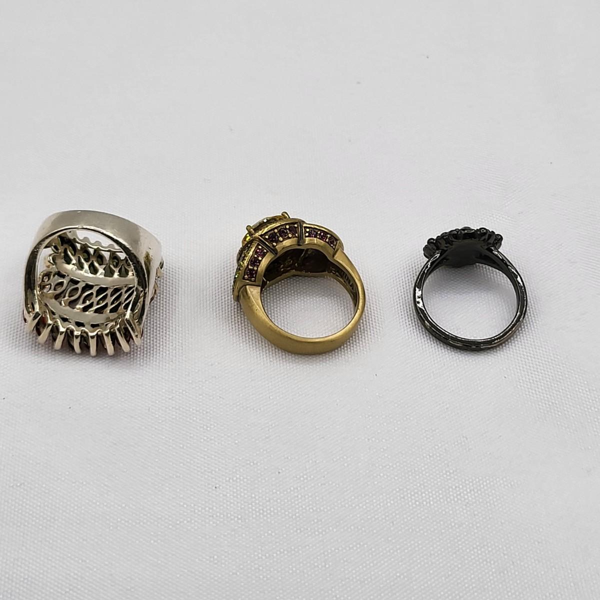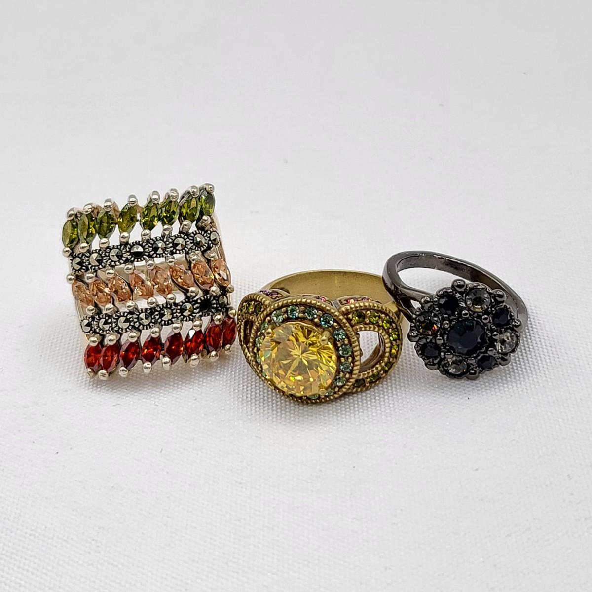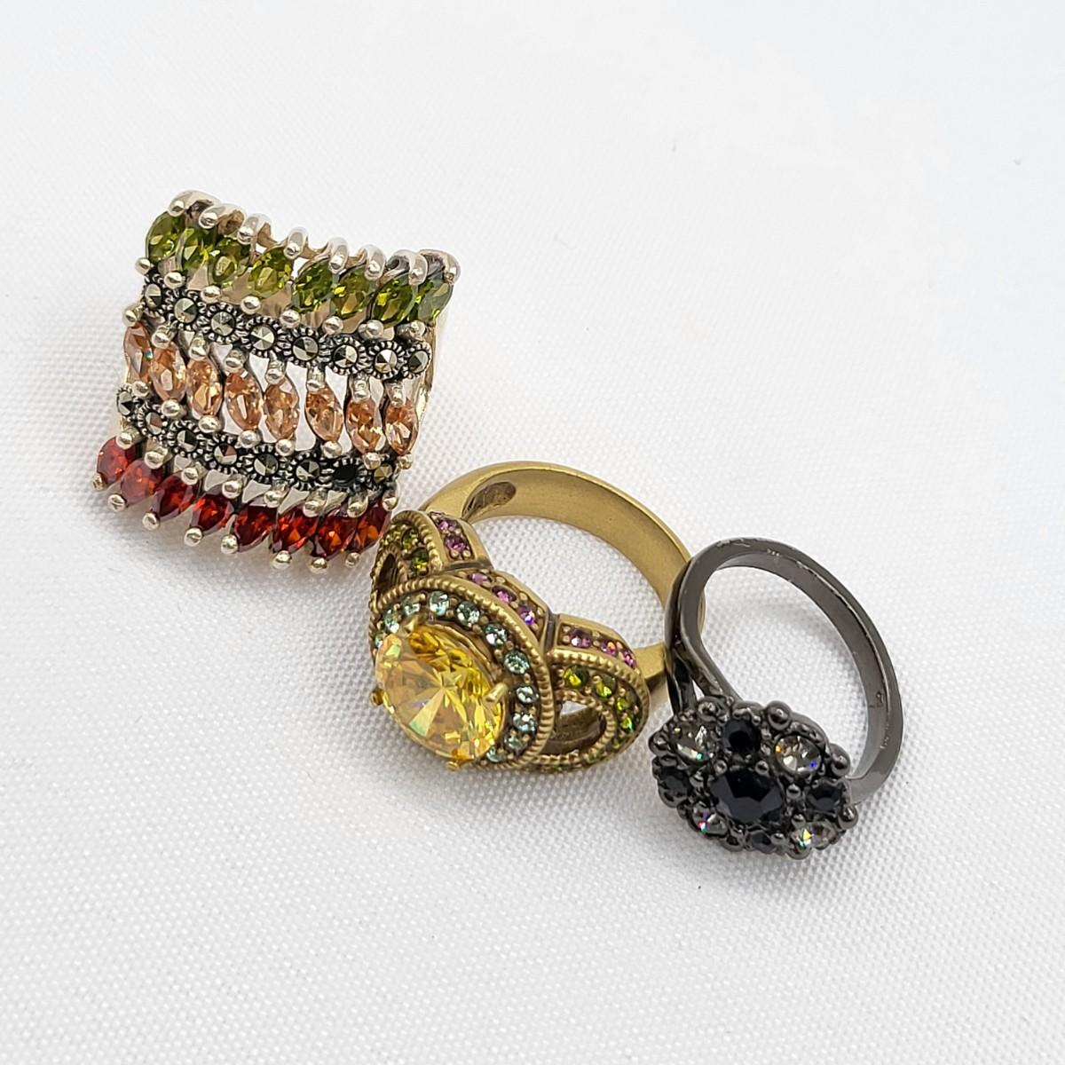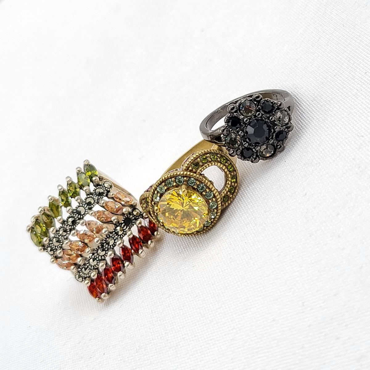 Huge eye catcher, five row CZ and Marcasite stones ring size 7. Wide split shank band, fully finished inside. One tiny marcasites is missing. Stamped 925 PK. LaVinage multi-color CZ stones matte finish gold tone, size 7. Black fashion ring with black and clear crystals, size 7.