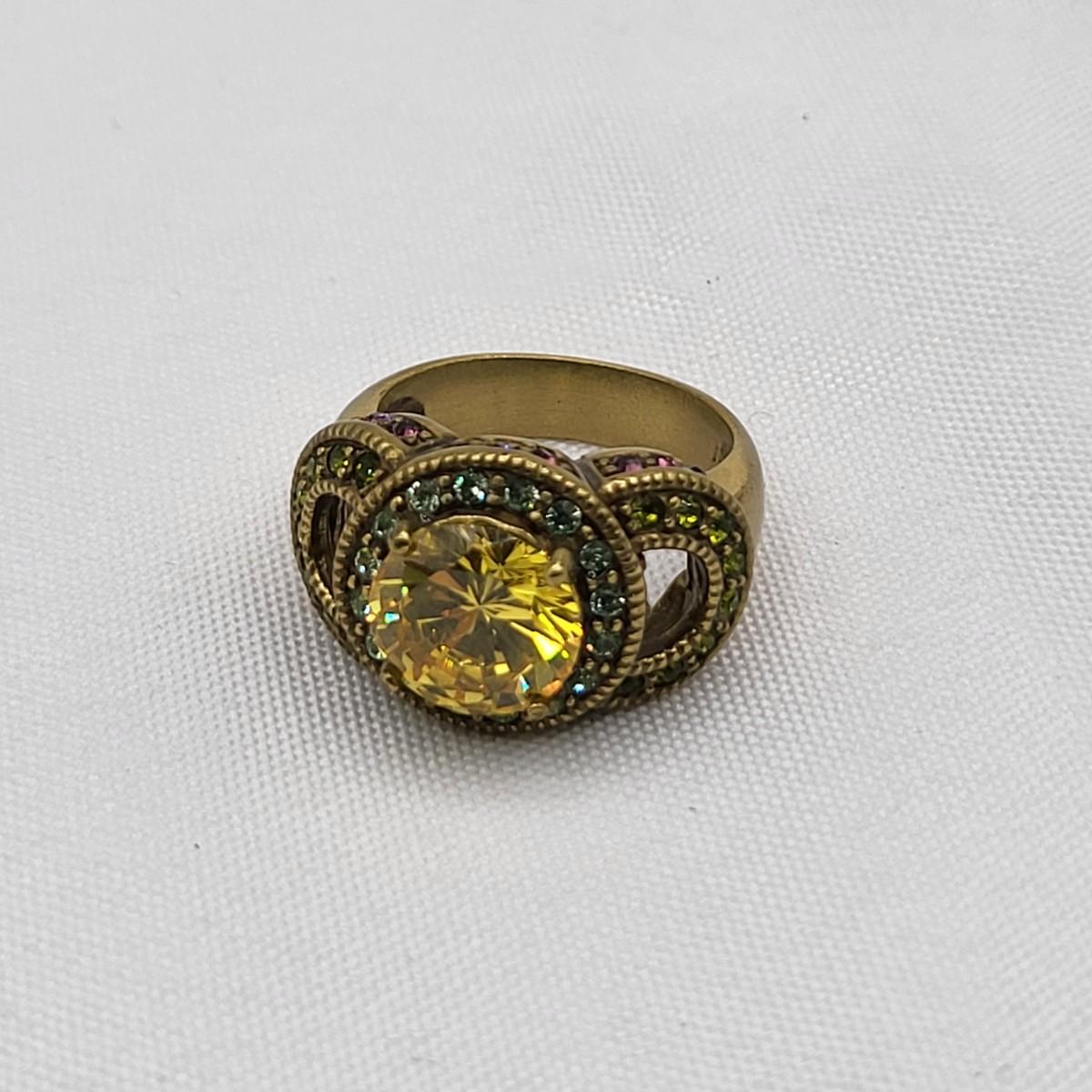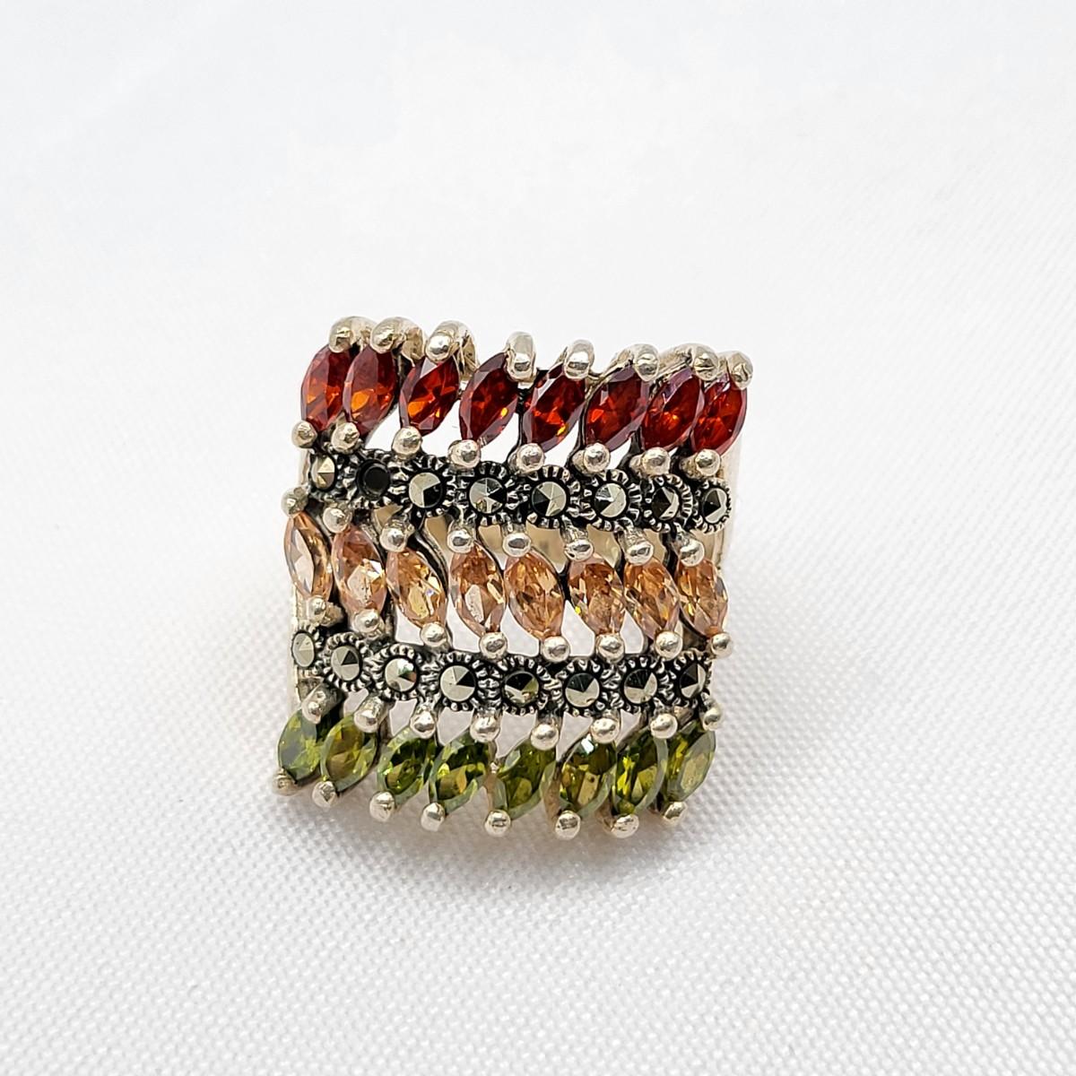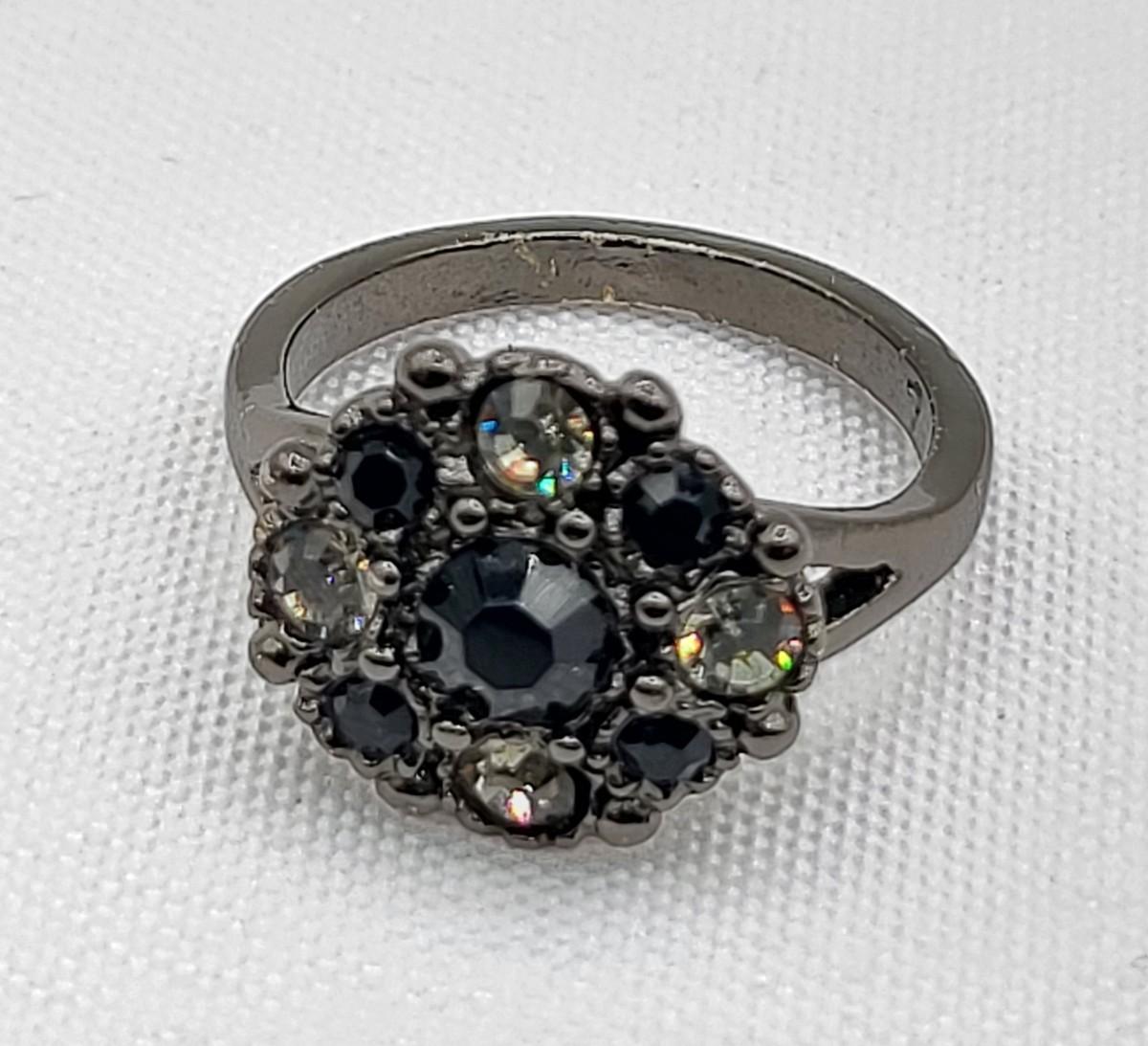 Huge eye catcher, five row CZ and Marcasite stones ring size 7. Wide split shank band, fully finished inside. One tiny marcasites is missing. Stamped 925 PK. LaVinage multi-color CZ stones matte finish gold tone, size 7. Black fashion ring with black and clear crystals, size 7.