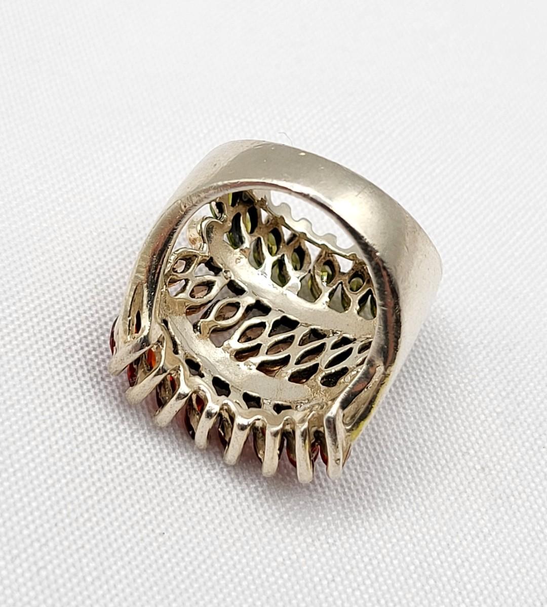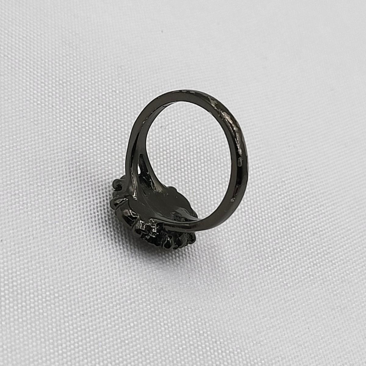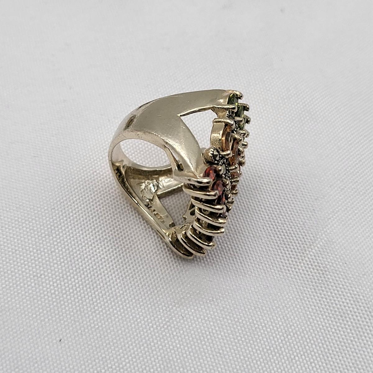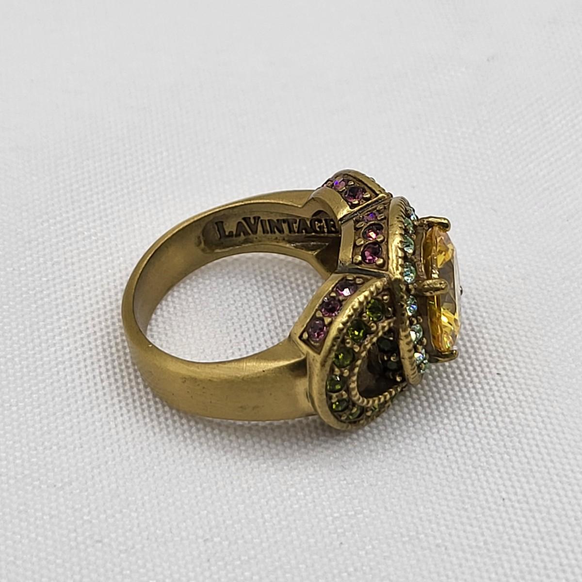 Huge eye catcher, five row CZ and Marcasite stones ring size 7. Wide split shank band, fully finished inside. One tiny marcasites is missing. Stamped 925 PK. LaVinage multi-color CZ stones matte finish gold tone, size 7. Black fashion ring with black and clear crystals, size 7.