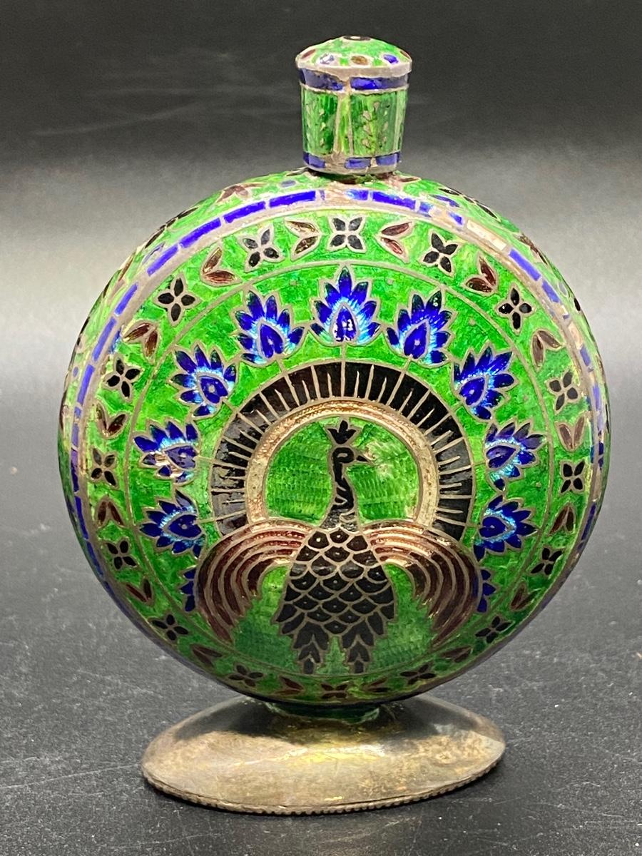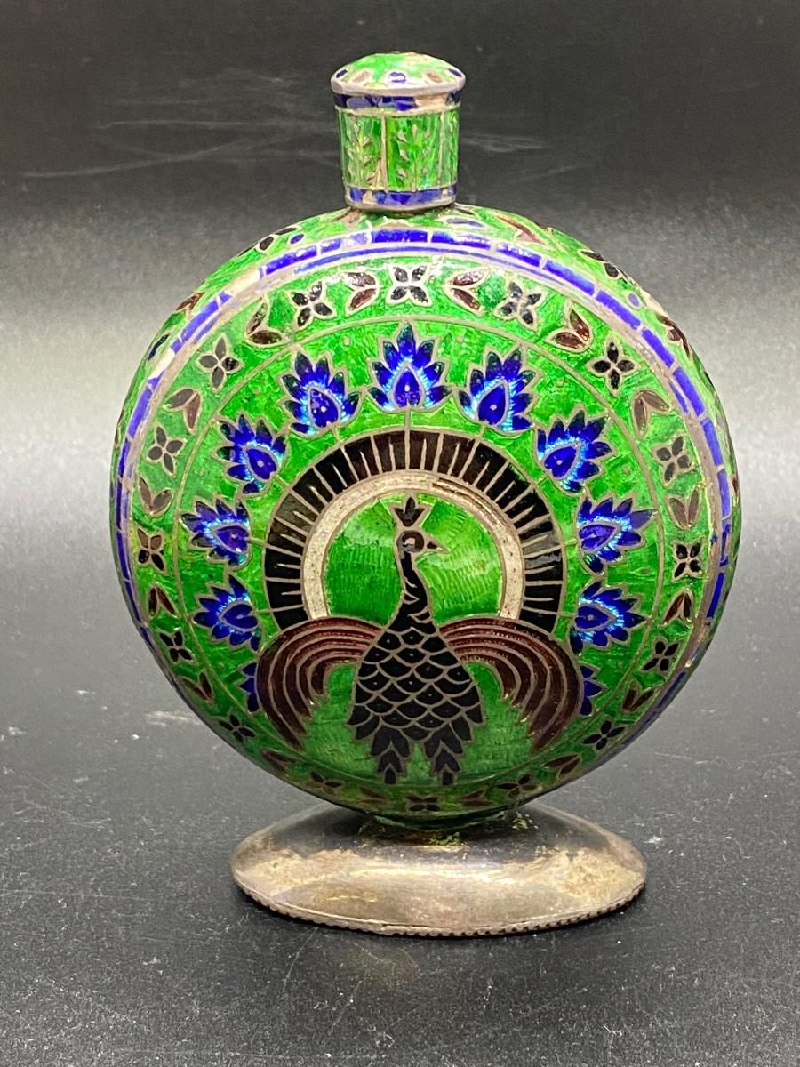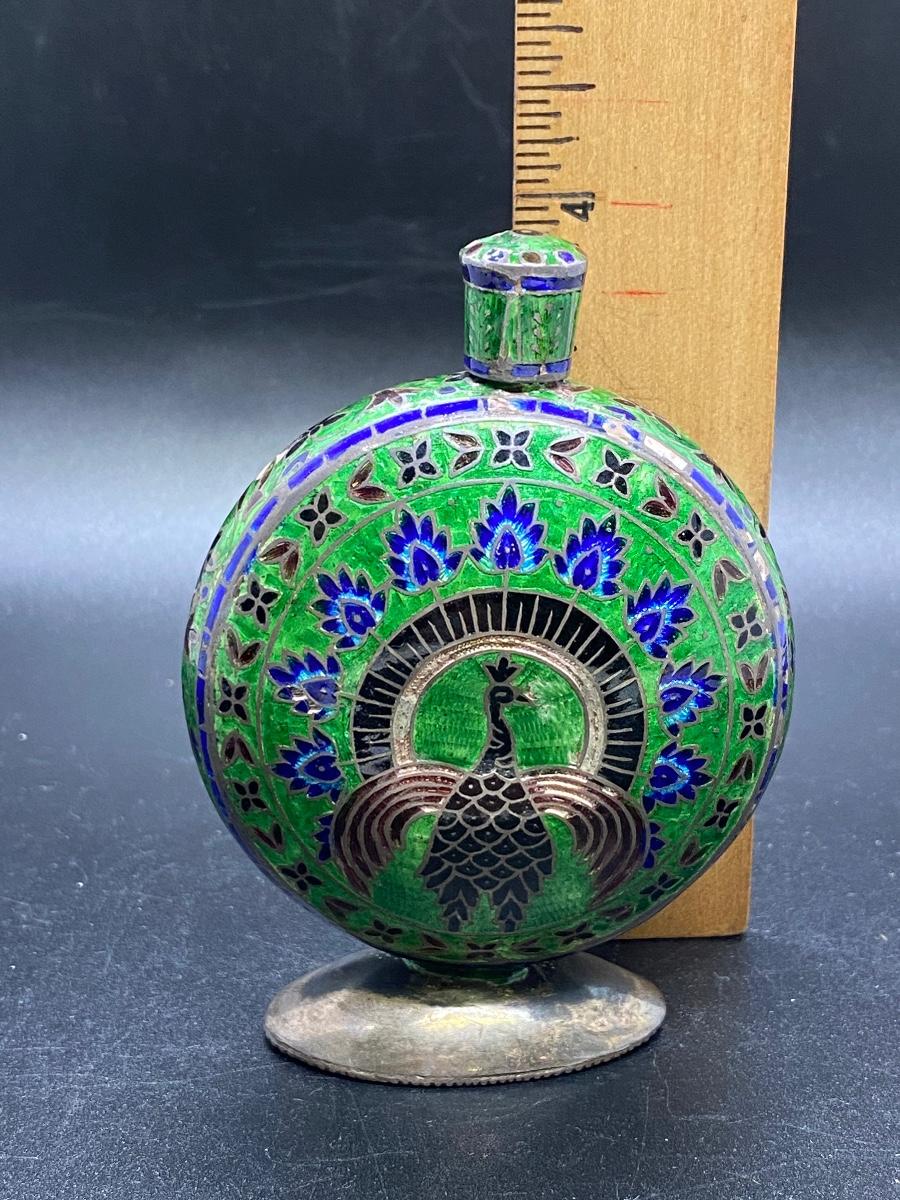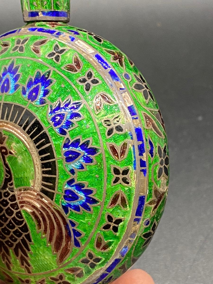 Colorful Blue Green Peacock Cloisonne Enameled Metal Perfume Snuff Bottle Flask