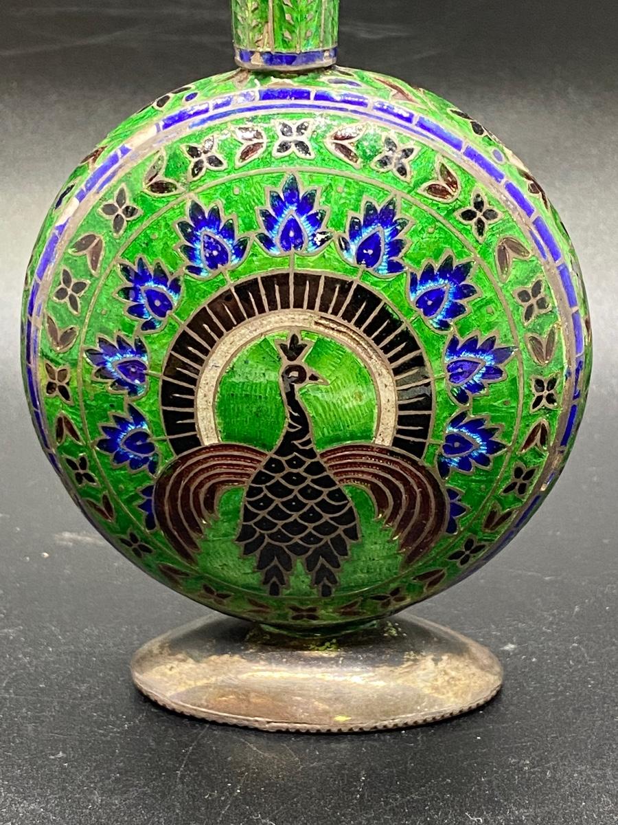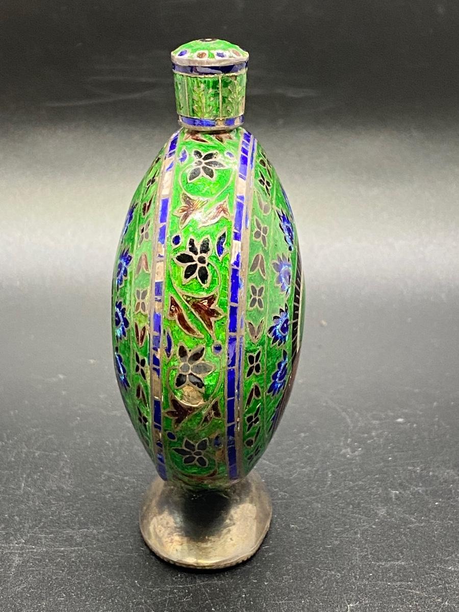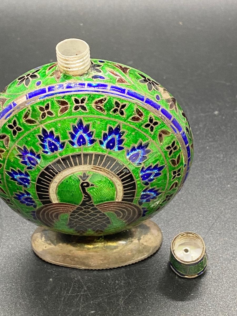 Vintage cloisonne perfume bottle. Bright blue and green design with a peacock on both sides. Screw top lid. There is some missing enamel pieces in the design and a dent on one side. Stands about 4".