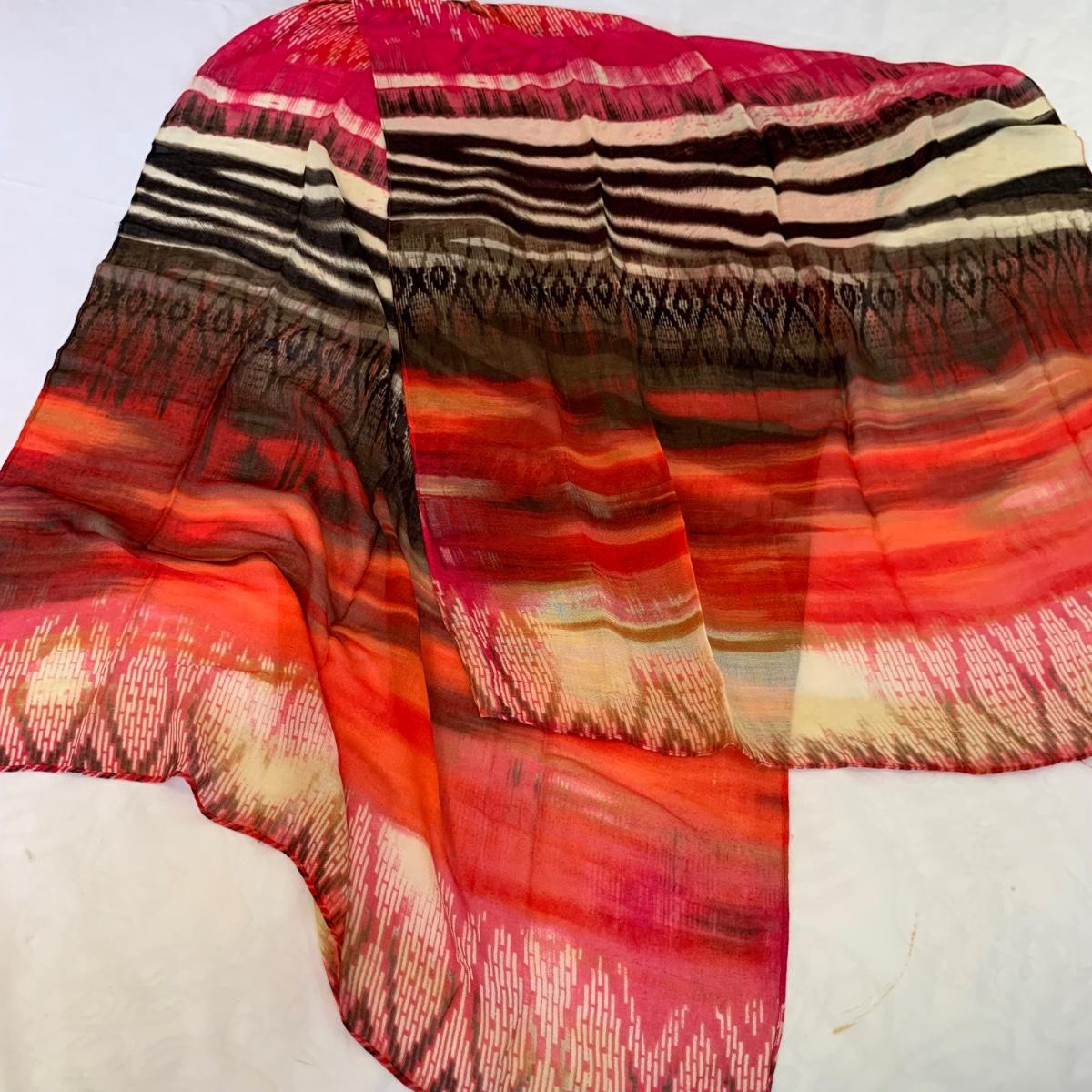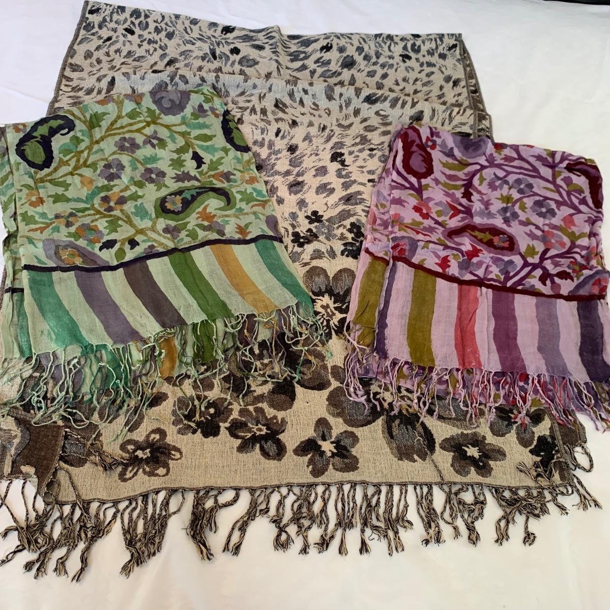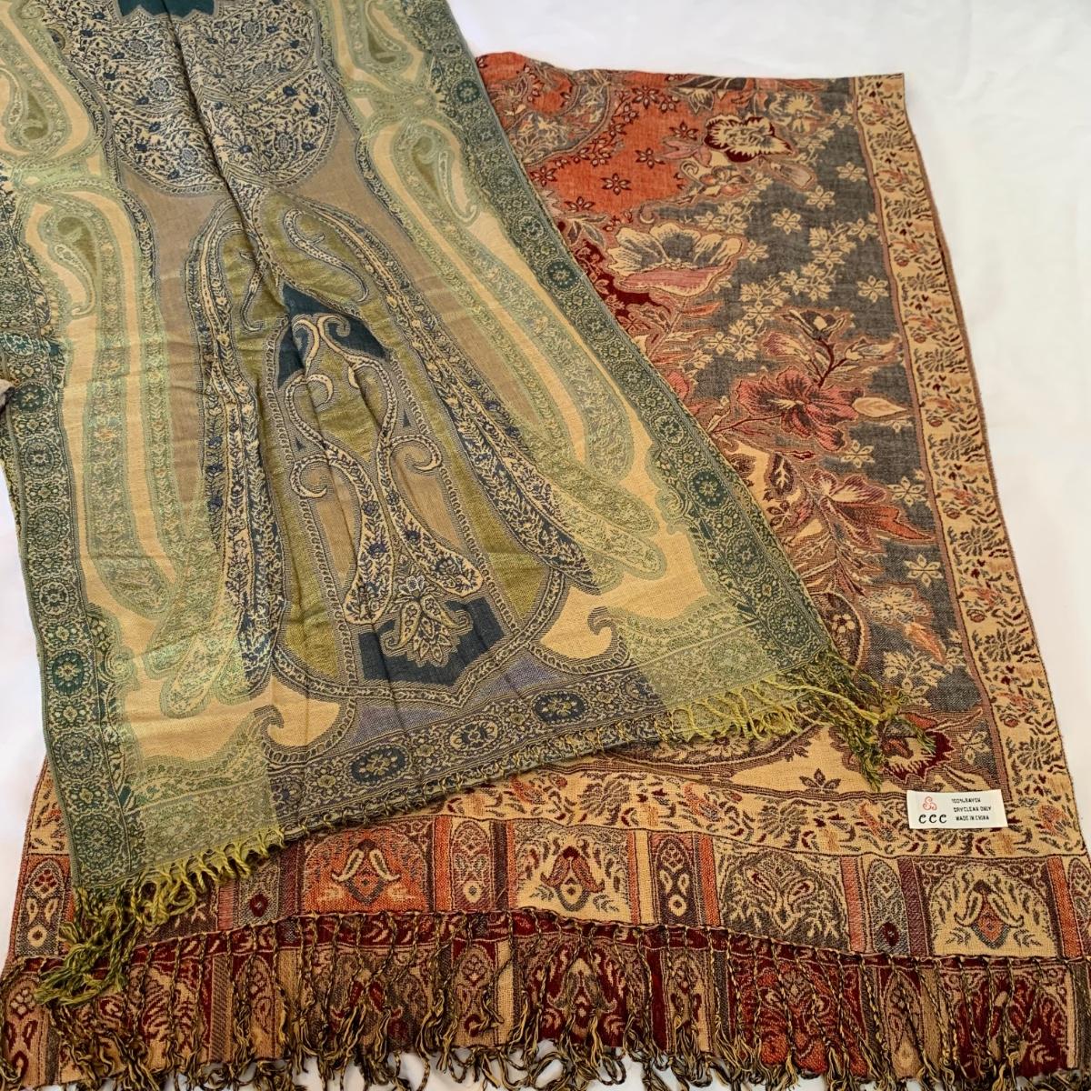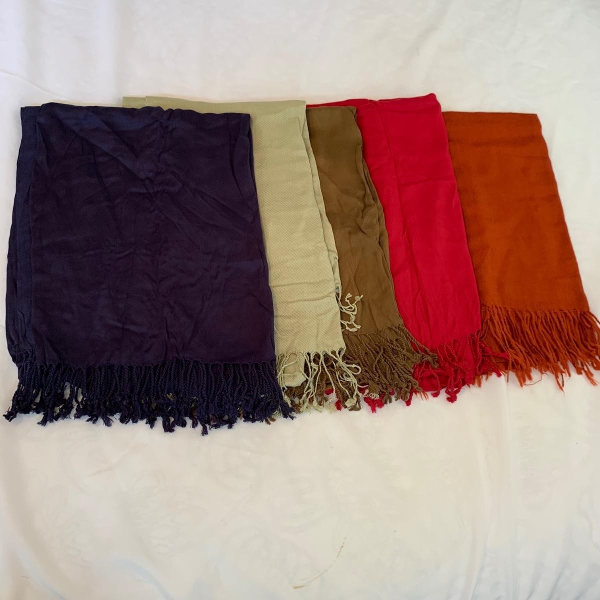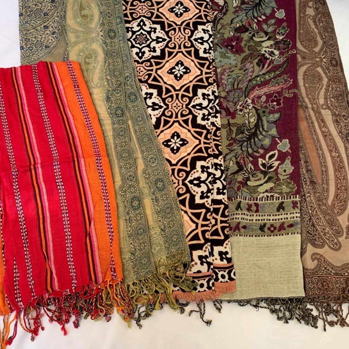 20+ gorgeous colorful scarves. Some with patterns, some plain. Most with fringe, a few without. Please see photos for inventory & details. The scarves come in various sizes.