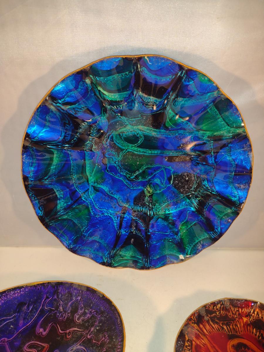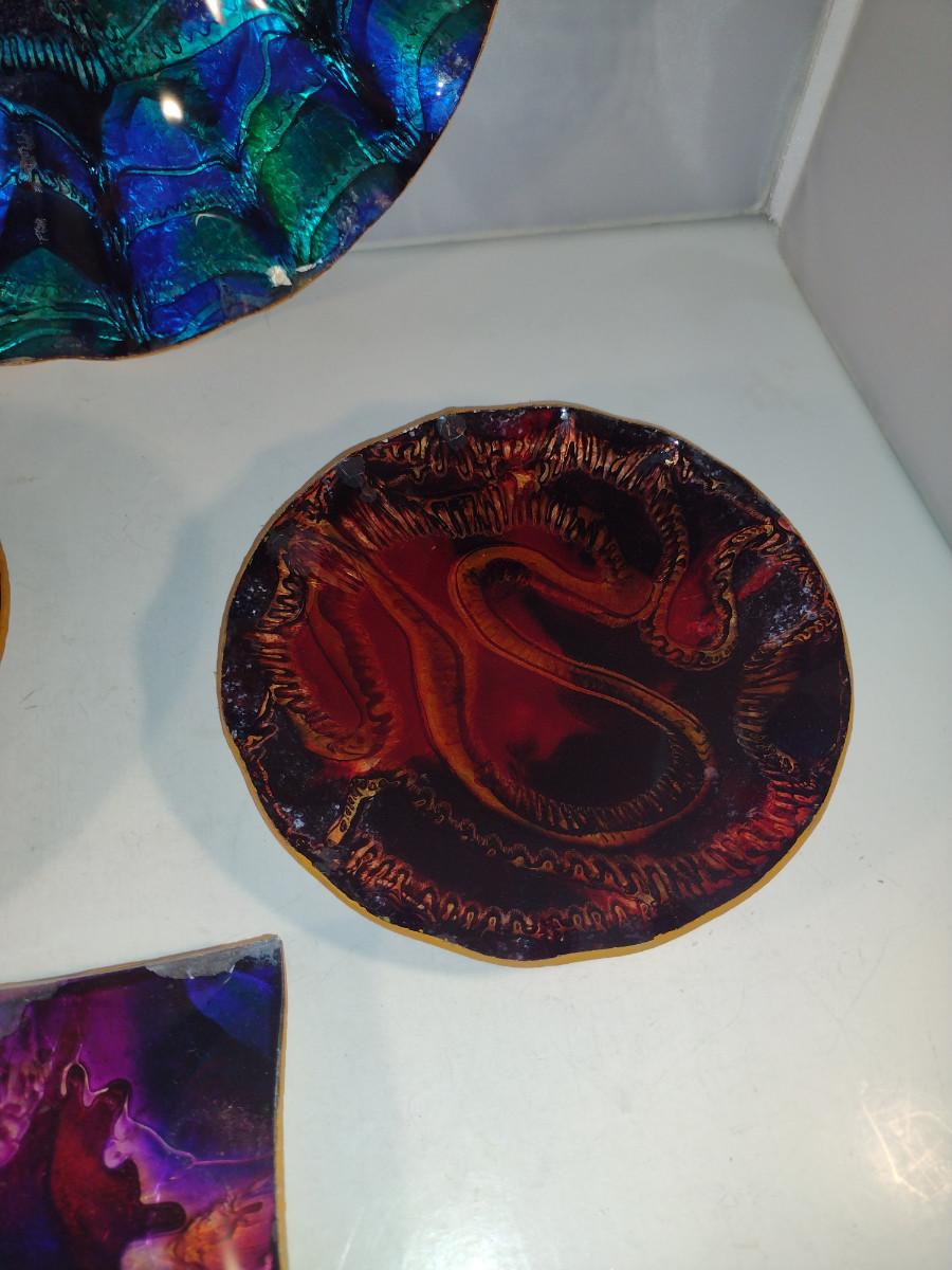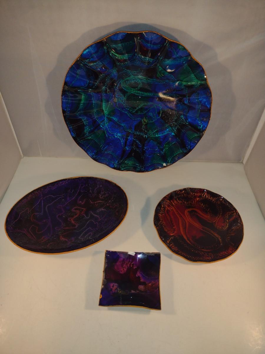 Colorful Bowls and Plates for Wall Hanging. Items (especially small, square one) have some de-lamination/chipping.