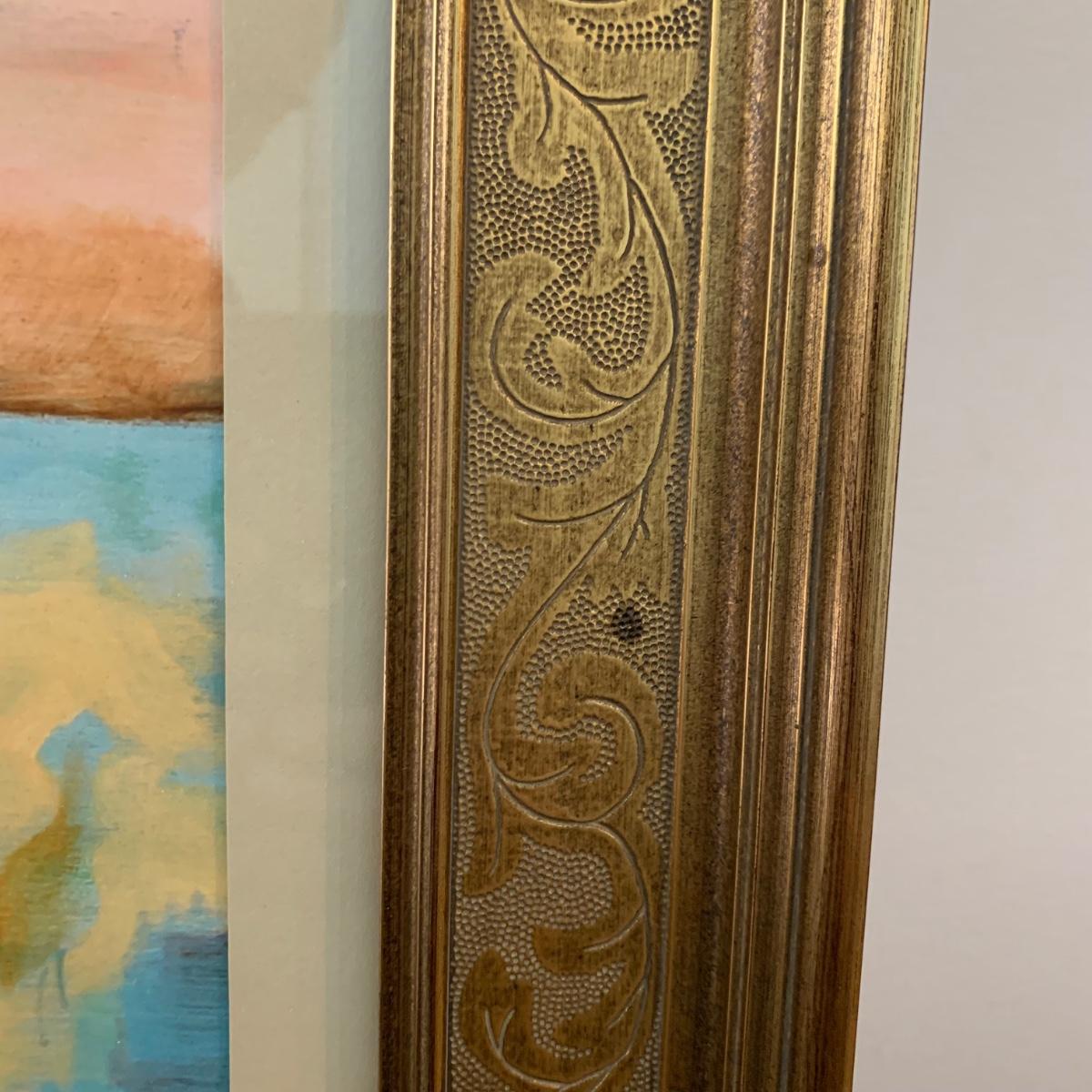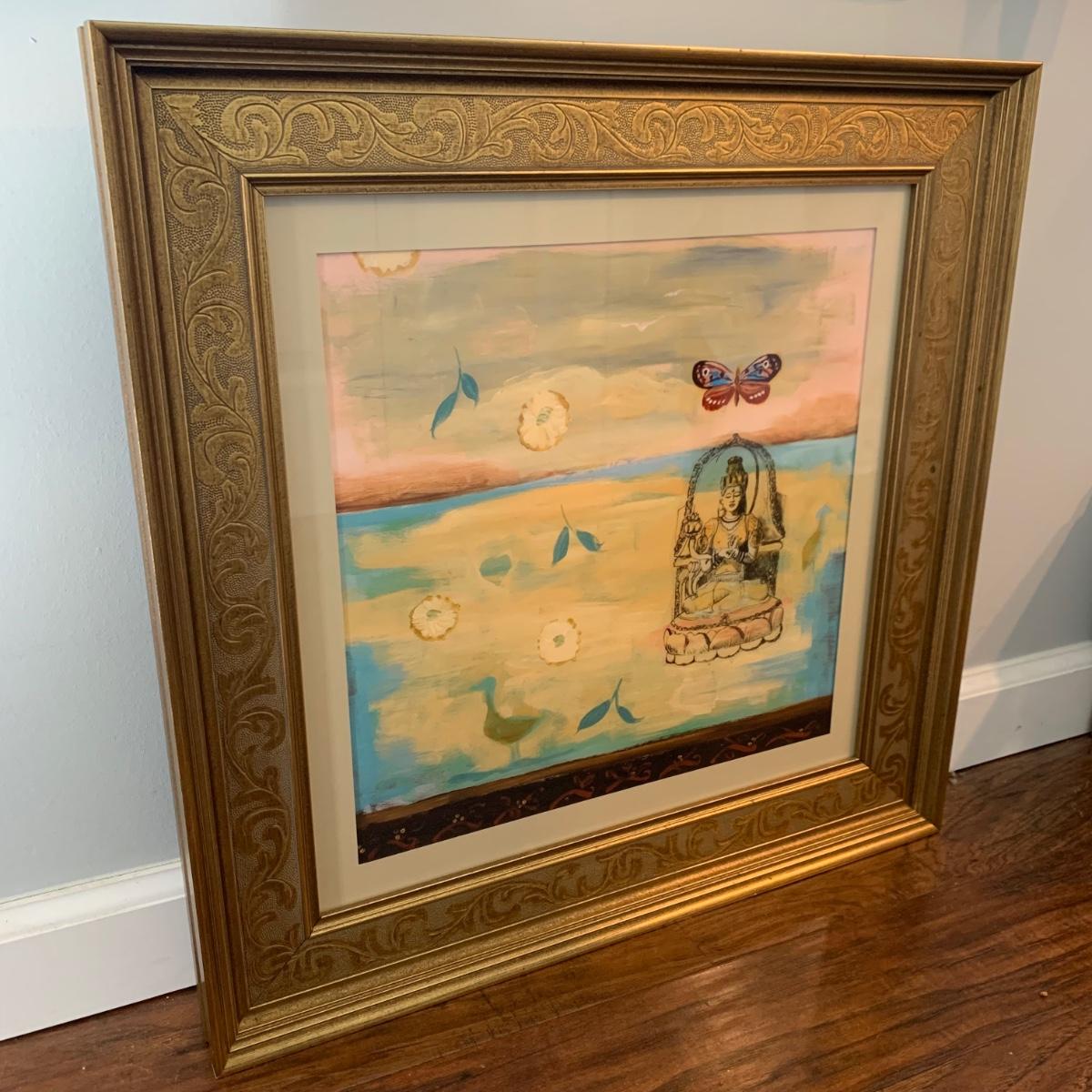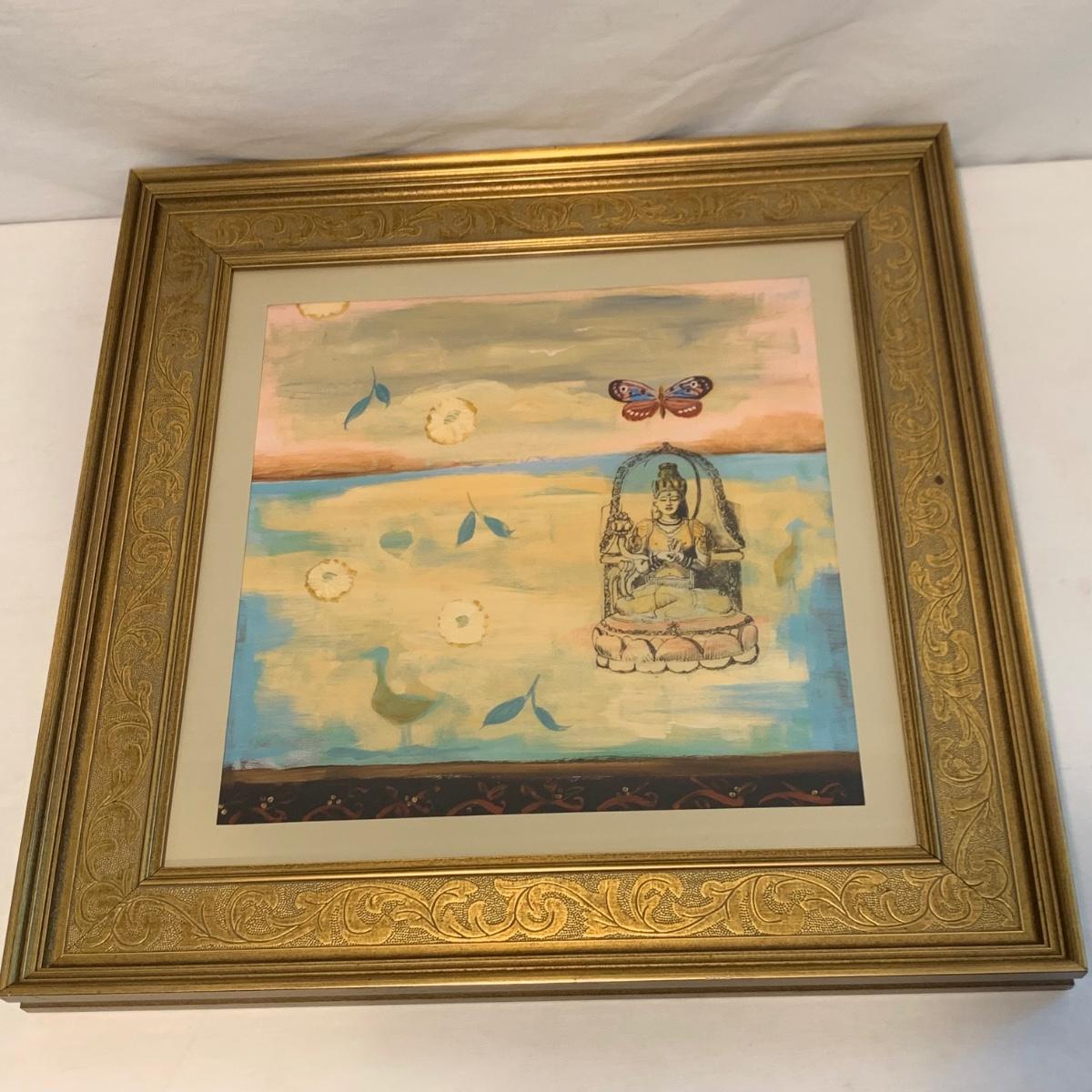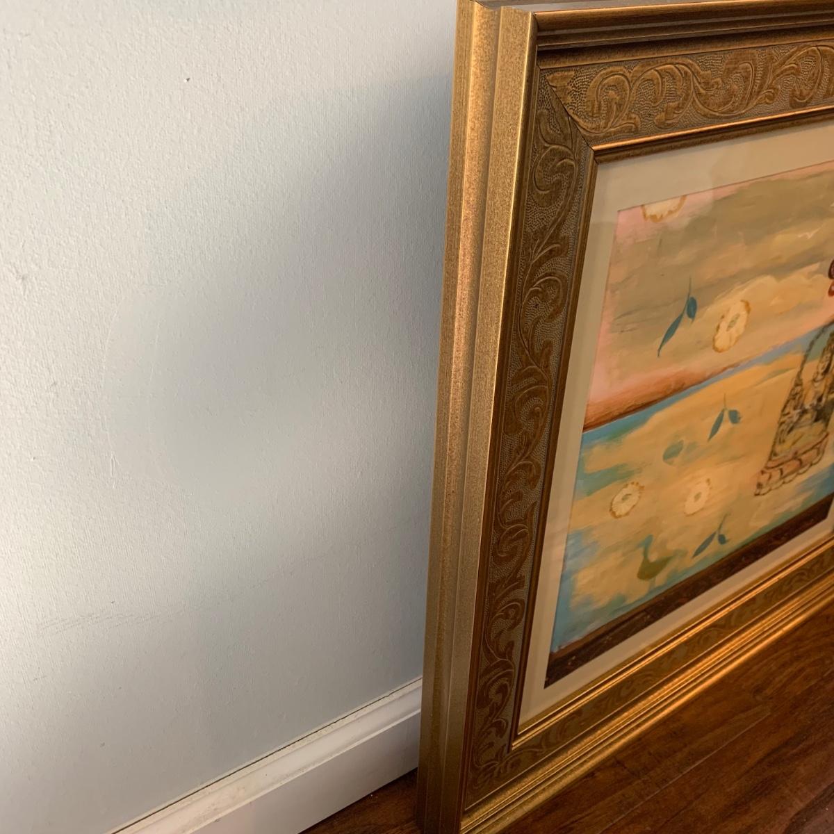 Art that appears to be a print of a painting. It has a light tan colored mat and an ornate frame that seems like it is wood covered with a smooth metallic gold coating. Frame measures 21.25” sq. A few small blemishes are seen on the frame; see photos.