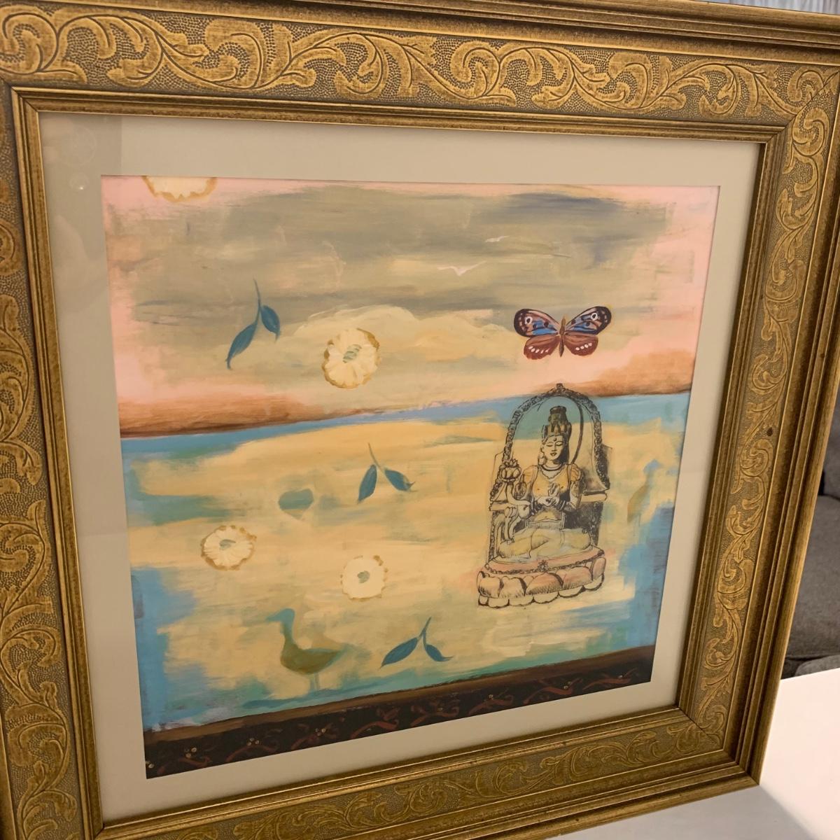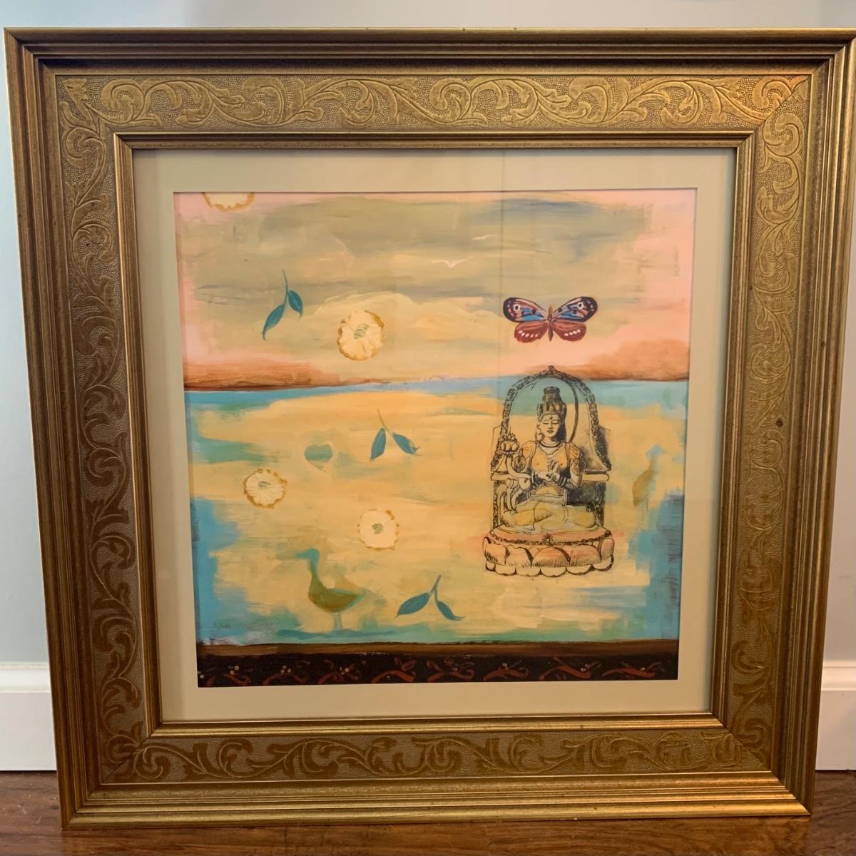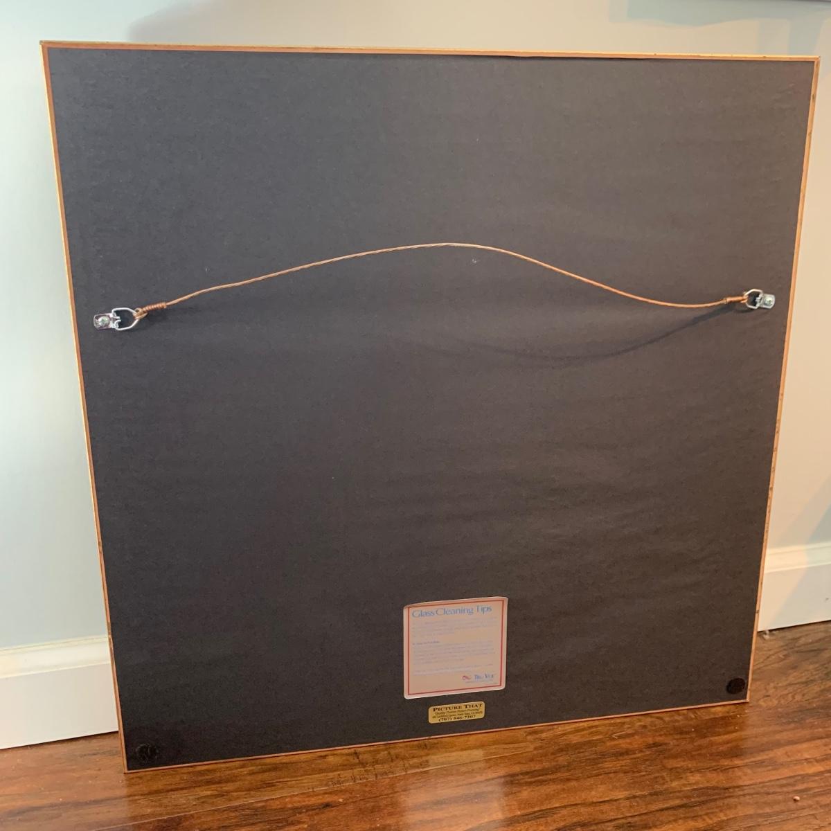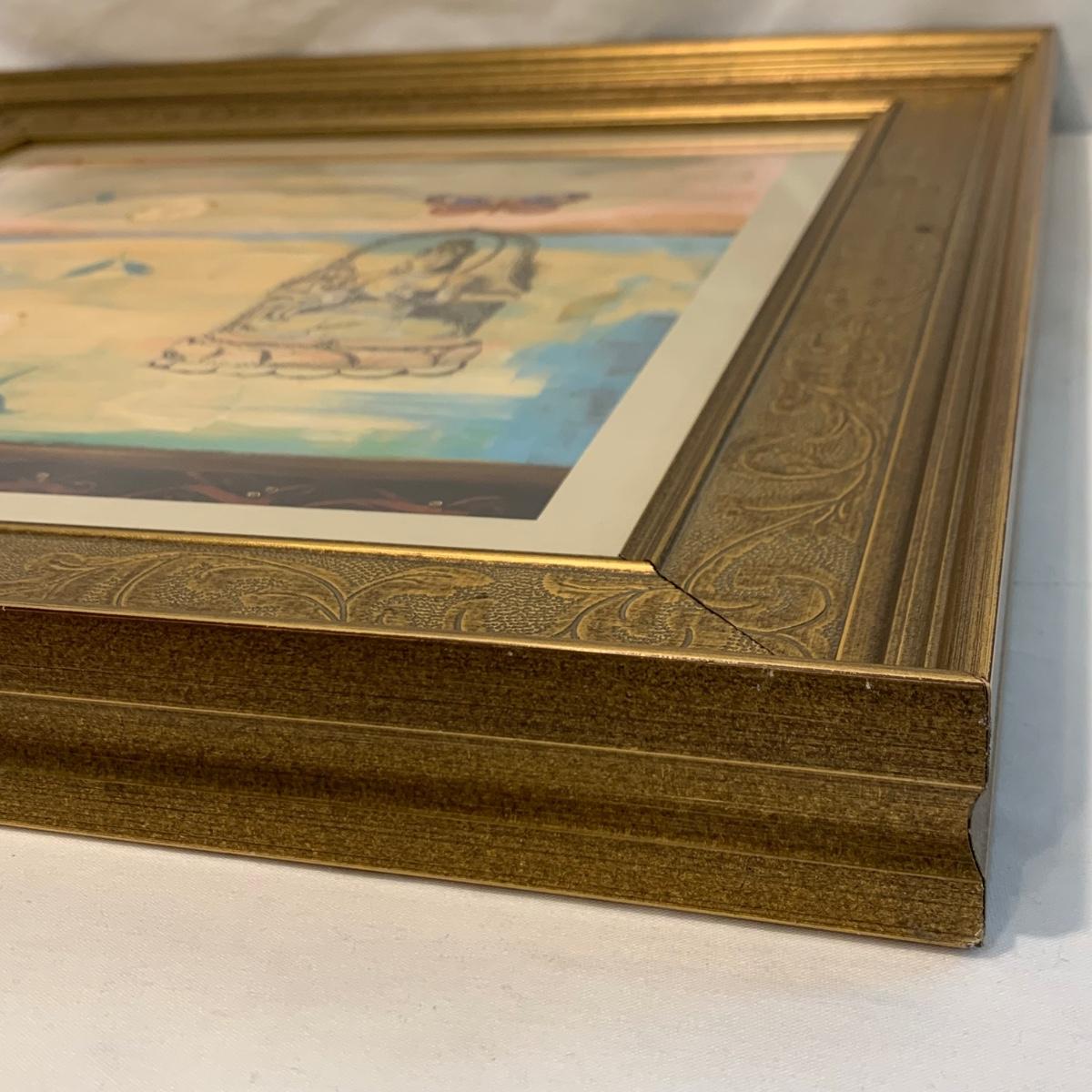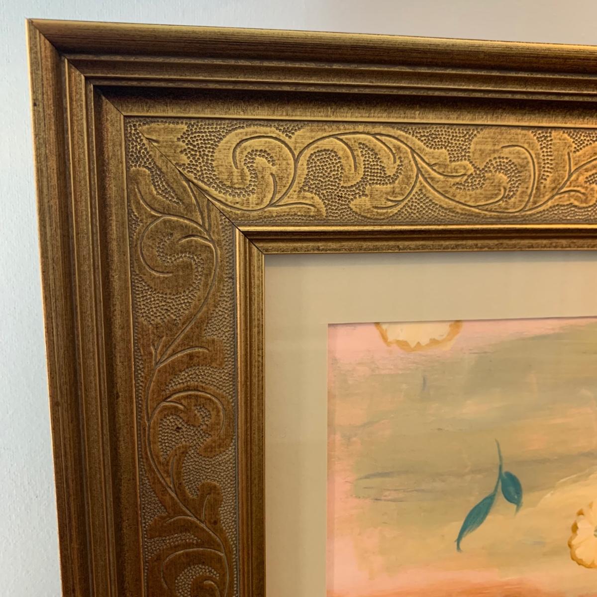 Art that appears to be a print of a painting. It has a light tan colored mat and an ornate frame that seems like it is wood covered with a smooth metallic gold coating. Frame measures 21.25” sq. A few small blemishes are seen on the frame; see photos.