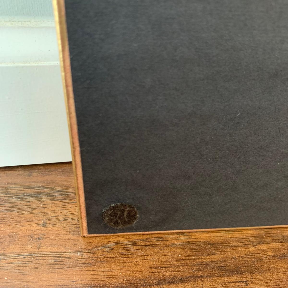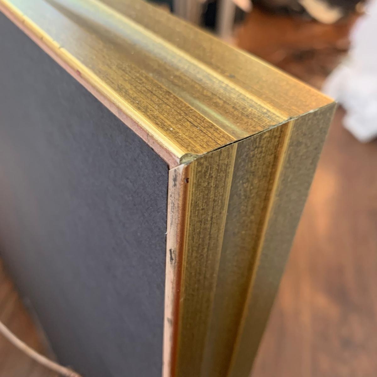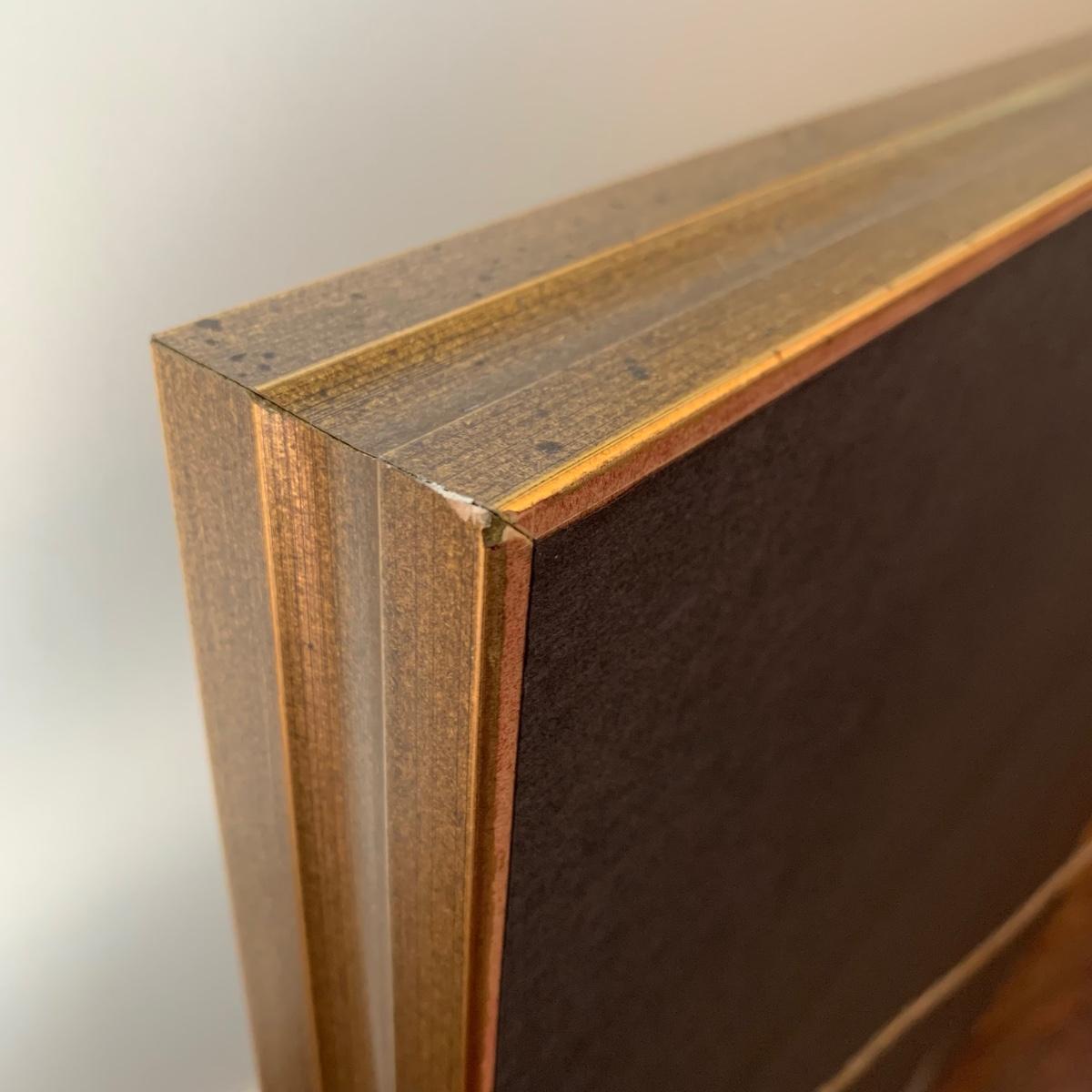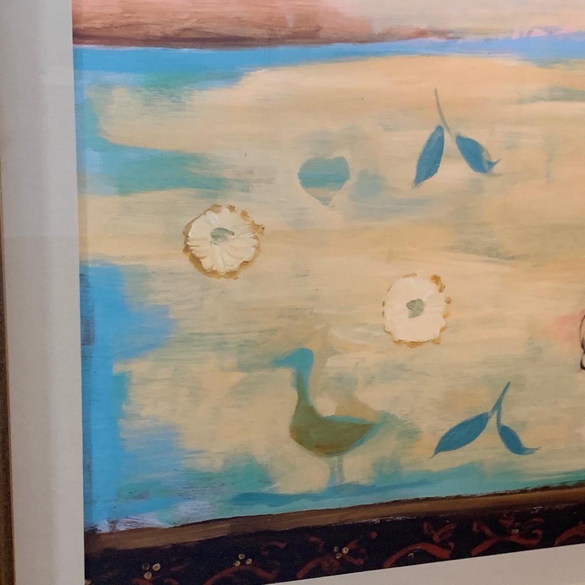 Art that appears to be a print of a painting. It has a light tan colored mat and an ornate frame that seems like it is wood covered with a smooth metallic gold coating. Frame measures 21.25” sq. A few small blemishes are seen on the frame; see photos.