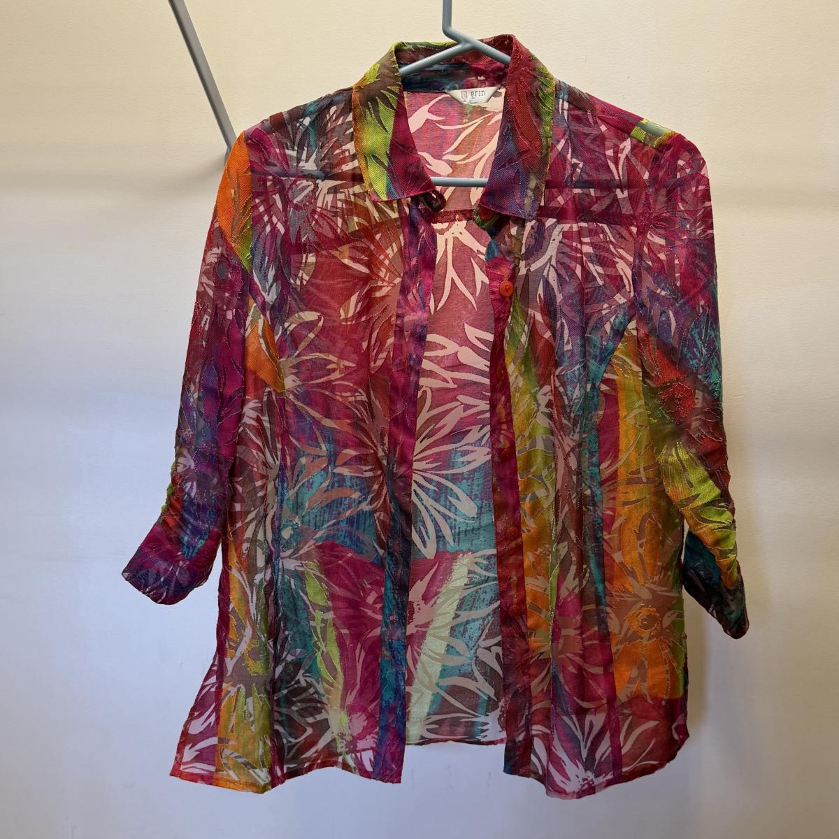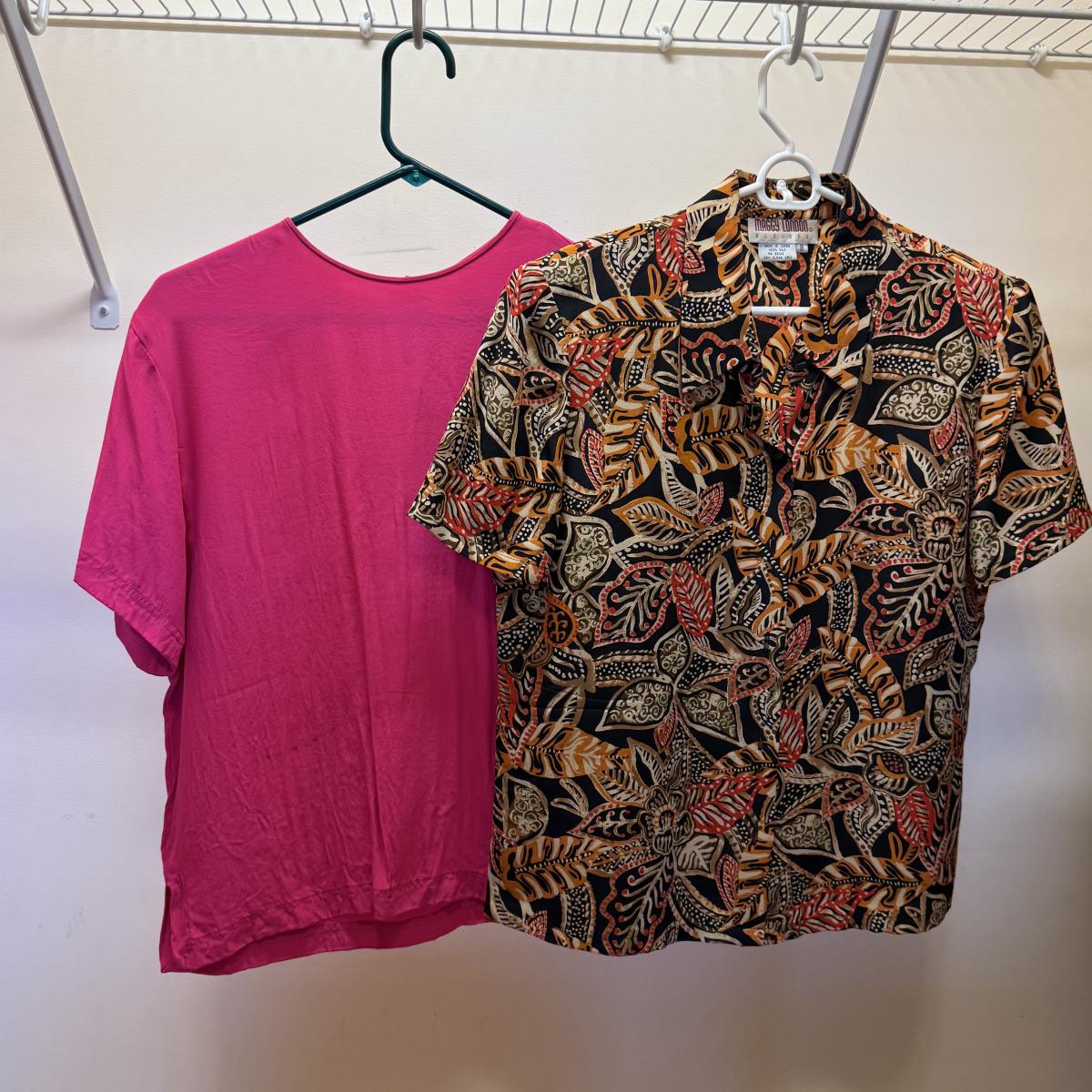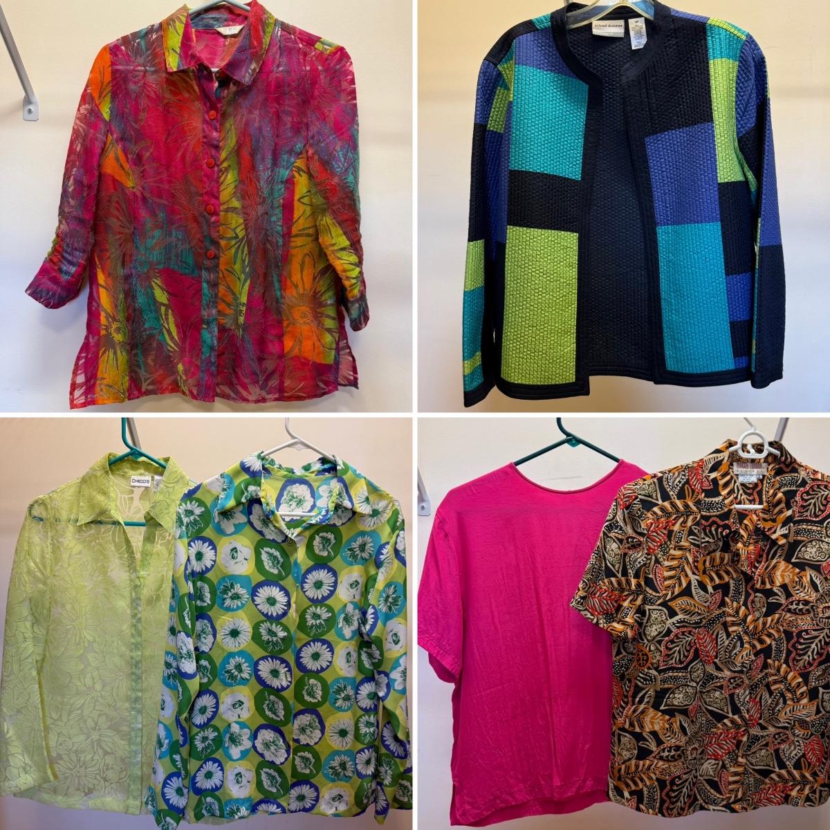 30+ tops of various sizes. Sleeveless, short sleeve, long sleeve, lots of button-ups, and some fun jackets and sweaters. A few luxurious silk items! Please see photos for inventory and details.