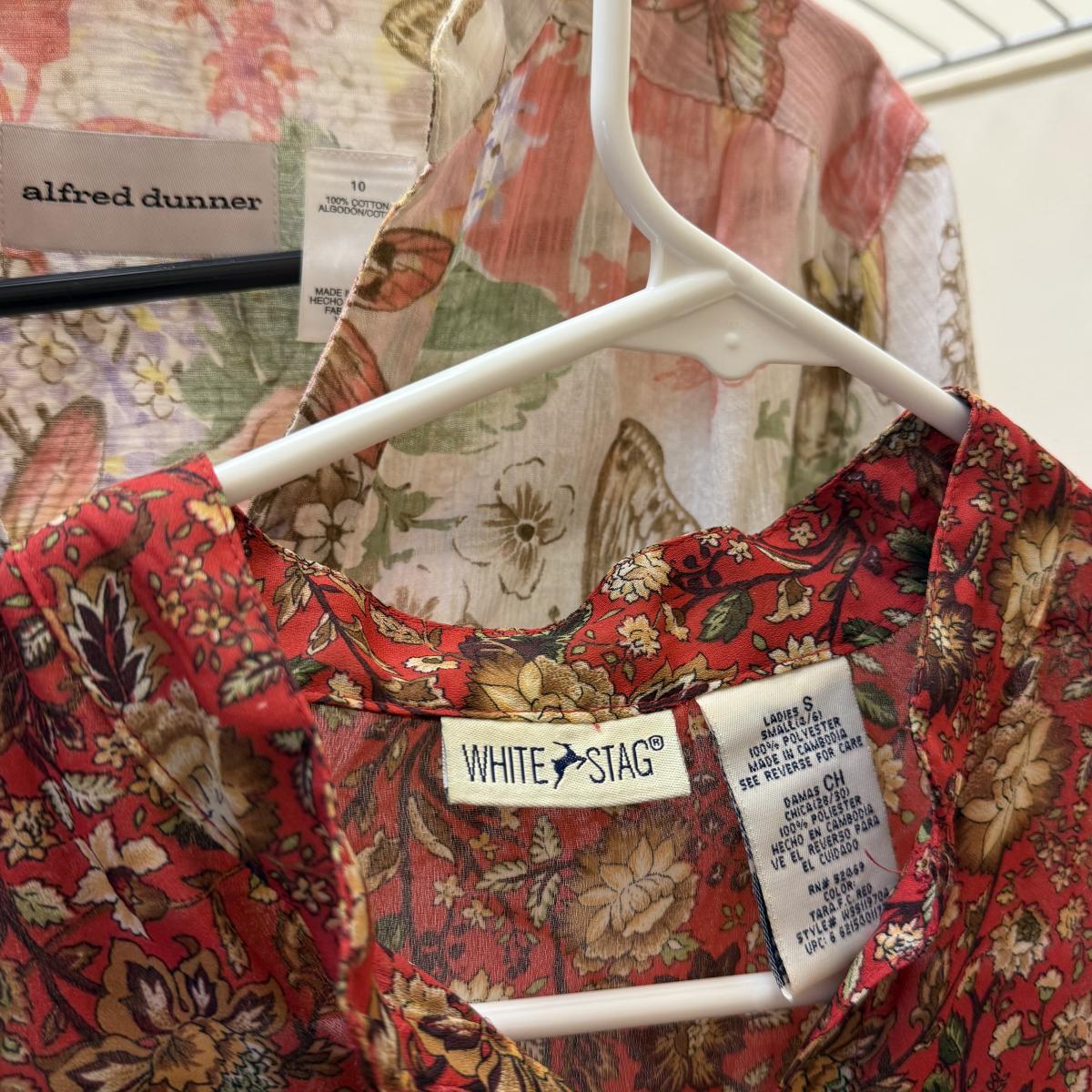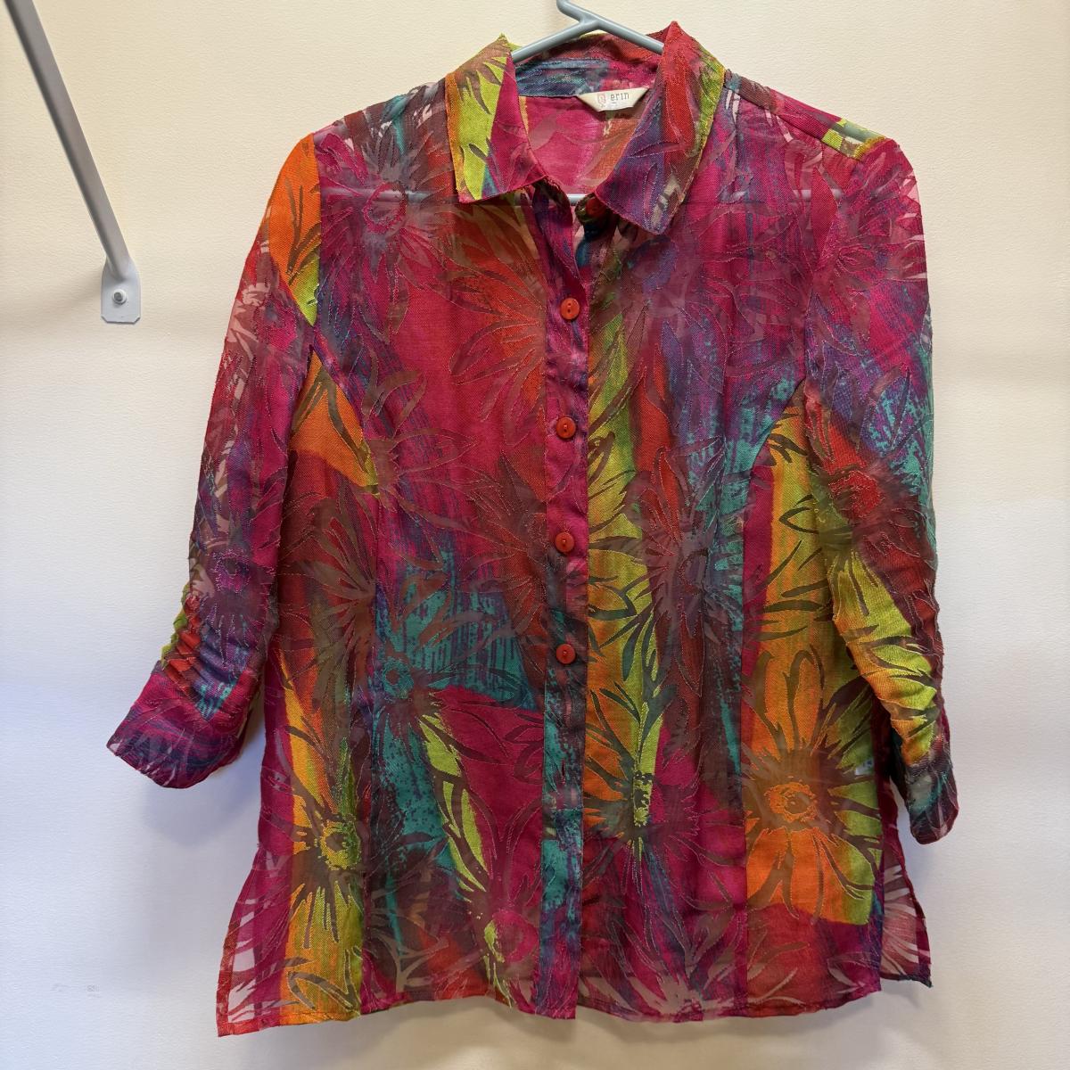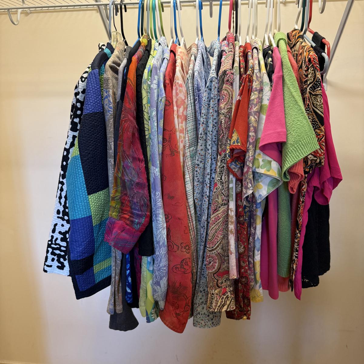 30+ tops of various sizes. Sleeveless, short sleeve, long sleeve, lots of button-ups, and some fun jackets and sweaters. A few luxurious silk items! Please see photos for inventory and details.