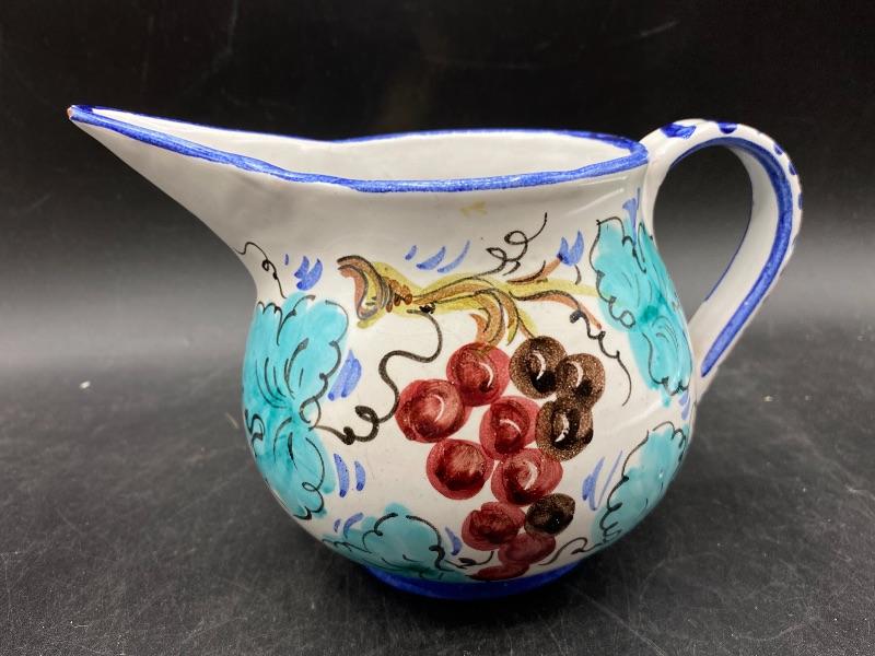 Italian ceramic small pitcher. Painted grapevine pattern. Small with long spout, only stands about 4". There is a chip in the tip of spout. Marked on the bottom.