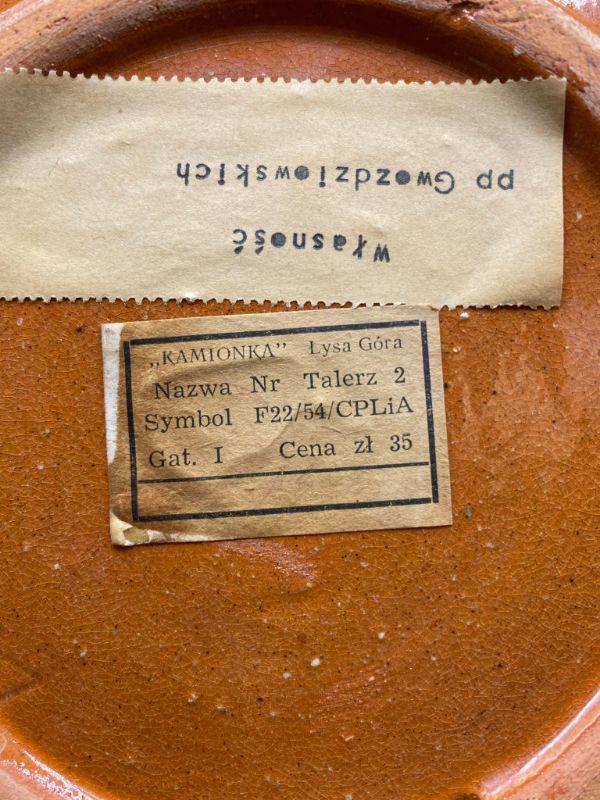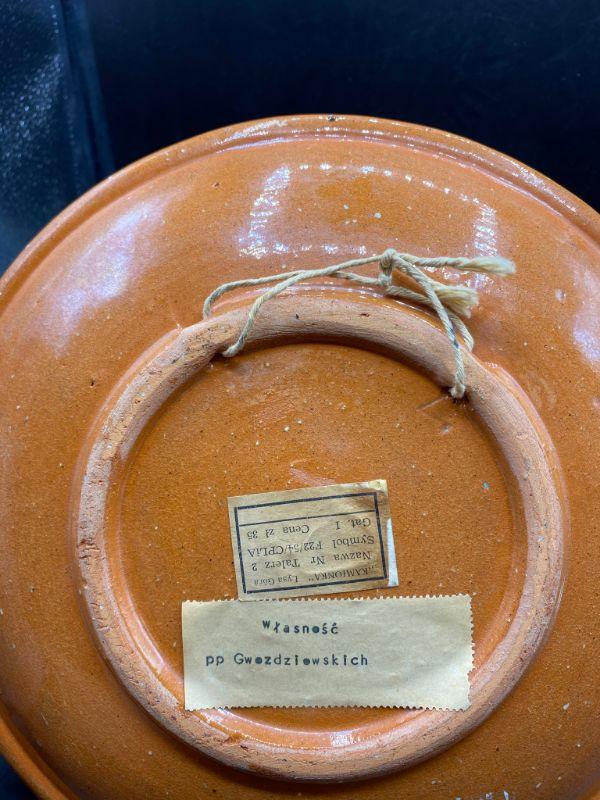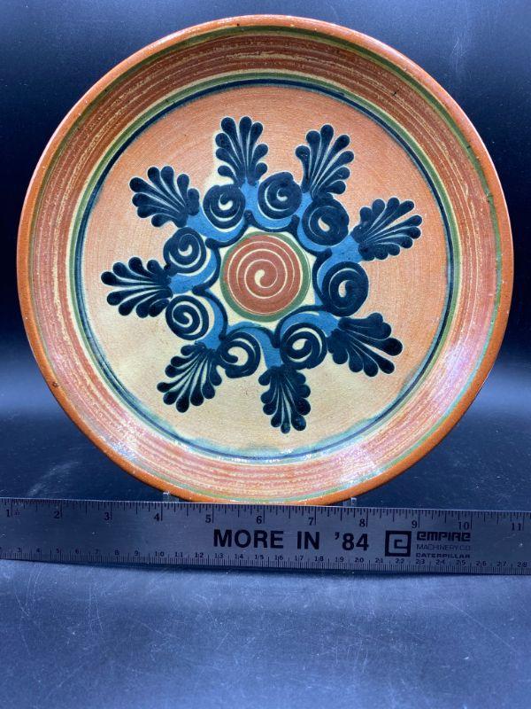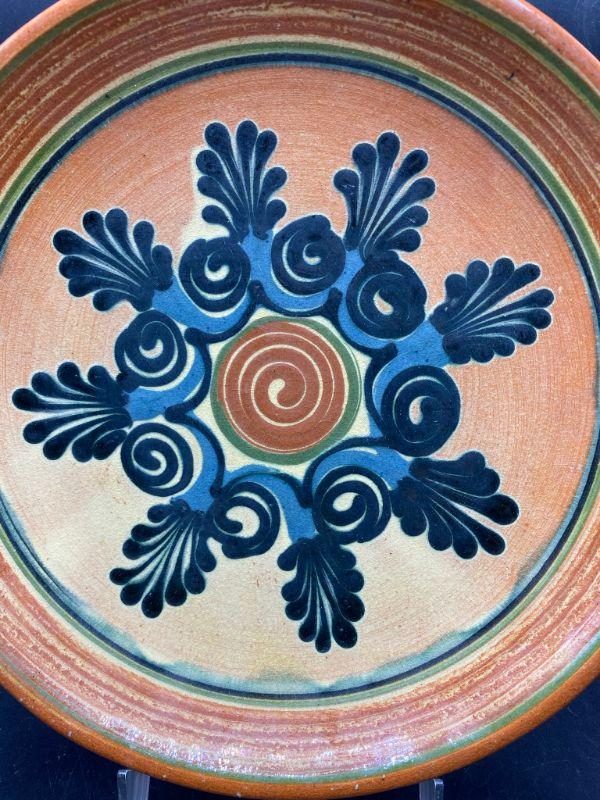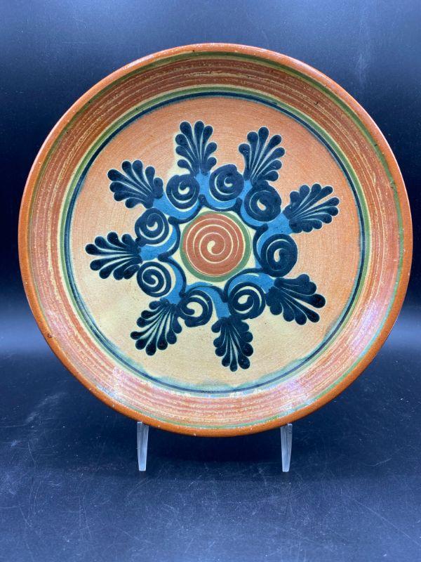 Beautiful clay pottery plate from Poland. Can be hung on a wall. Bright blue design. About 10" size.