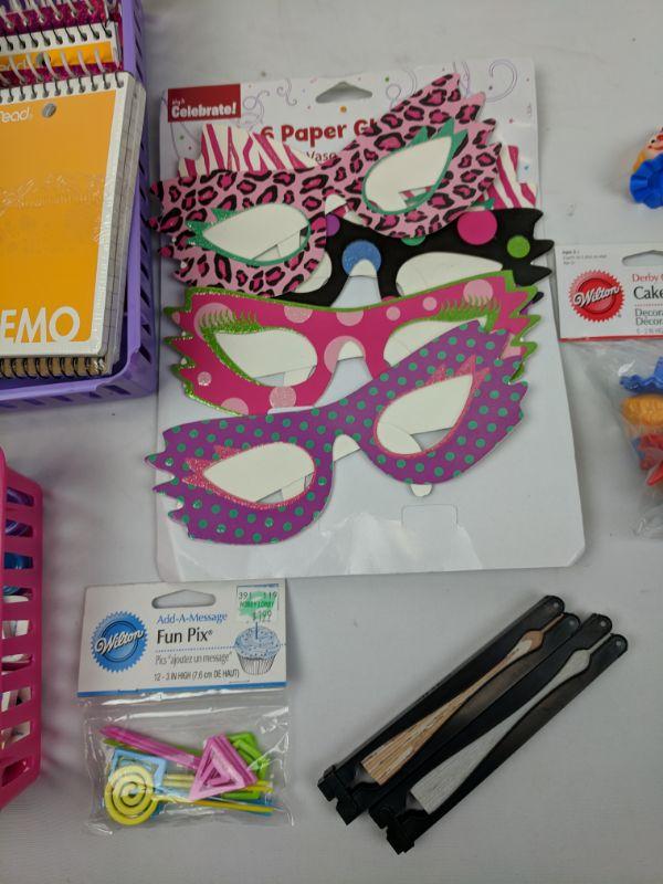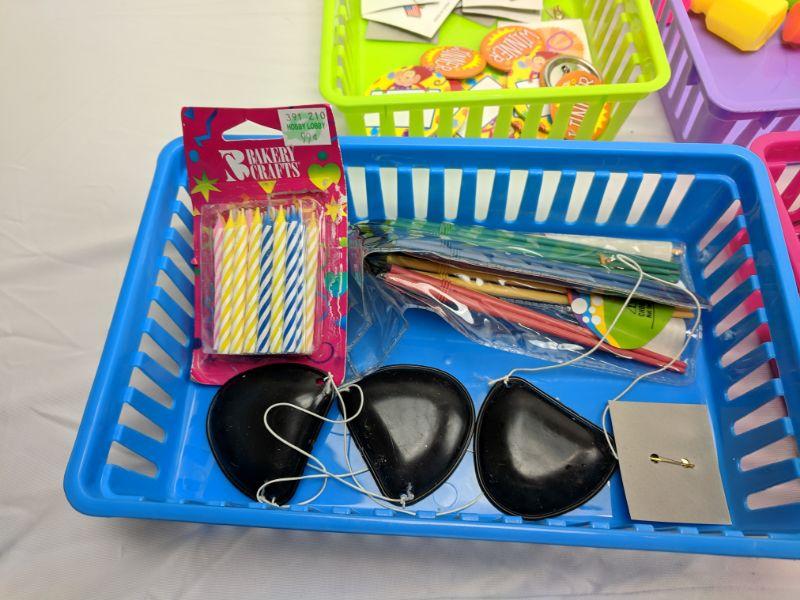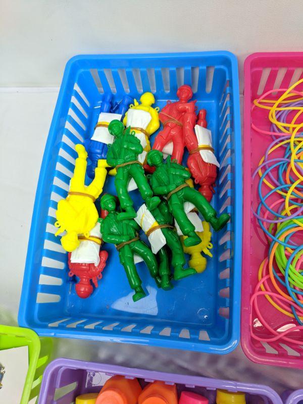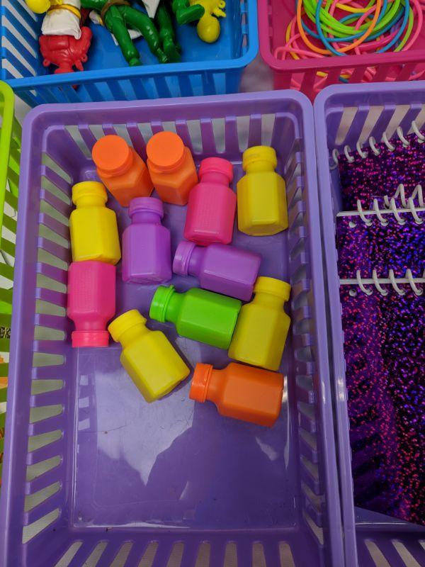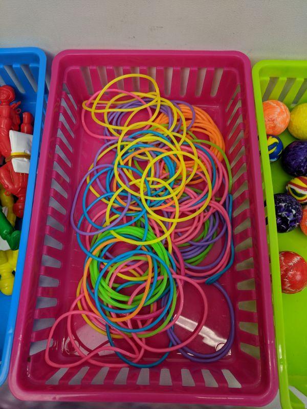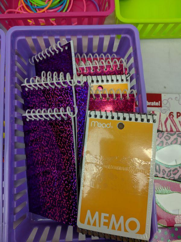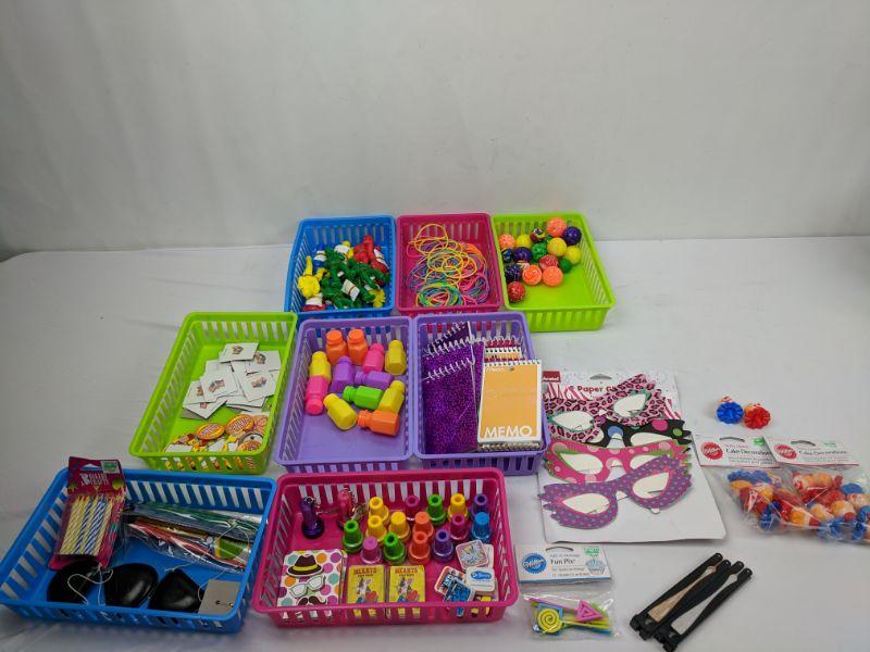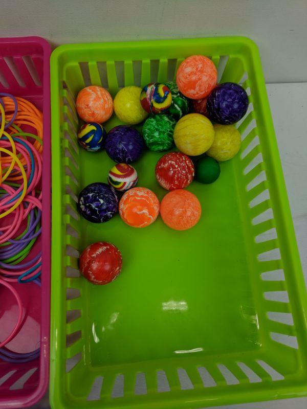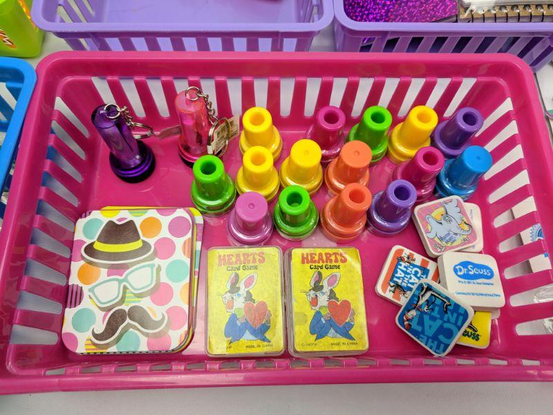 Colorful Containers of Game Prizes/Party Favors, Notepads, Bouncy Balls, Etc.