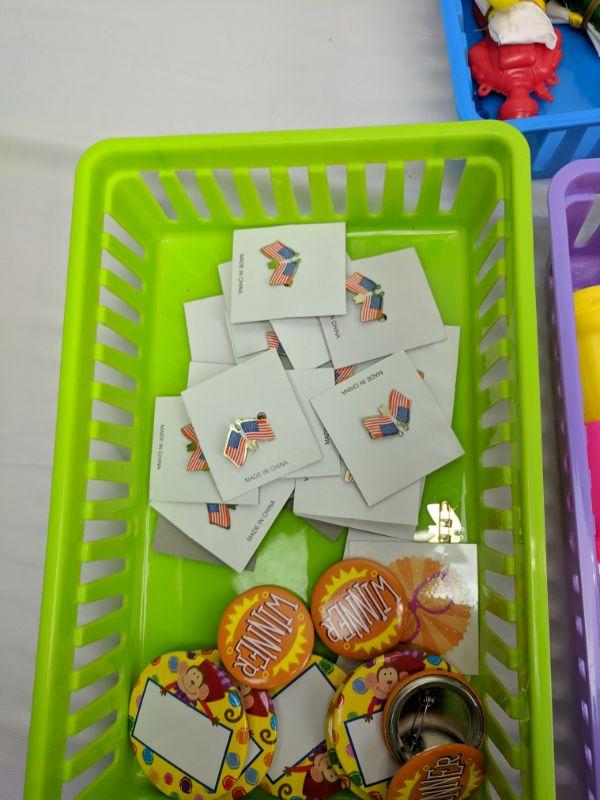 Colorful Containers of Game Prizes/Party Favors, Includes: Notepads, Bouncy Balls, Stamps, Pins, Etc.