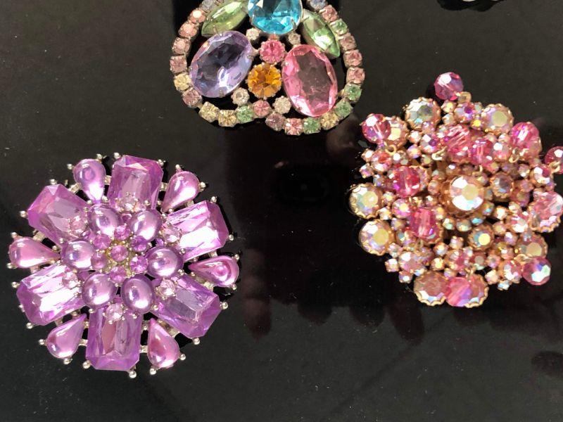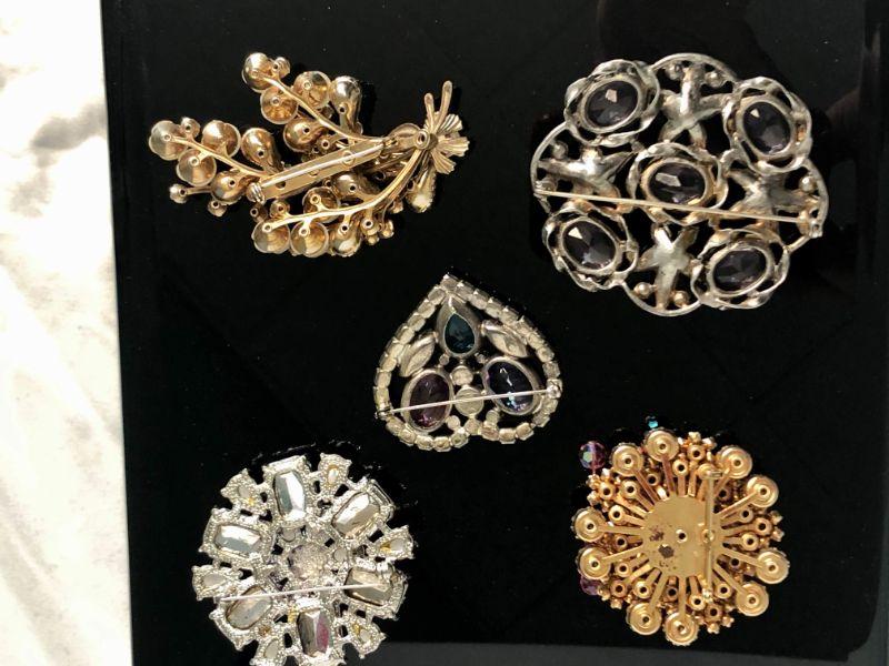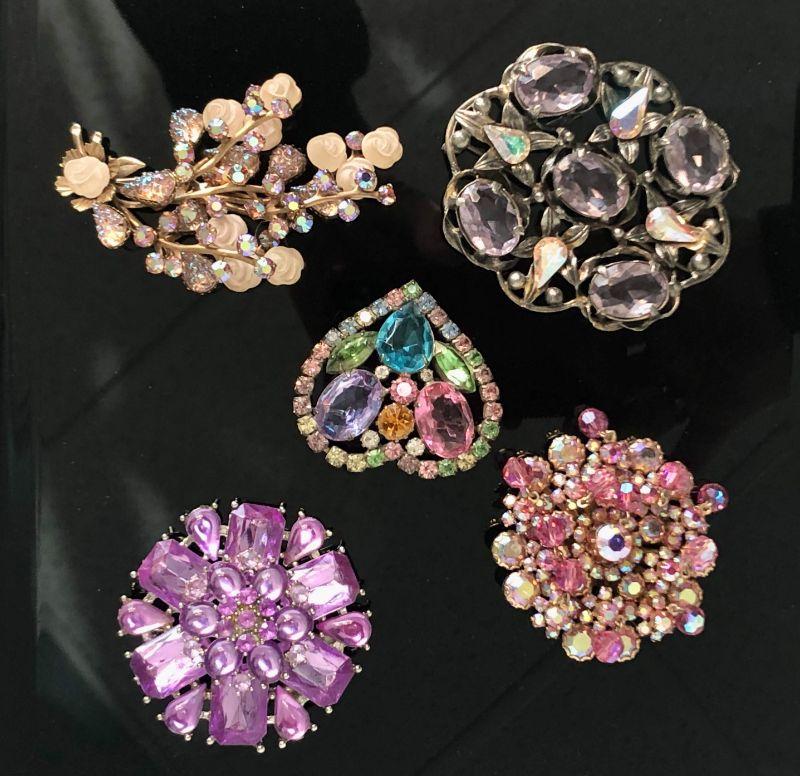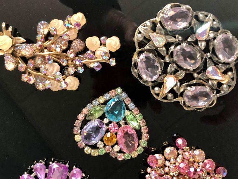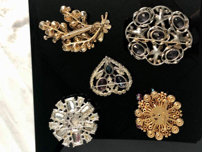 Lot of 5 Costume Jewelry Brooches. Colorful, each one different from the other. All are unsigned. 3" size and smaller.