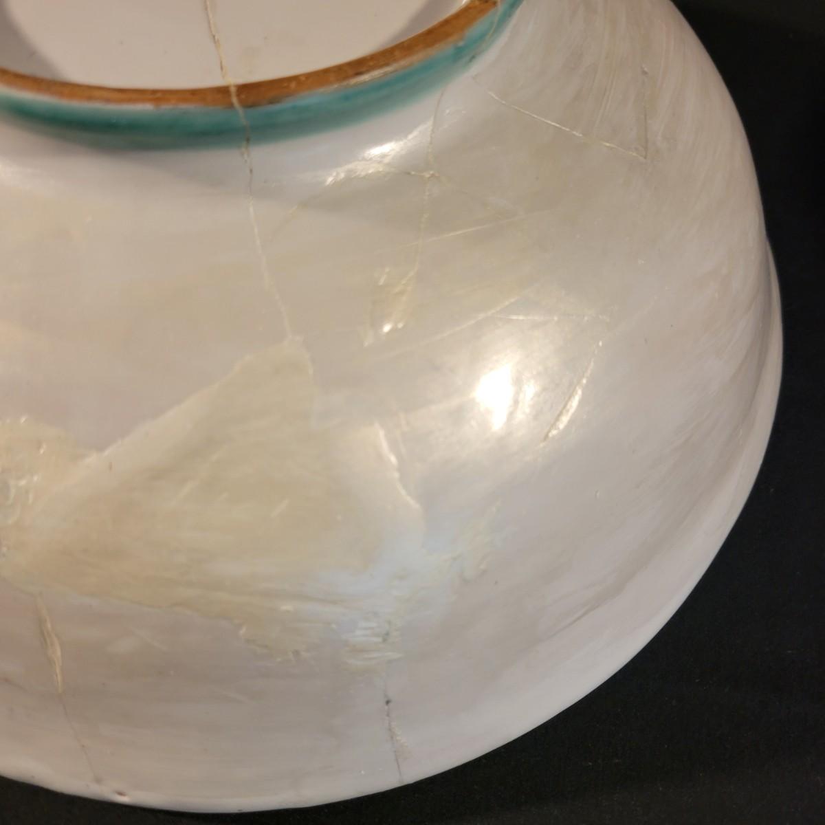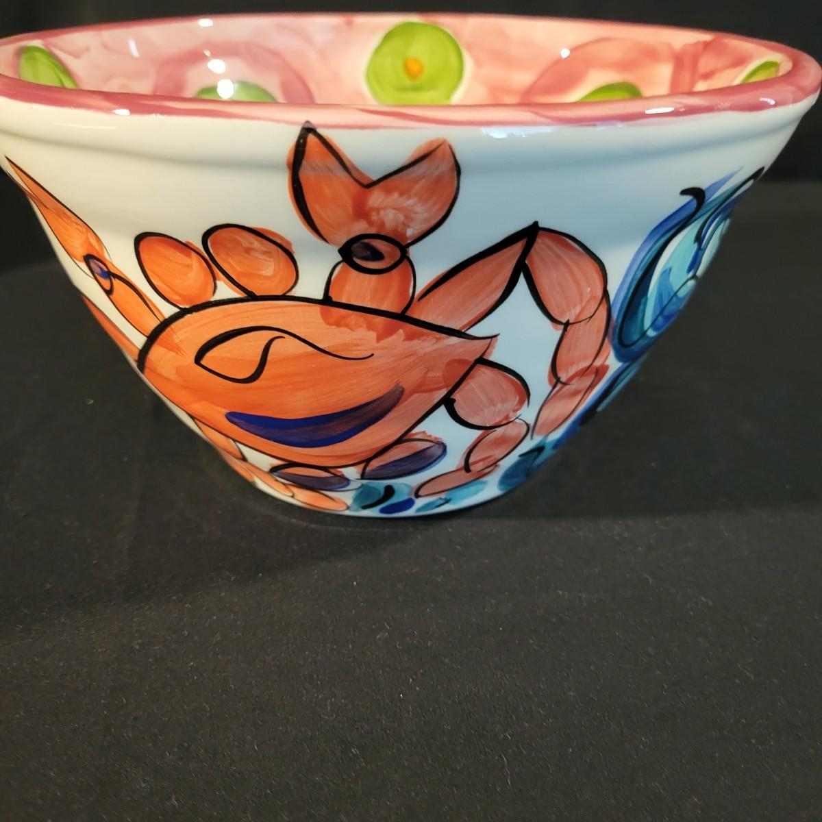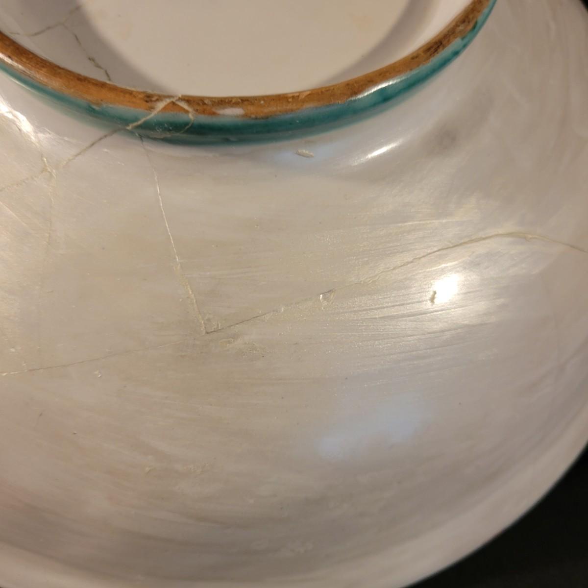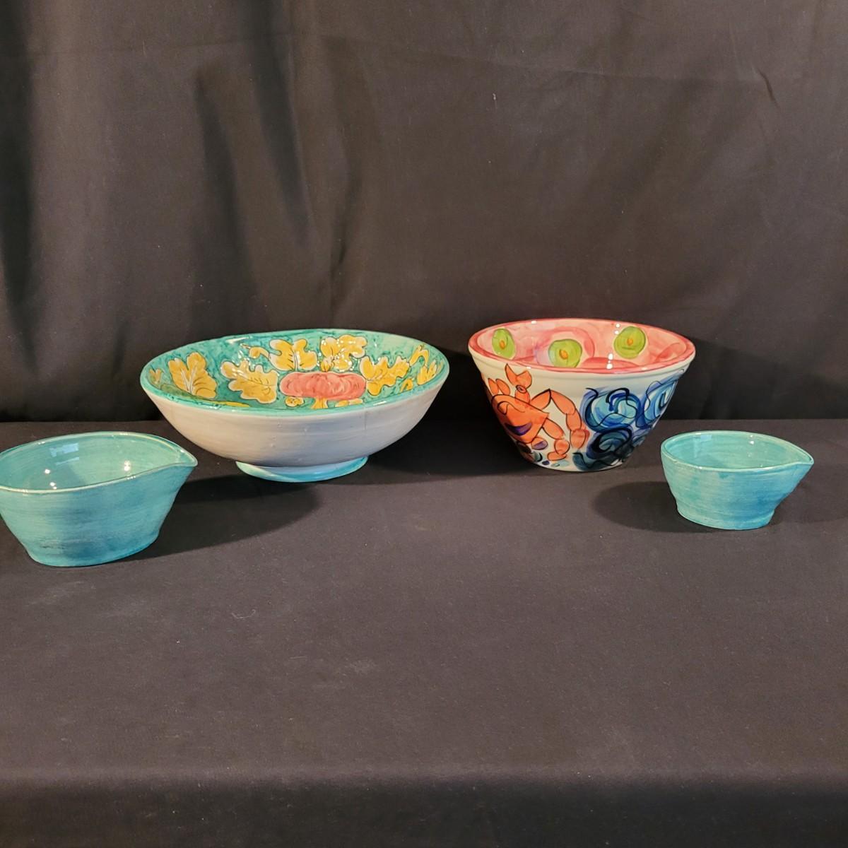 A collection of two large ceramic bowls and two smaller pieces of signed pottery. The two smaller bowls are in excellent condition and are signed and dated pieces. The bowl with the crab does have a small chip and the largest piece was broken into multiple pieces and repaired. See attached pictures for more details. Largest bowl measures approximately 12" x 4" Shipping available