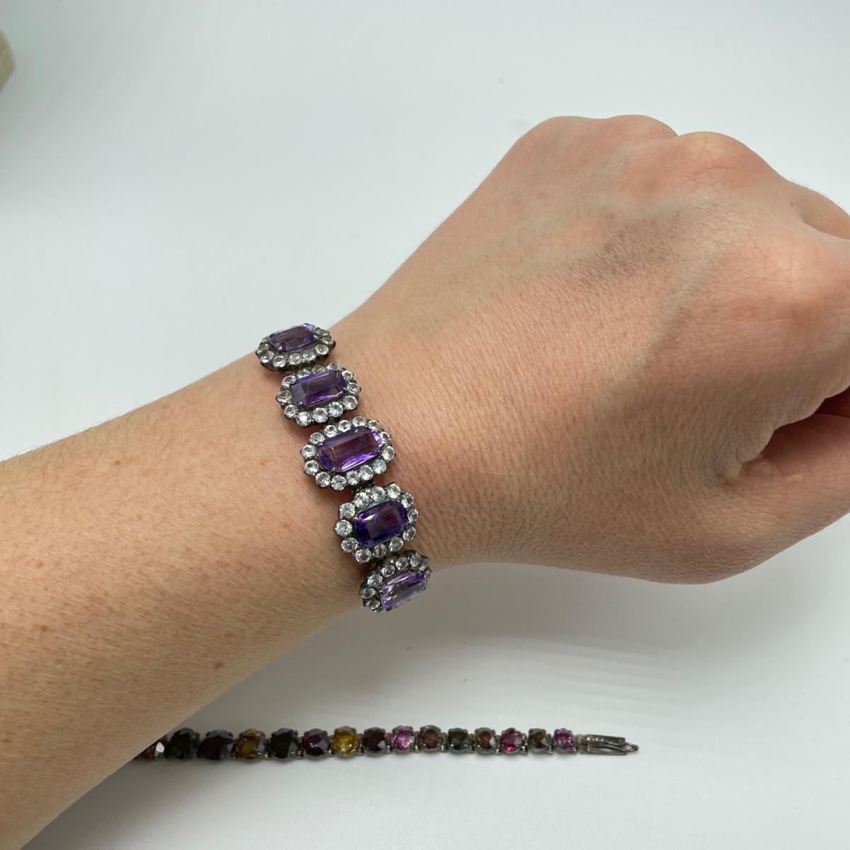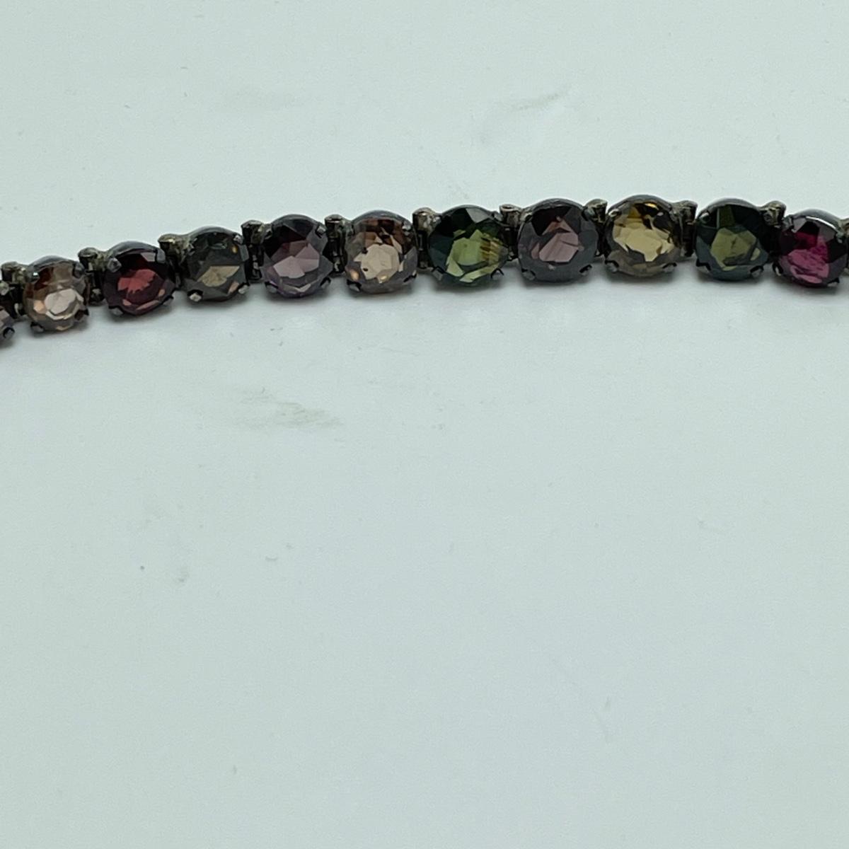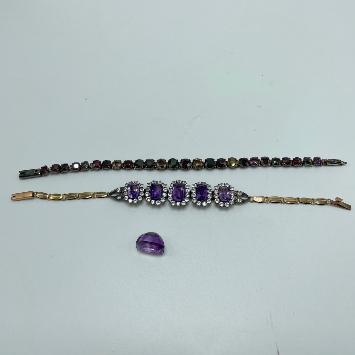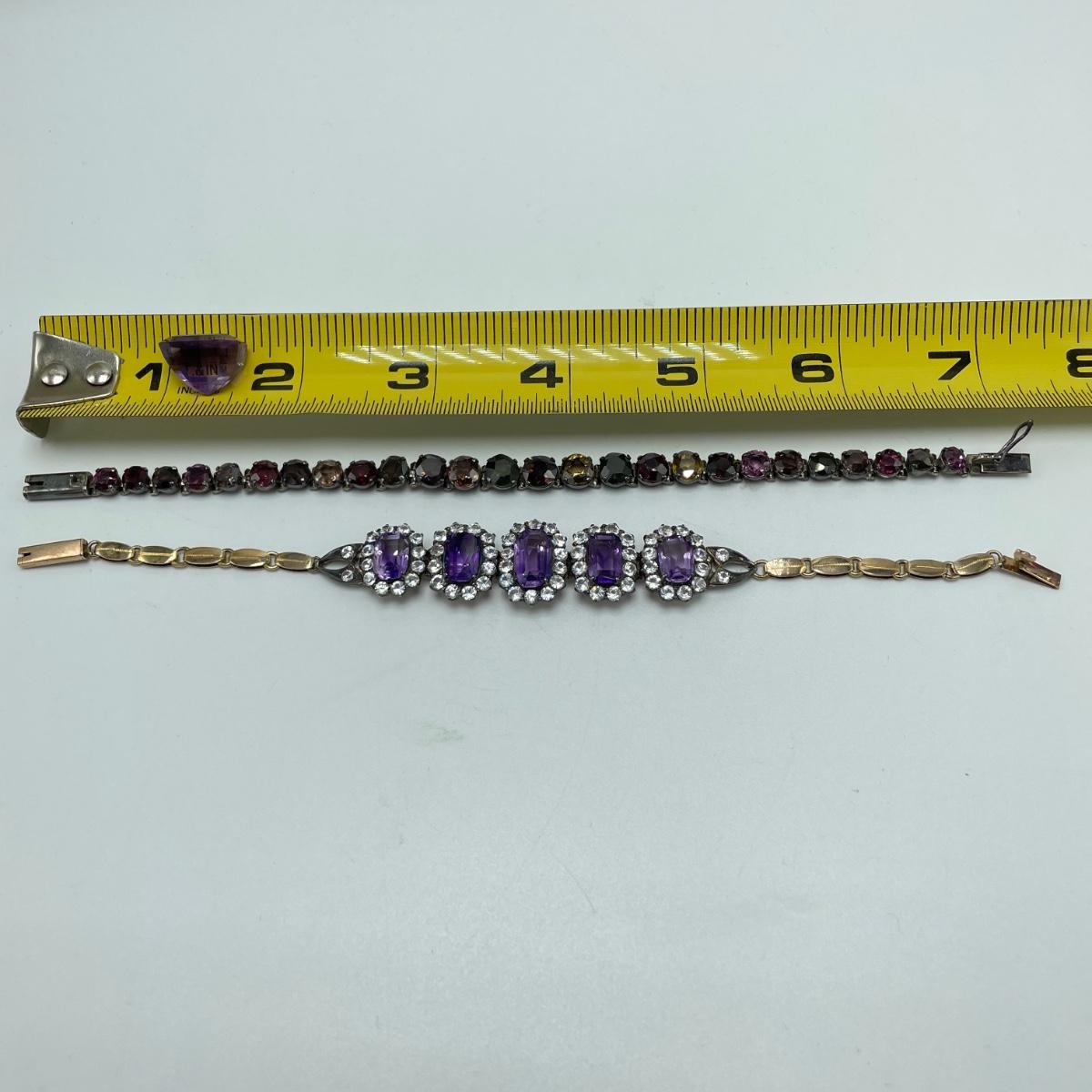 Two colorful bracelets that shimmer and shine! One has a purple amethyst color with an extra half inch gem. The other bracelet is a rainbow of darker, muted colors. We did not find any markings on either bracelet. See images. Shipping available.