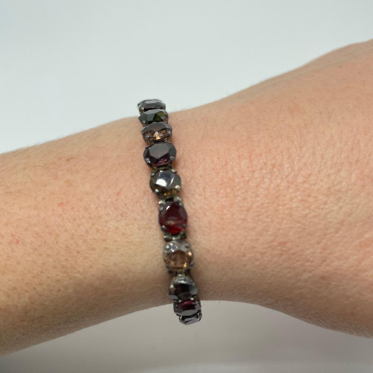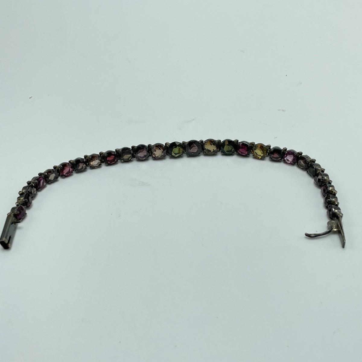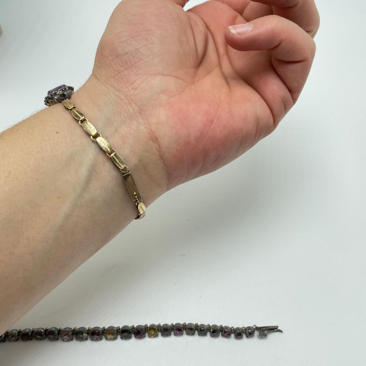 Two colorful bracelets that shimmer and shine! One has a purple amethyst color with an extra half inch gem. The other bracelet is a rainbow of darker, muted colors. We did not find any markings on either bracelet. See images. Shipping available.