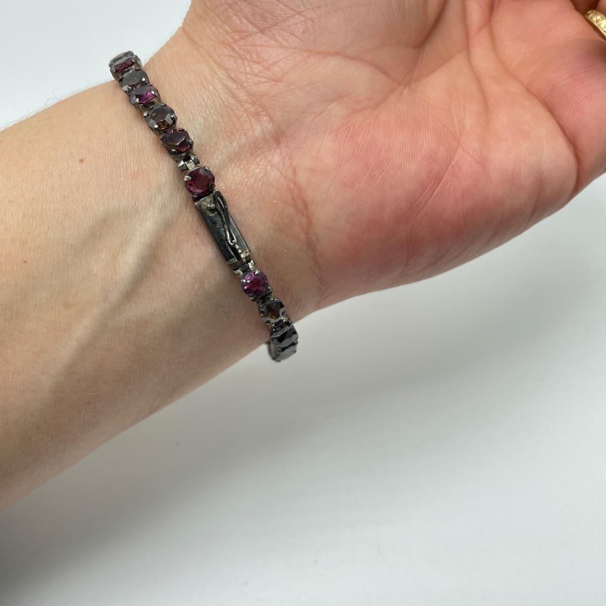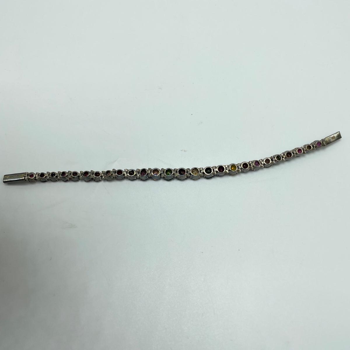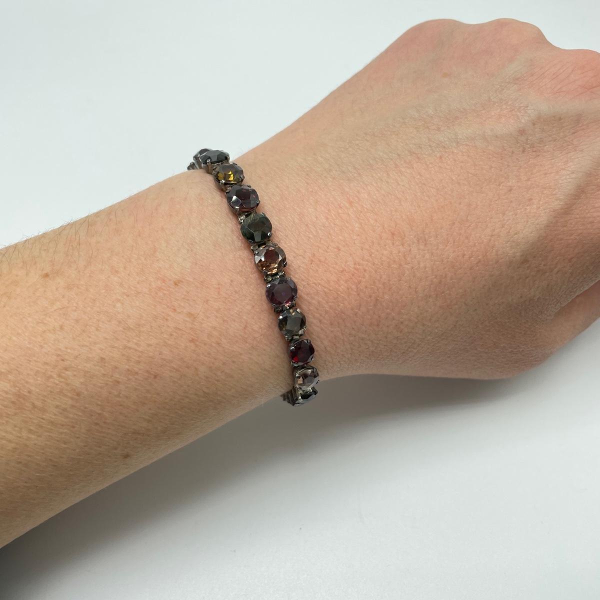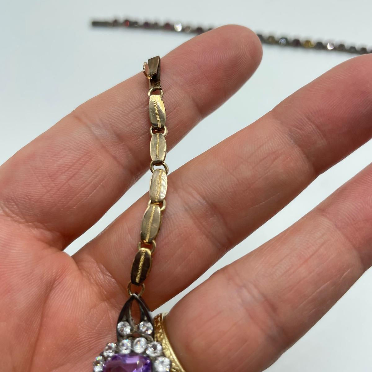 Two colorful bracelets that shimmer and shine! One has a purple amethyst color with an extra half inch gem. The other bracelet is a rainbow of darker, muted colors. We did not find any markings on either bracelet. See images. Shipping available.