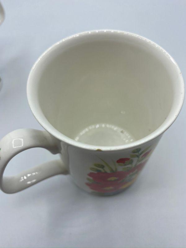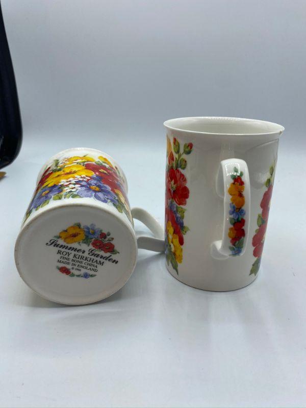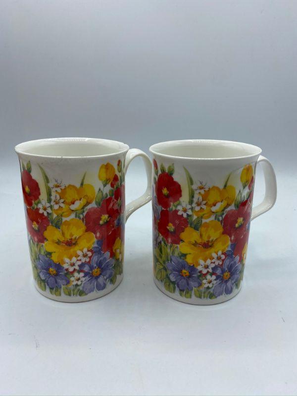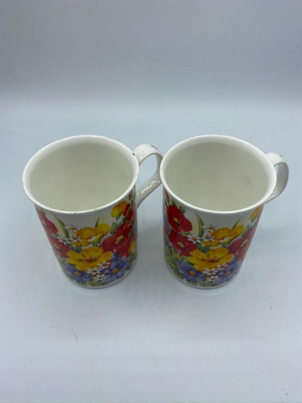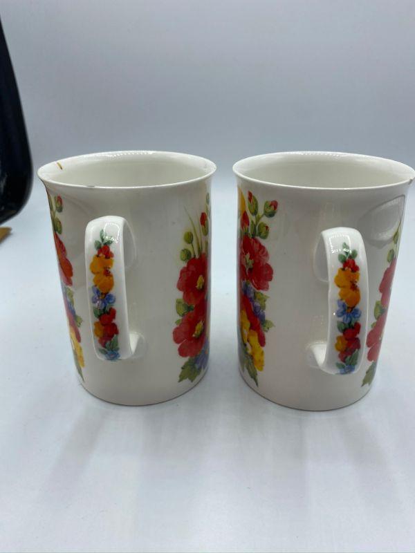"Summer Garden" Coffee Cups. Colorful floral cups. One has a tiny nick in the edge.