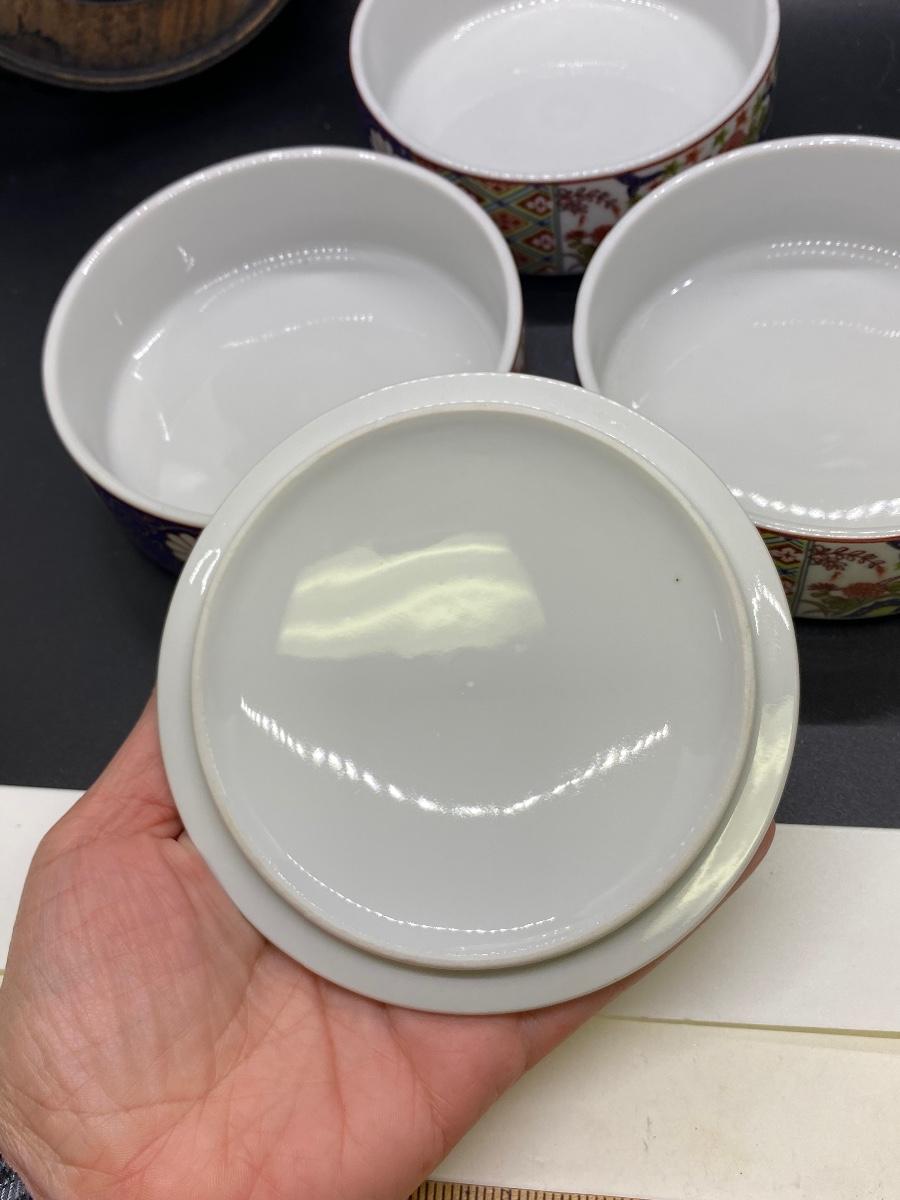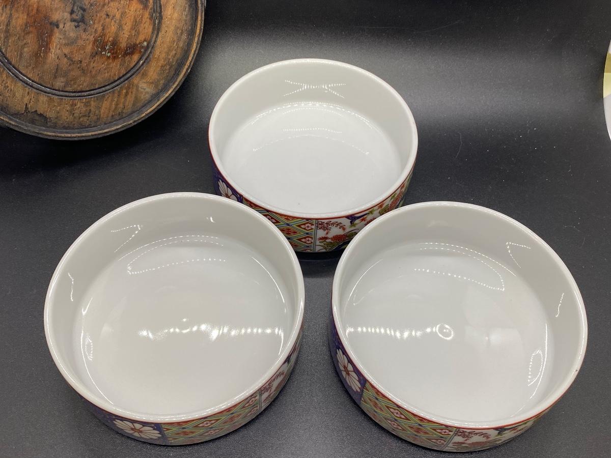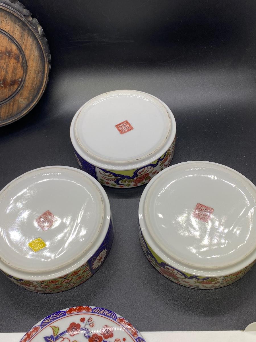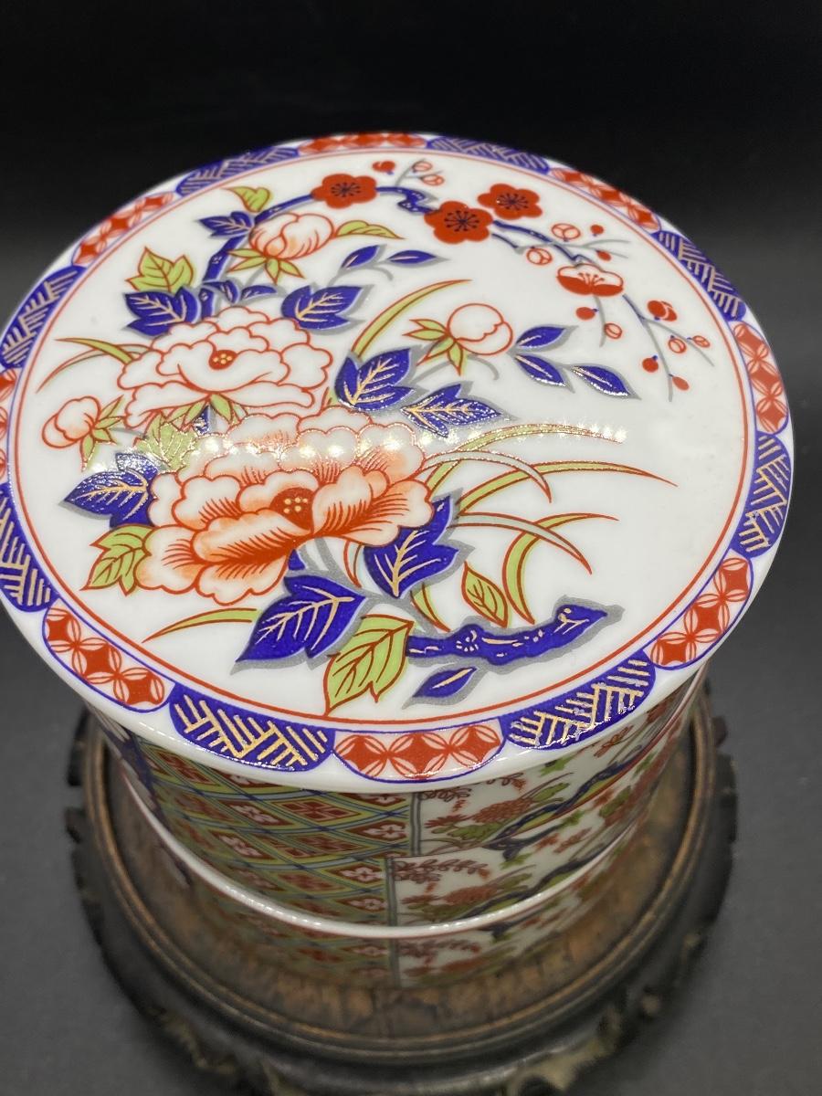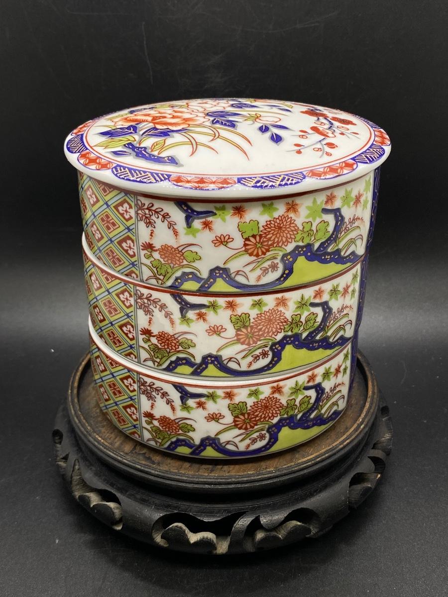 Colorful Floral Imari Jubako Japanese Shibata Porcelain Stacking Trinket Jewelry Box with Lid & Wood Stand