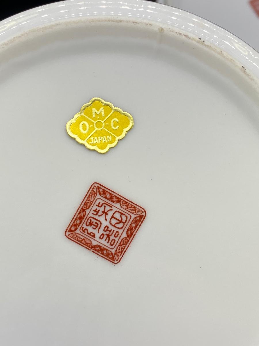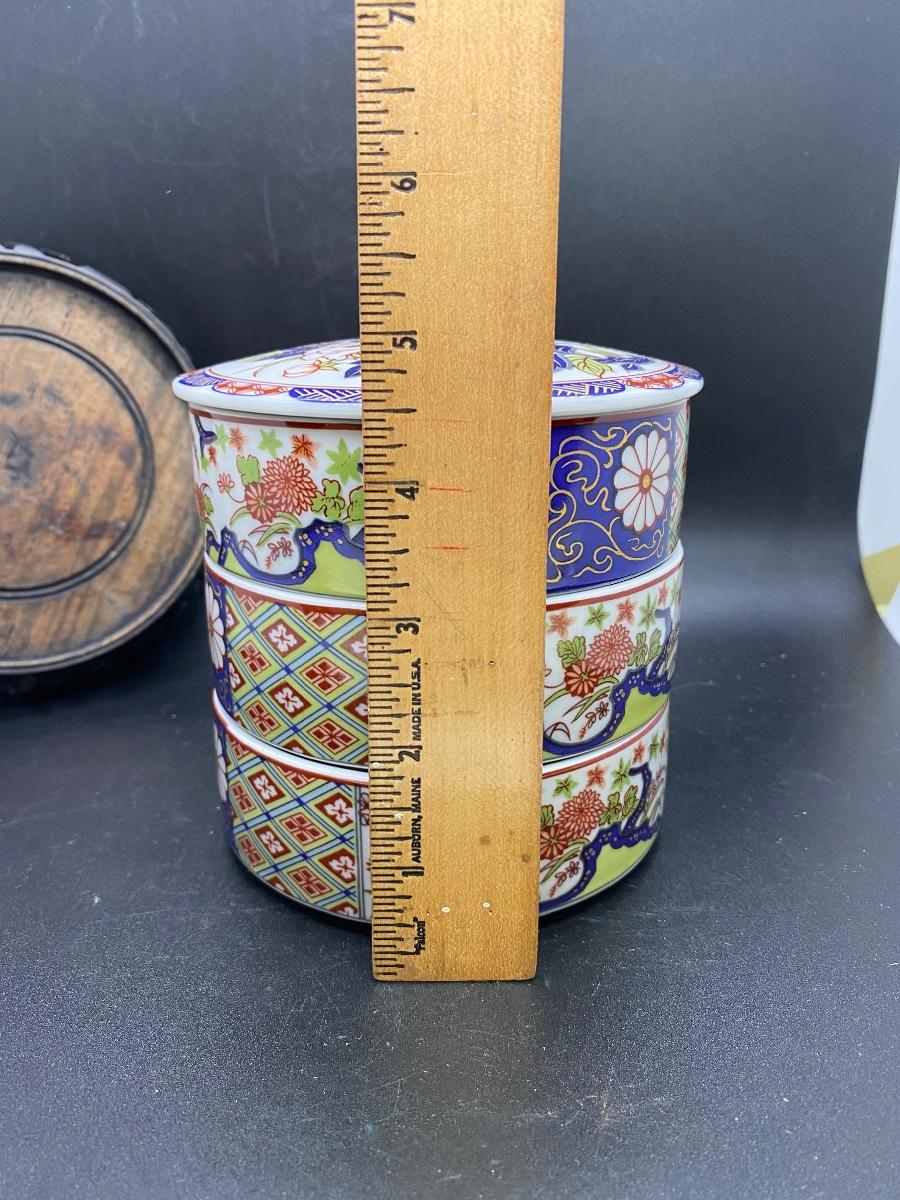 Colorful floral porcelain Jubako trinket dish. Three tier with lid. Very colorful design. In good condition. Has mark on bottom with one piece having the original maker sticker attached. Comes with wood base stand.