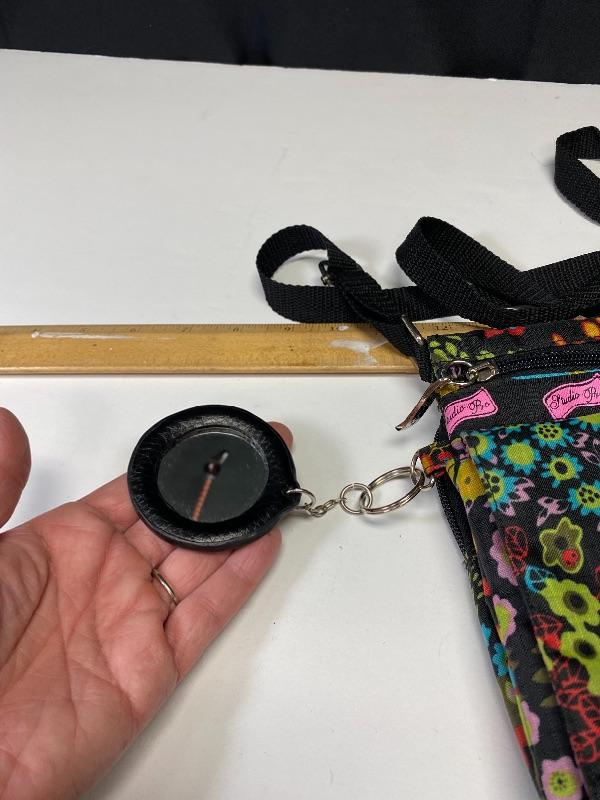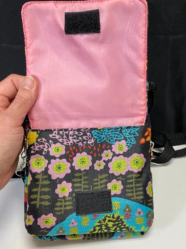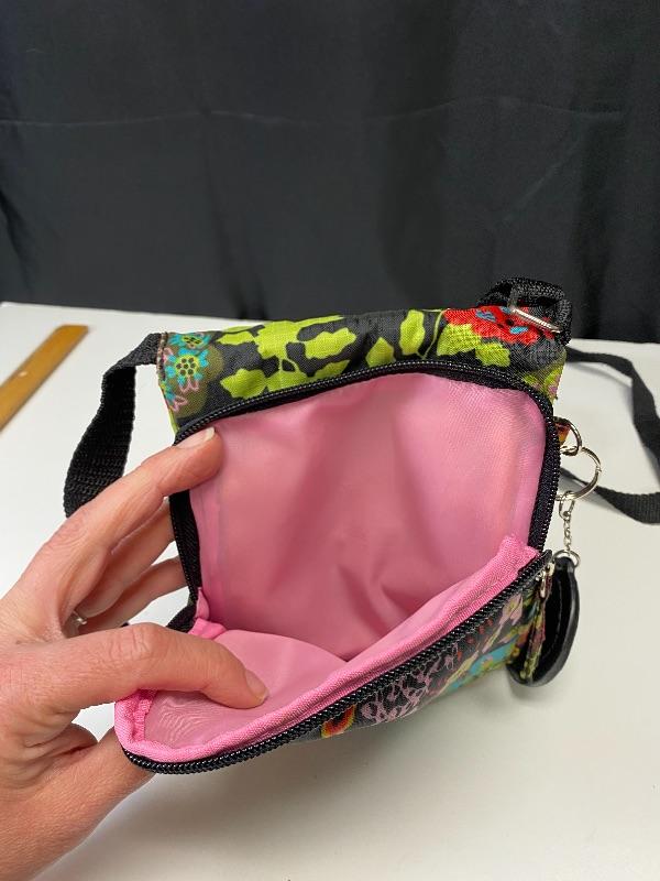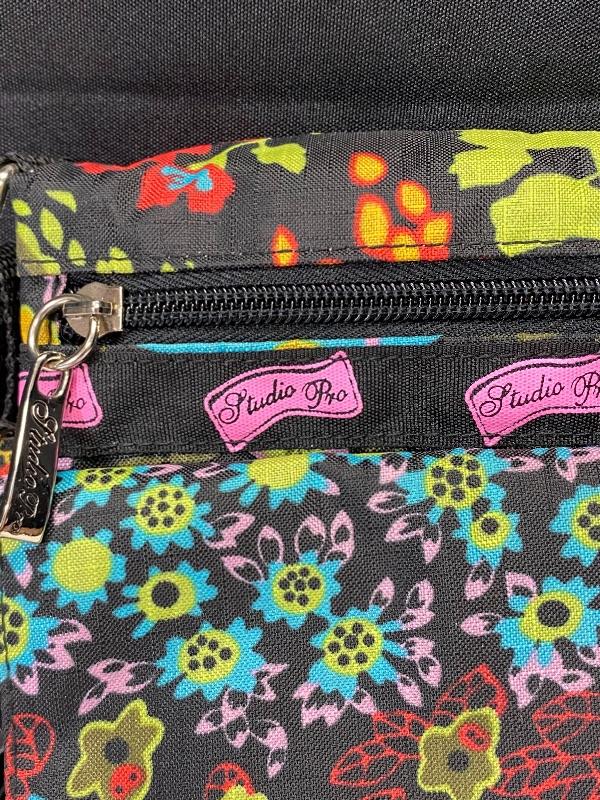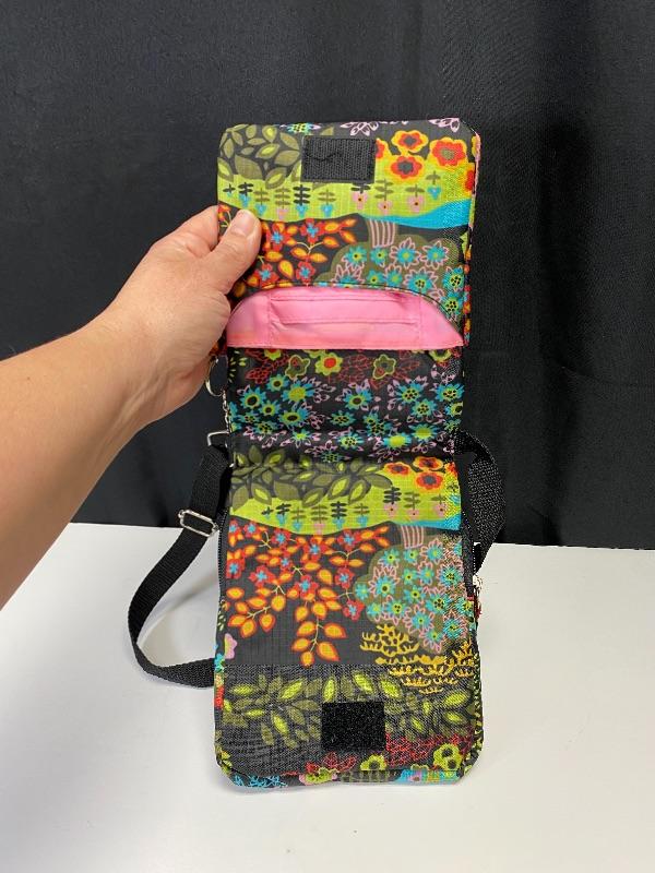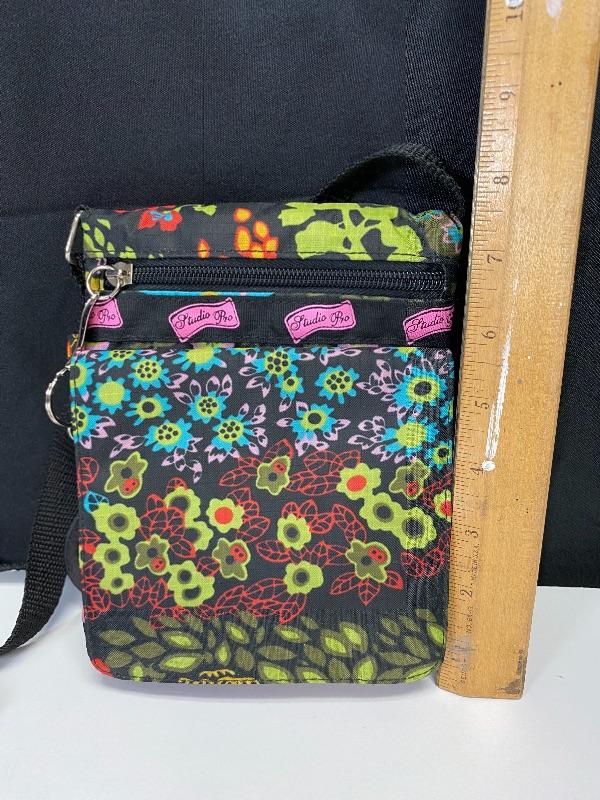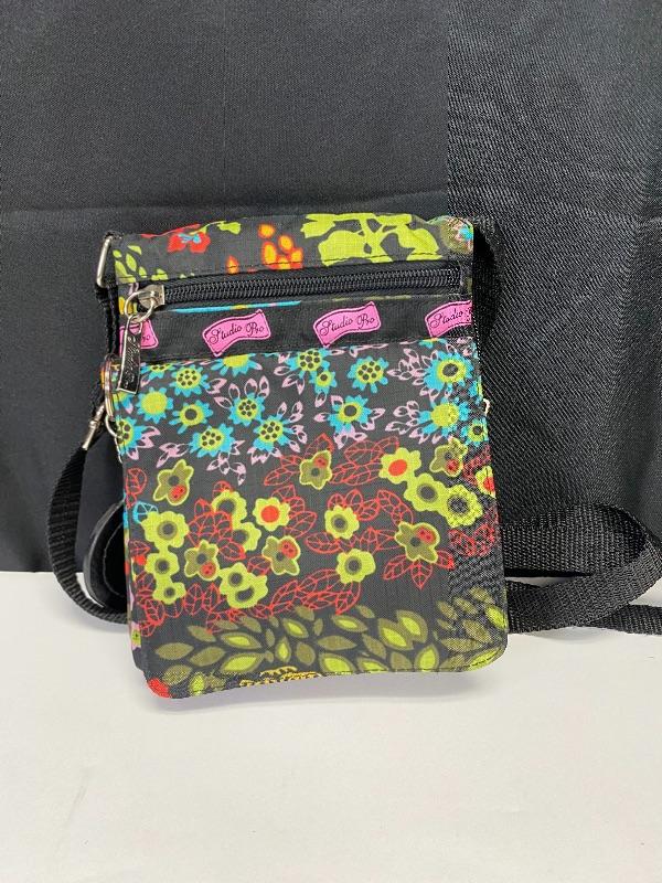 Colorful floral cross body bag from Studio Pro. Good previously owned condition. Multiple pockets. Under 8" size.