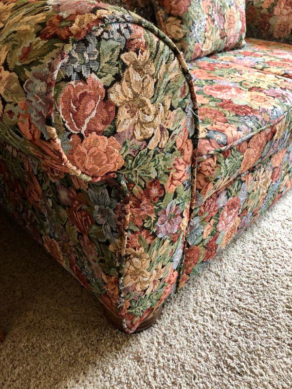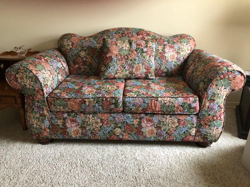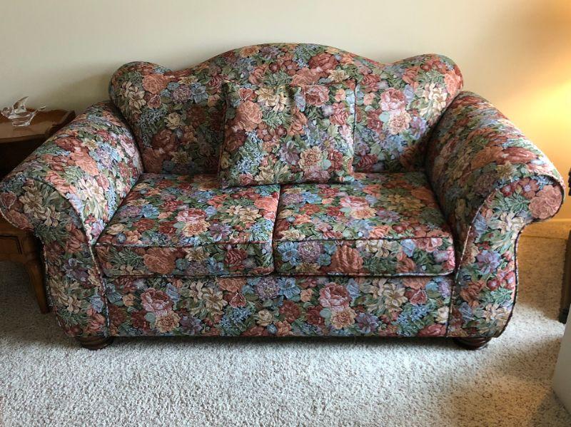 Colorful floral patterned Love Seat Couch. Comfortable, well built. Does have a little snag damage from a cat that is hard to see in photos. No smells, rips, or spots.