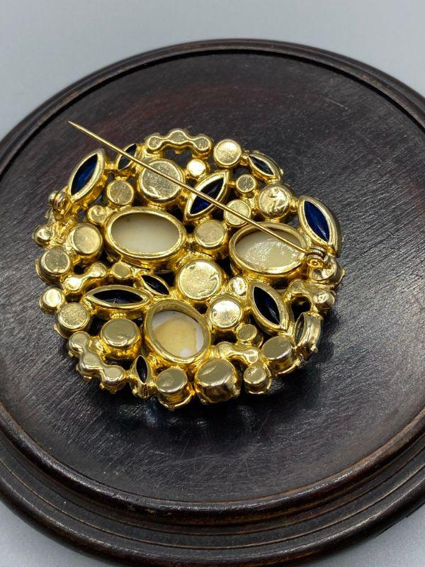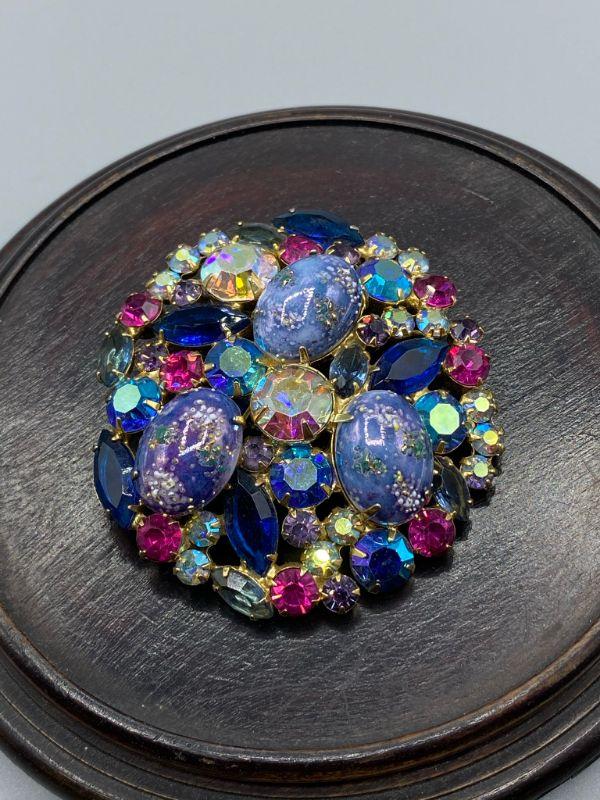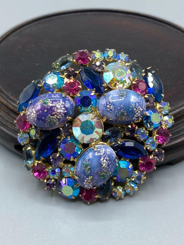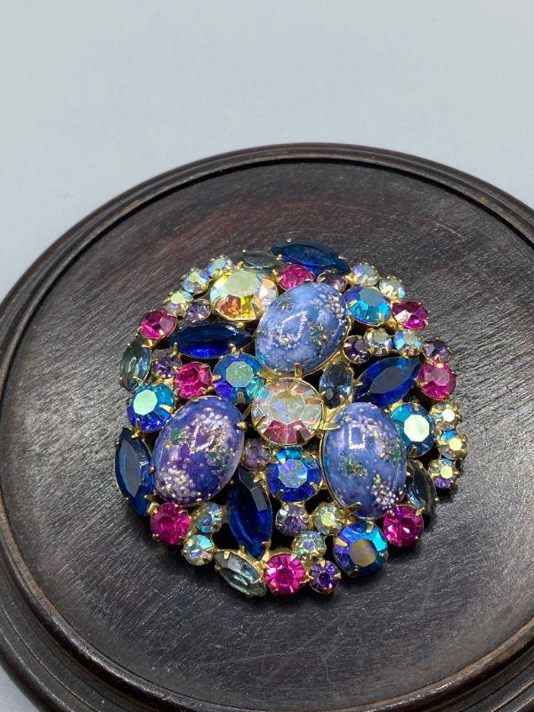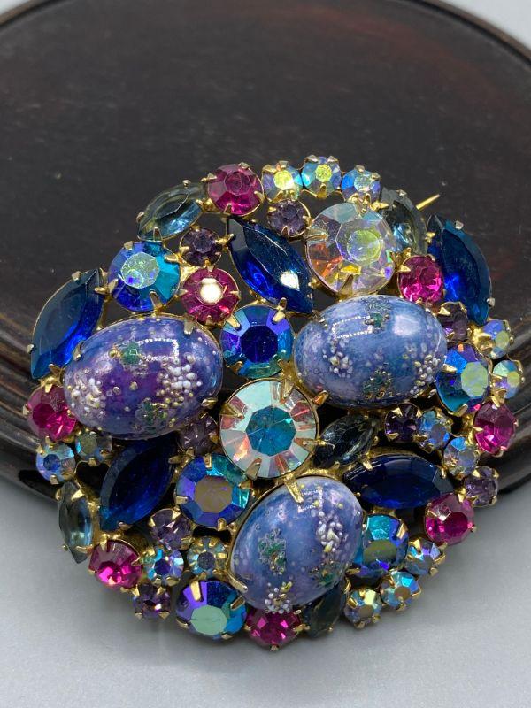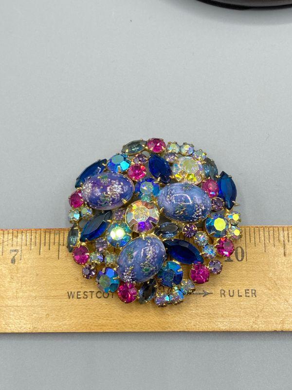 Colorful hues of blue fruit salad rhinestone brooch. Mix of blues and purples, some AB some not. Unsigned. About 2" size. No missing stones.