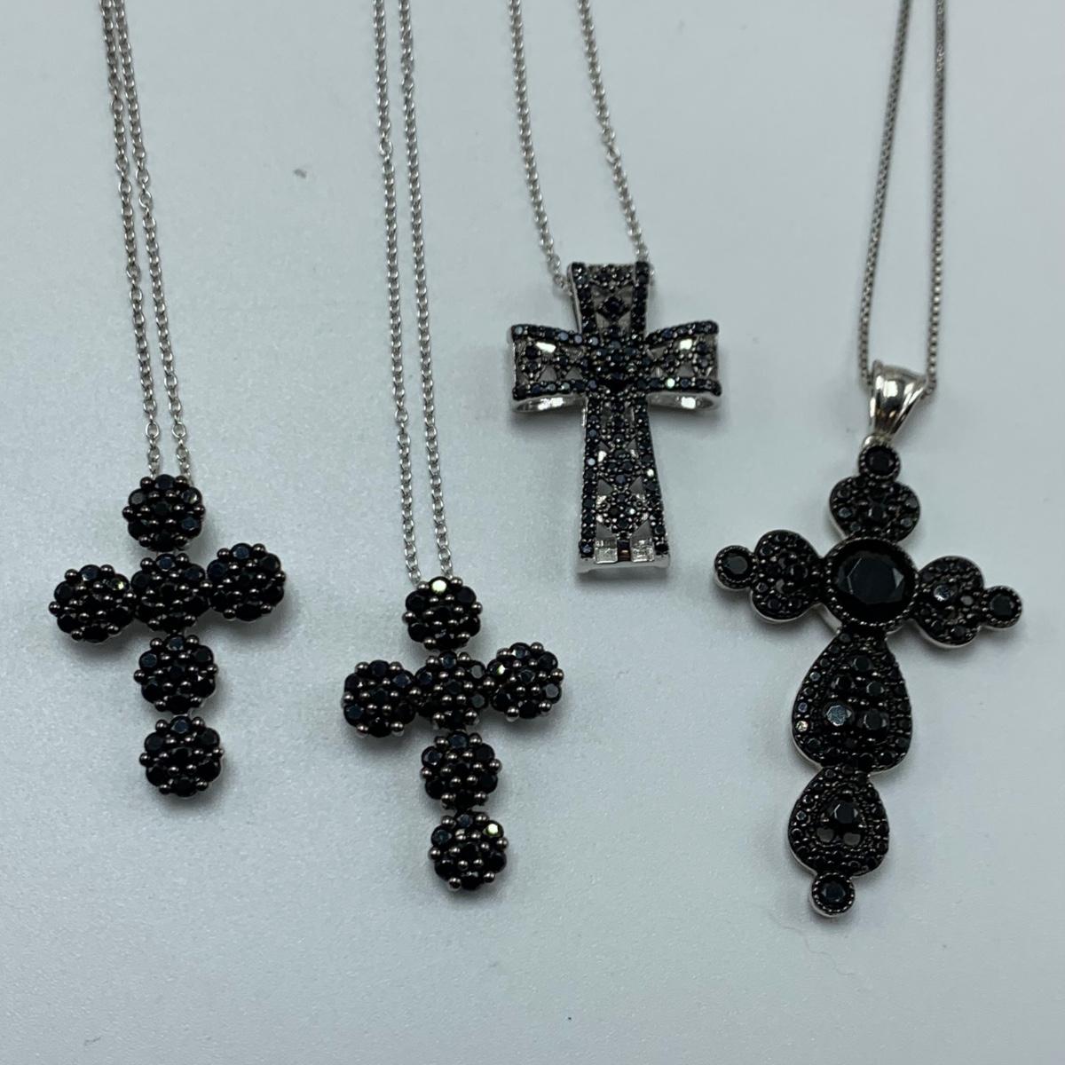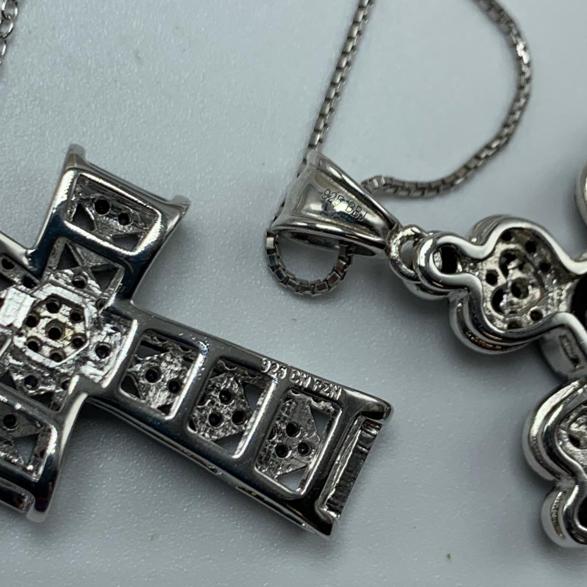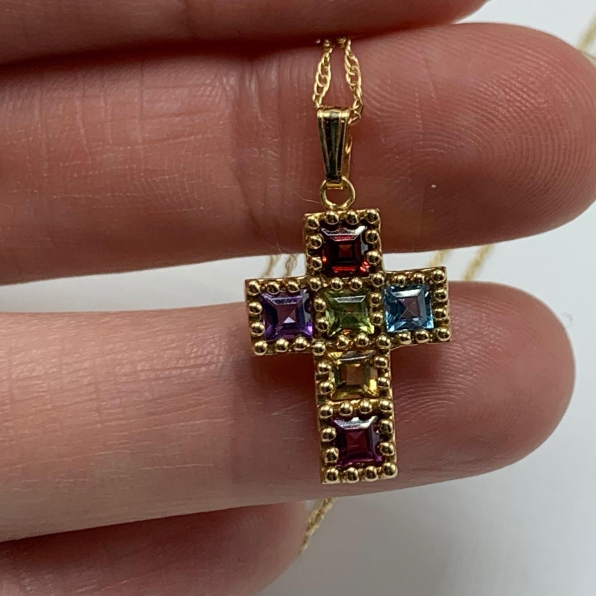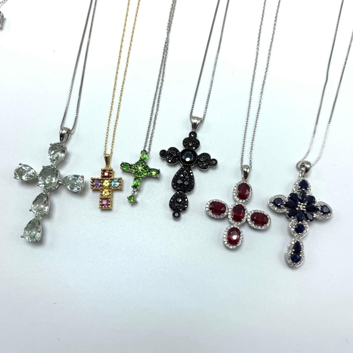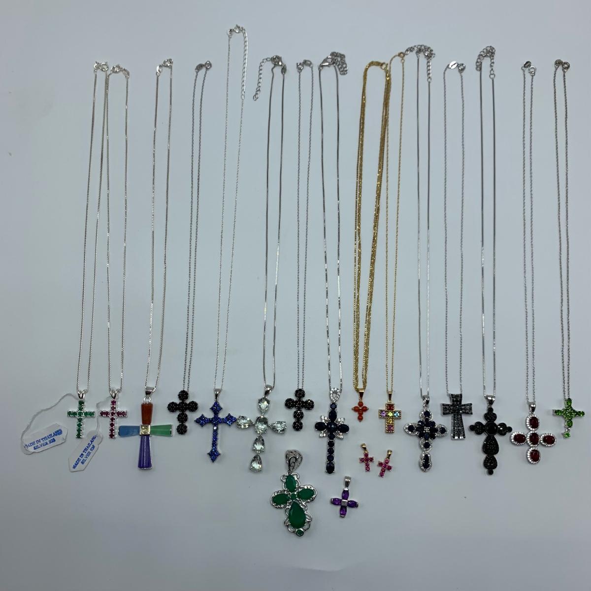 This lot contains a variety of colorful gemstone cross pendants set in 925 and 14K, on 925 and 14K chains. There are 13 chains stamped 925 with pendants and two pendants stamped 925 without chains. There is one multi-stranded necklace stamped 14K, one gold necklace without a visible mark, and four pendants marked 14K. Most necklace chains measure approximately 18” and a few have adjustable lengths. All sales are final. No returns or refunds. Please bid accordingly.