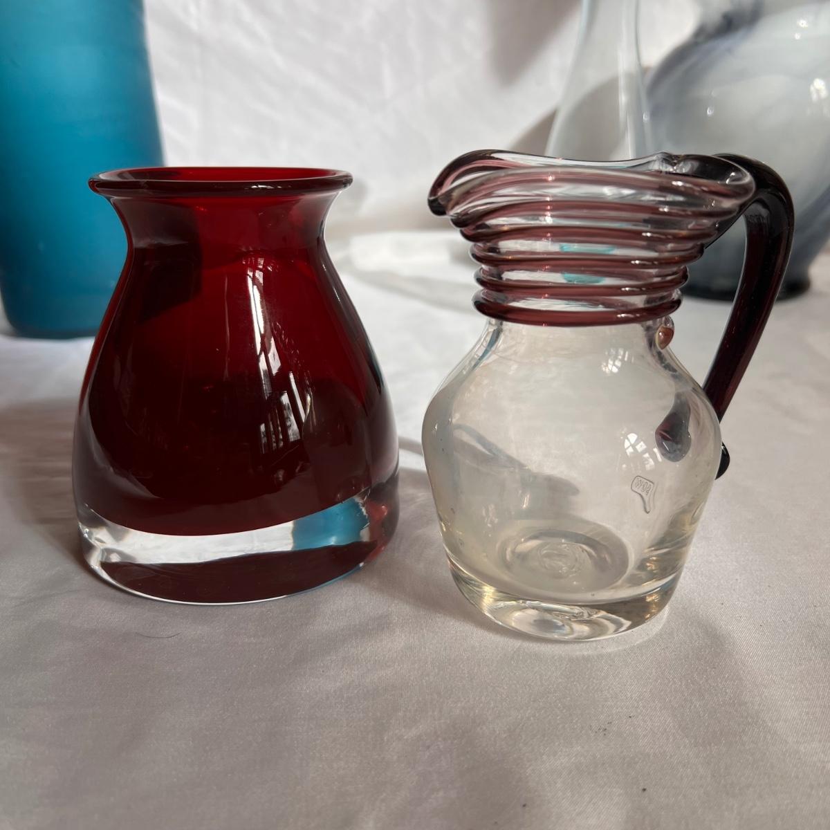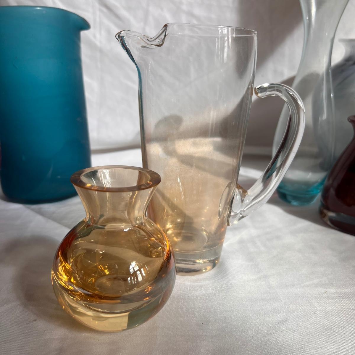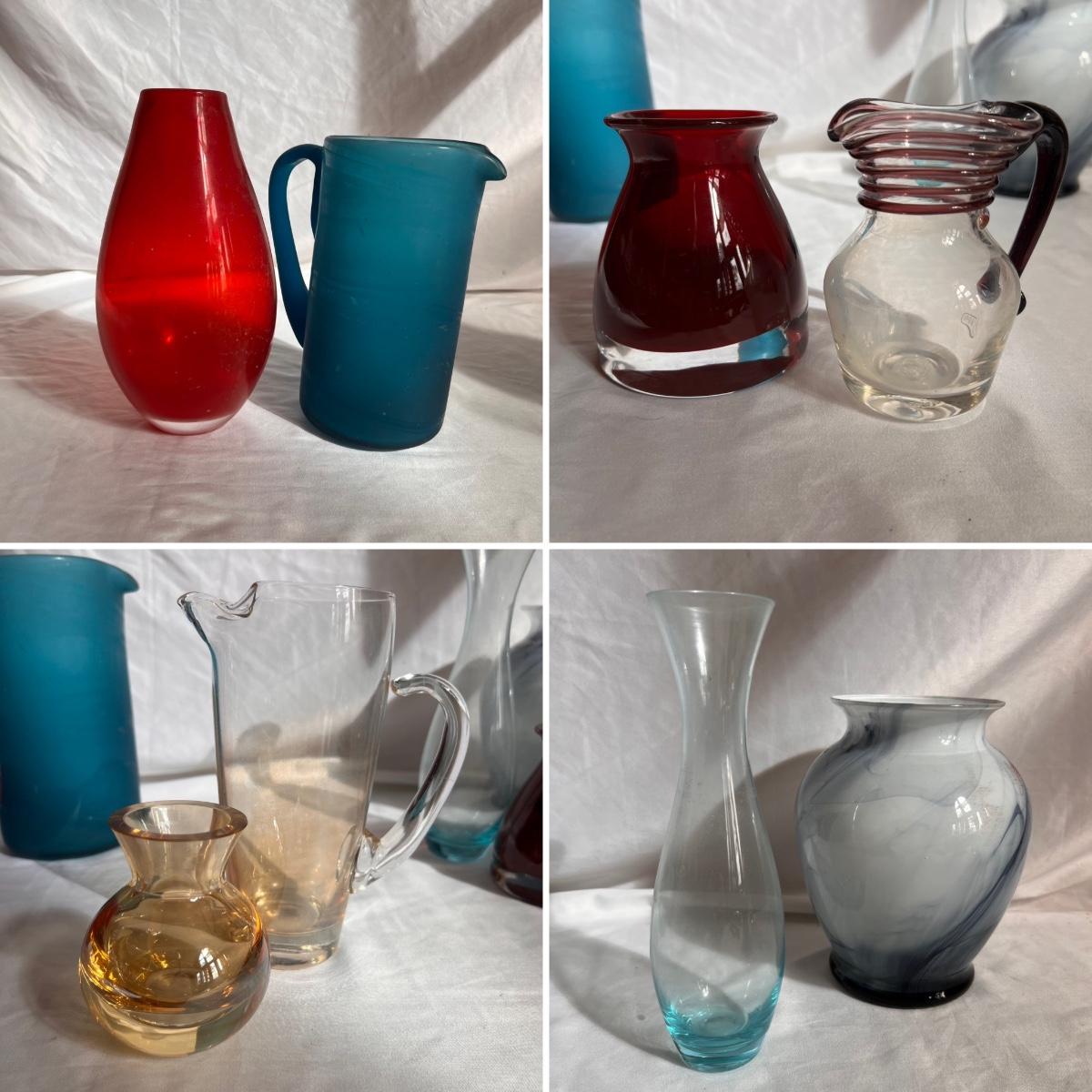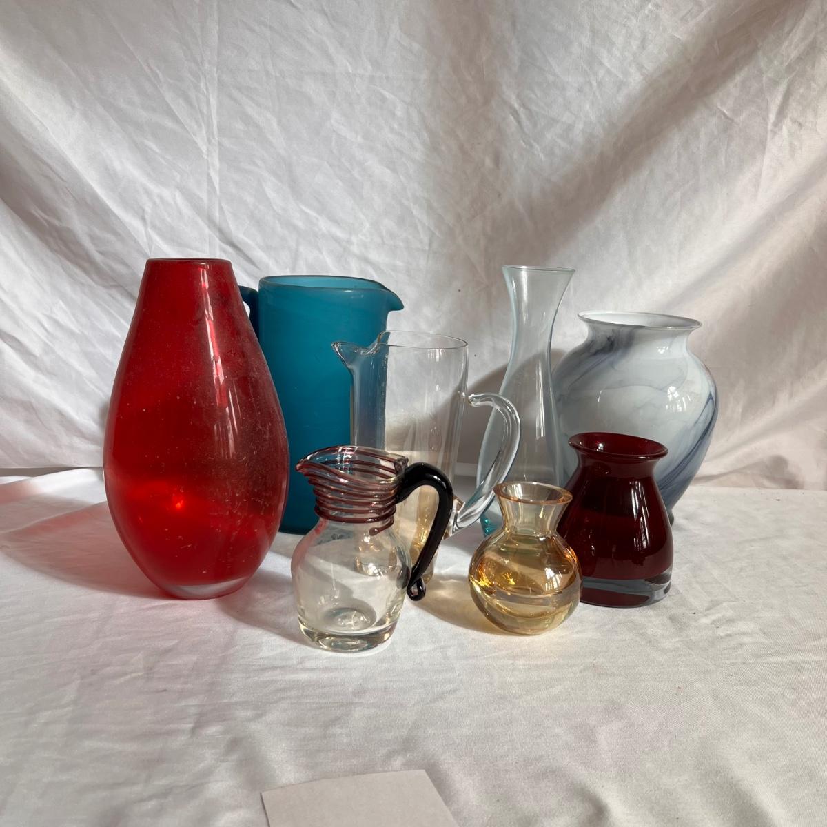 A lovely assortment of colored glass pitchers and vases. No markings found on any items.