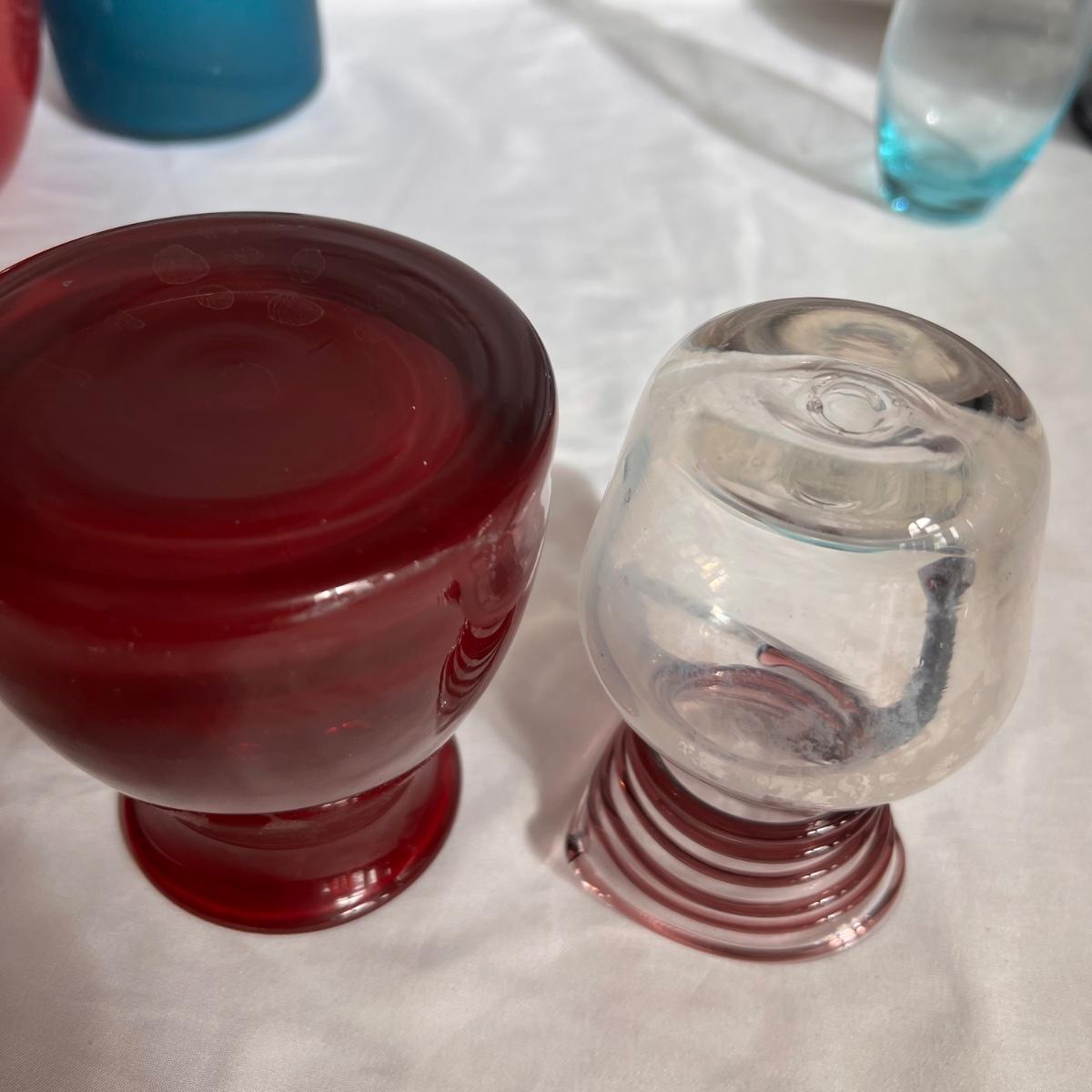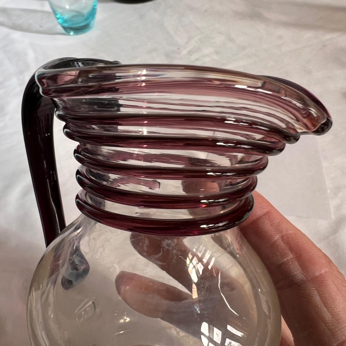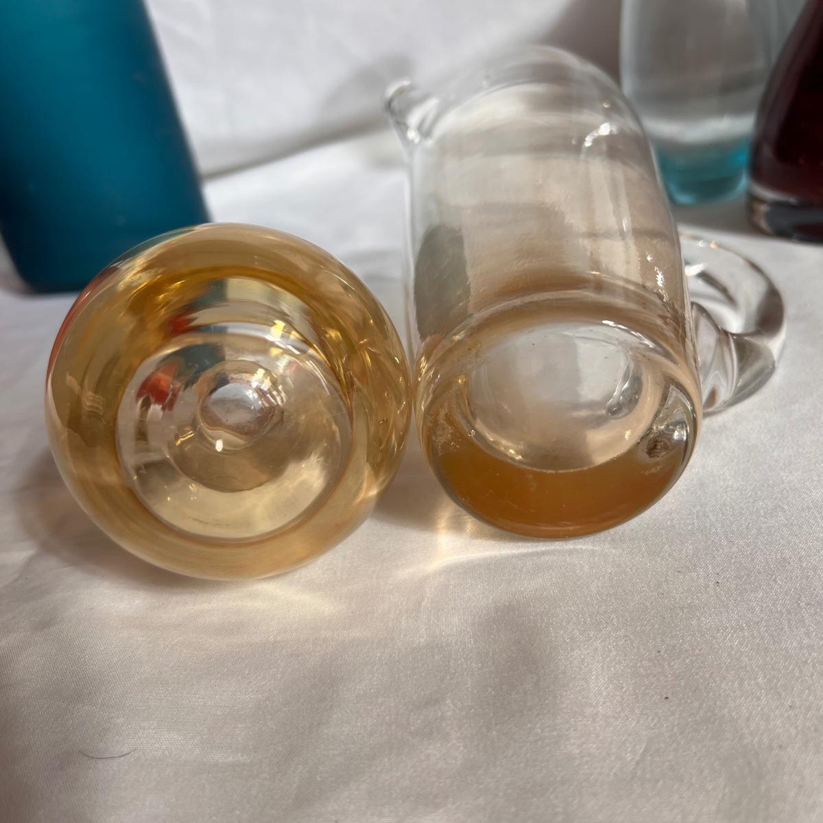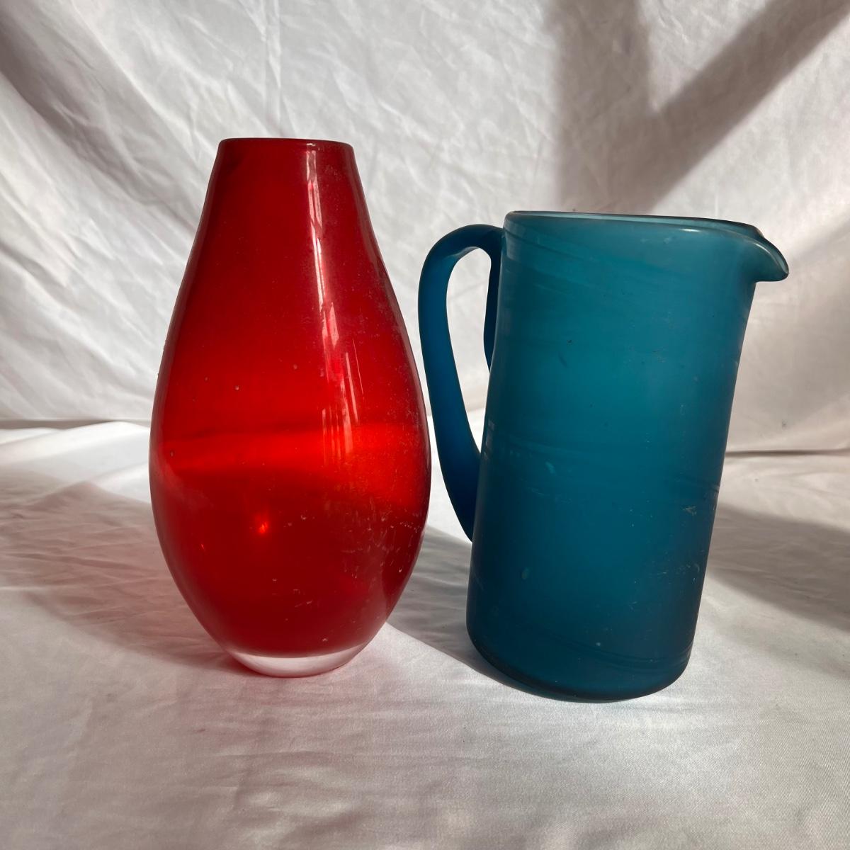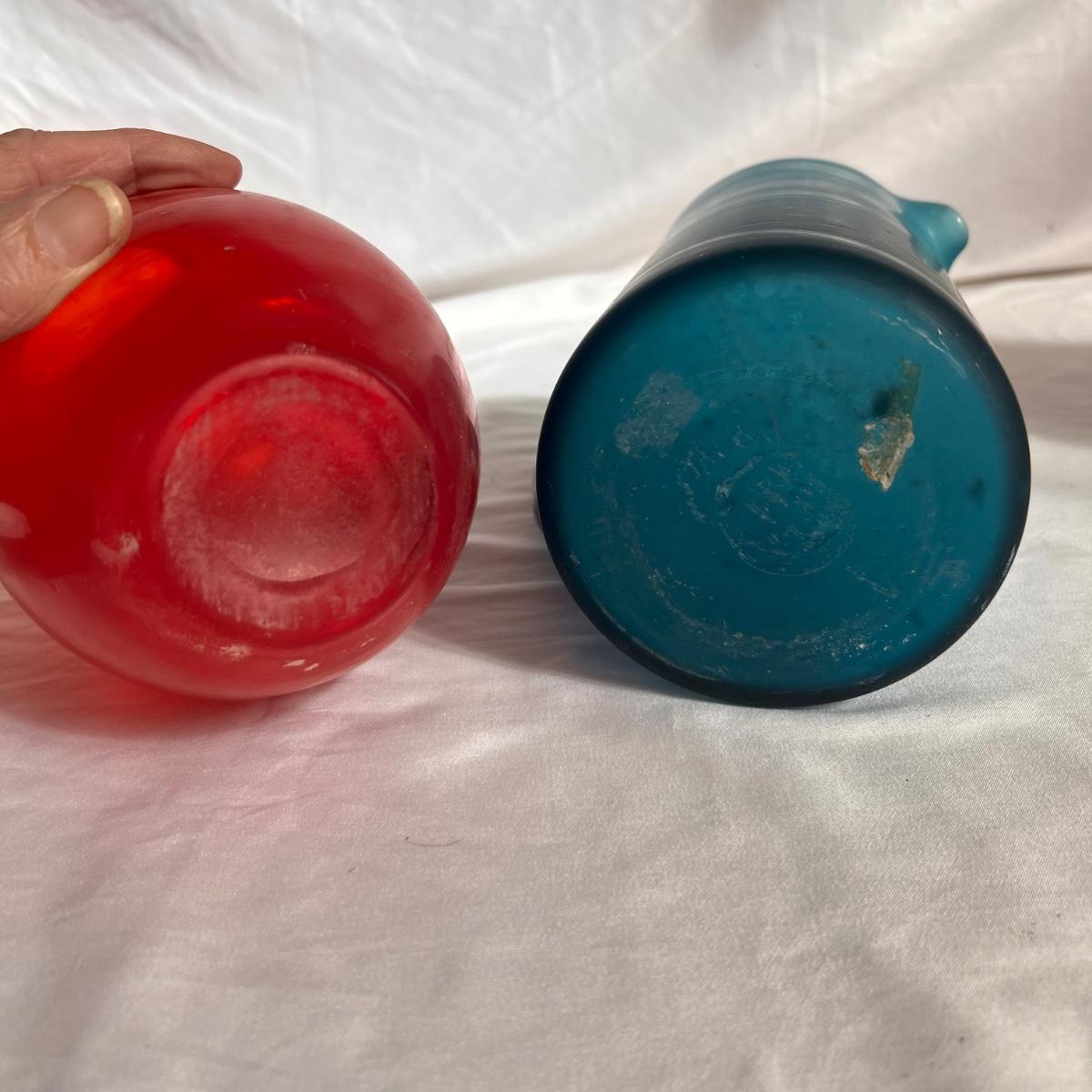 A lovely assortment of colored glass pitchers and vases. No markings found on any items.