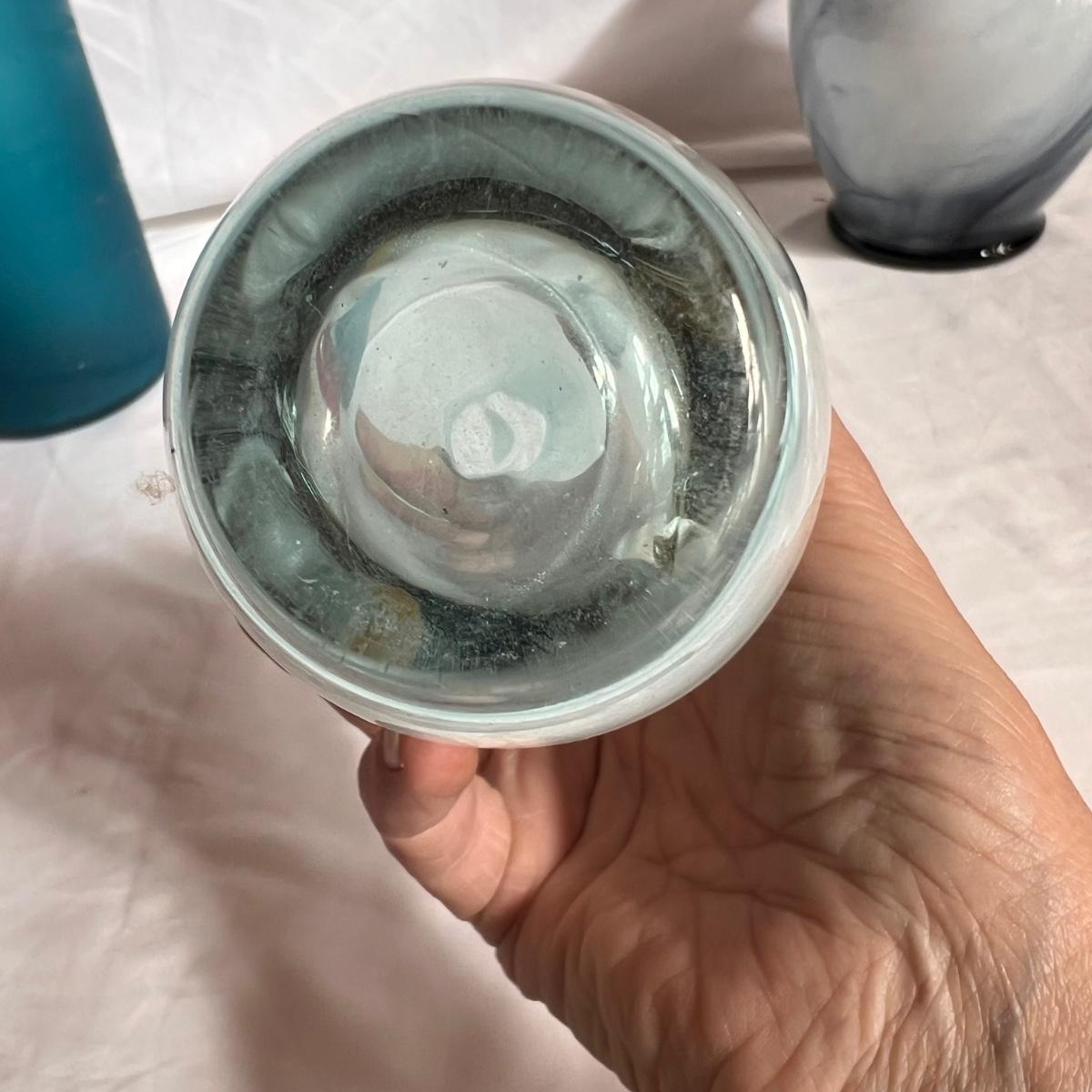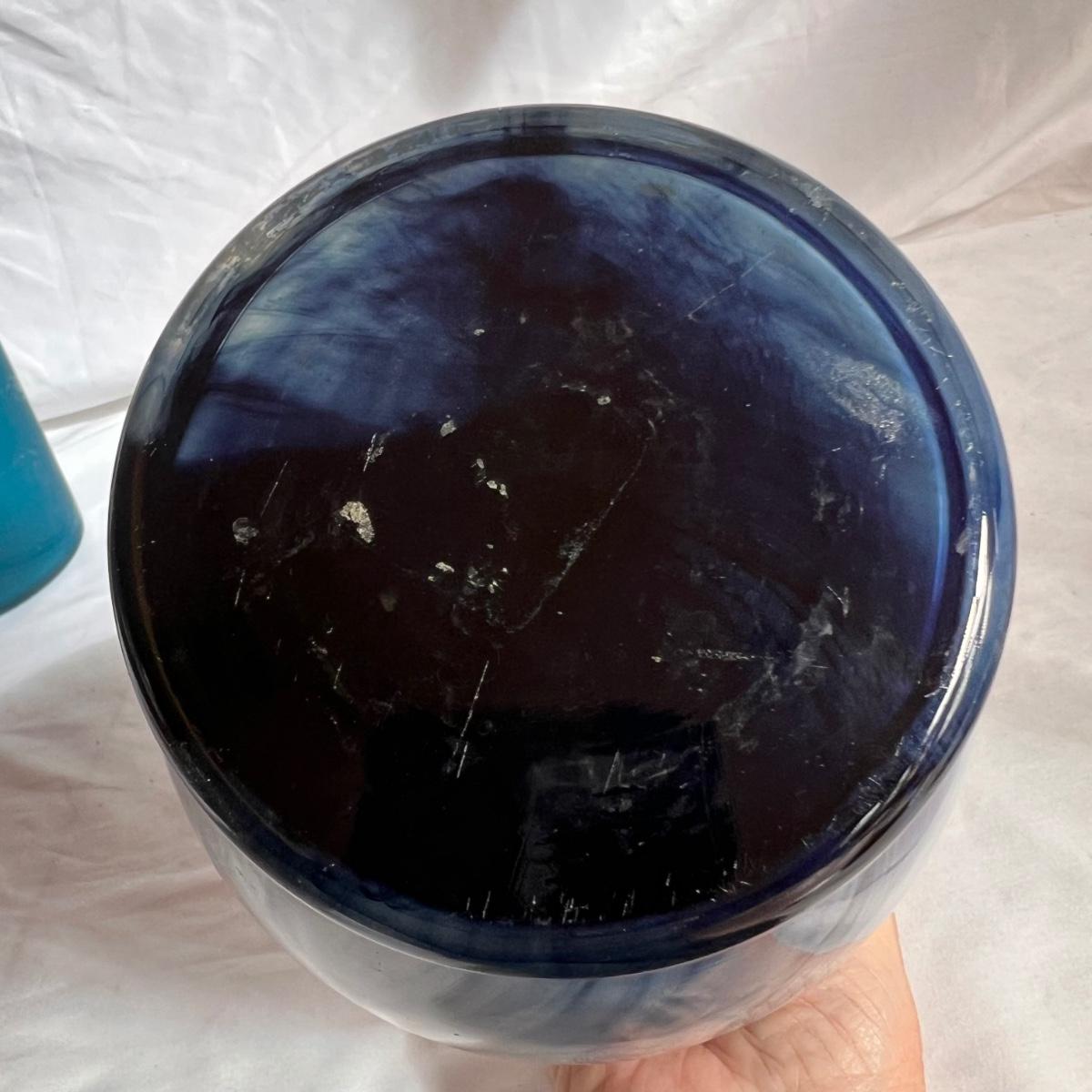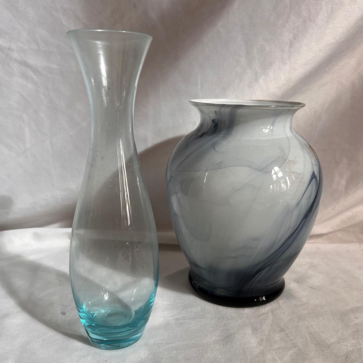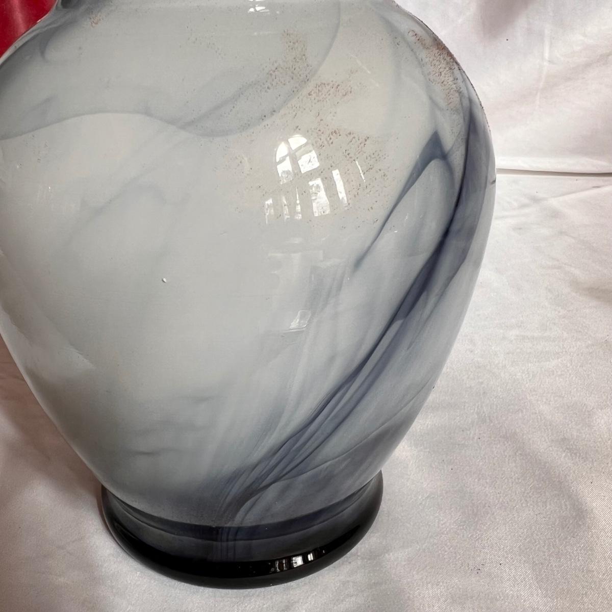 A lovely assortment of colored glass pitchers and vases. No markings found on any items.