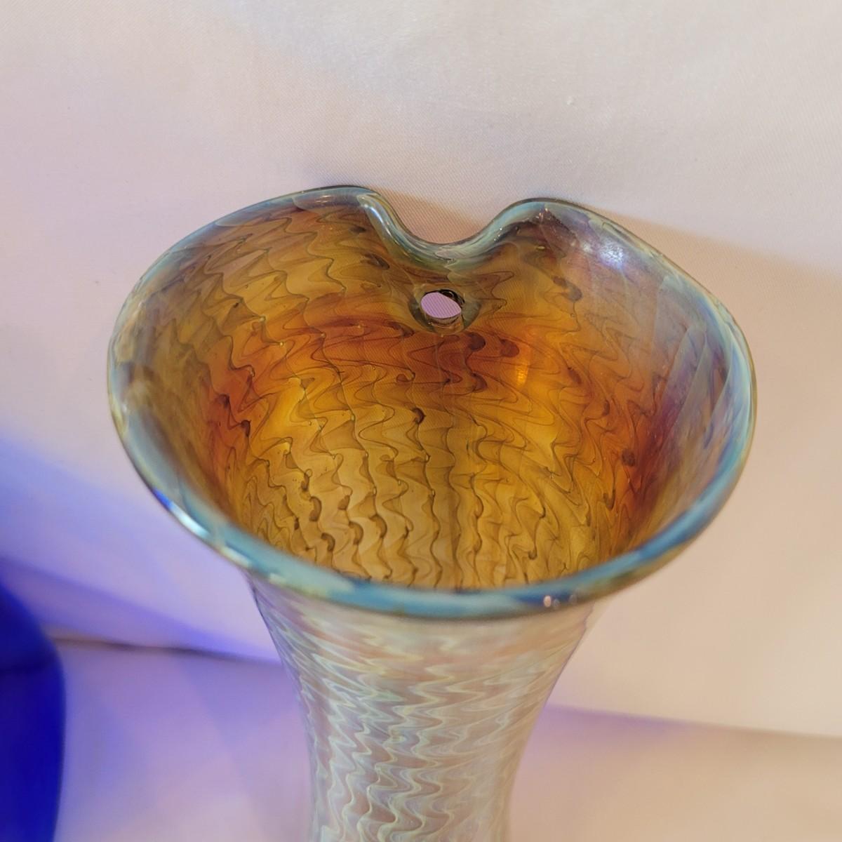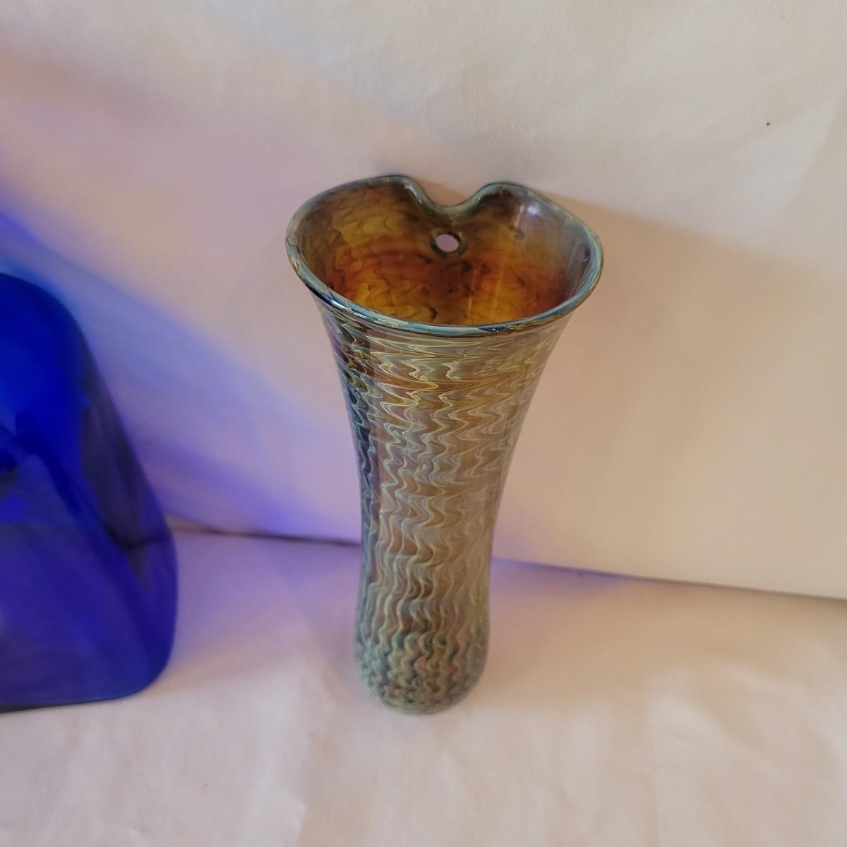 A collection of unique, richly colorful glass vases, including a wall hanging vase. Large blue vase may be Fenton Glass and measures approximately 6.5” x 3” x 8.5”H. Shipping available.