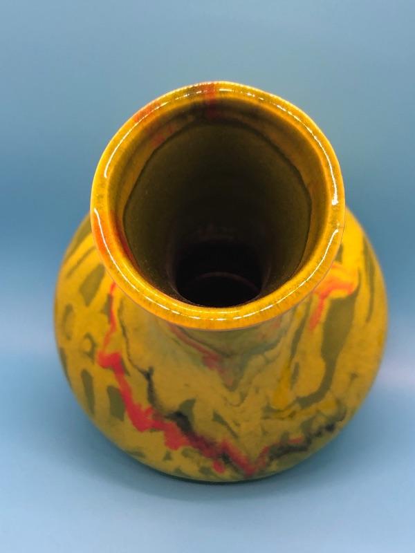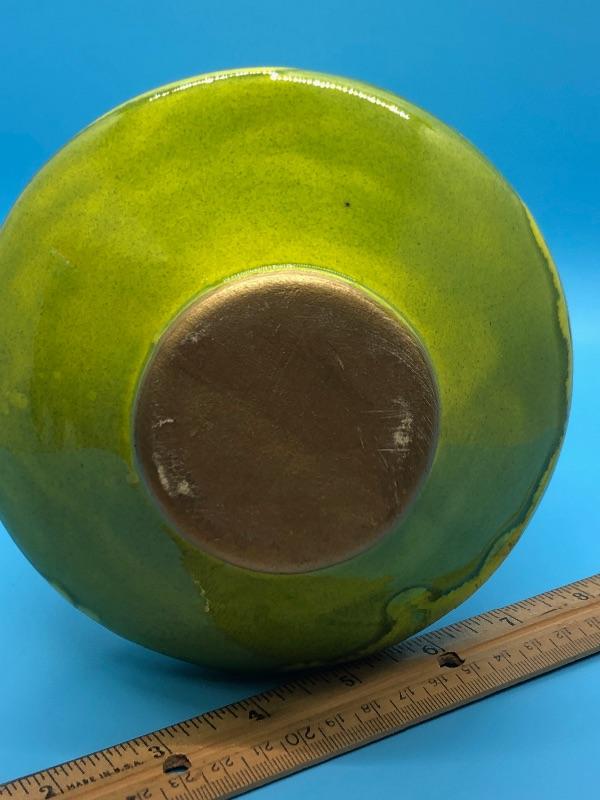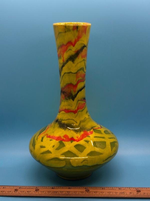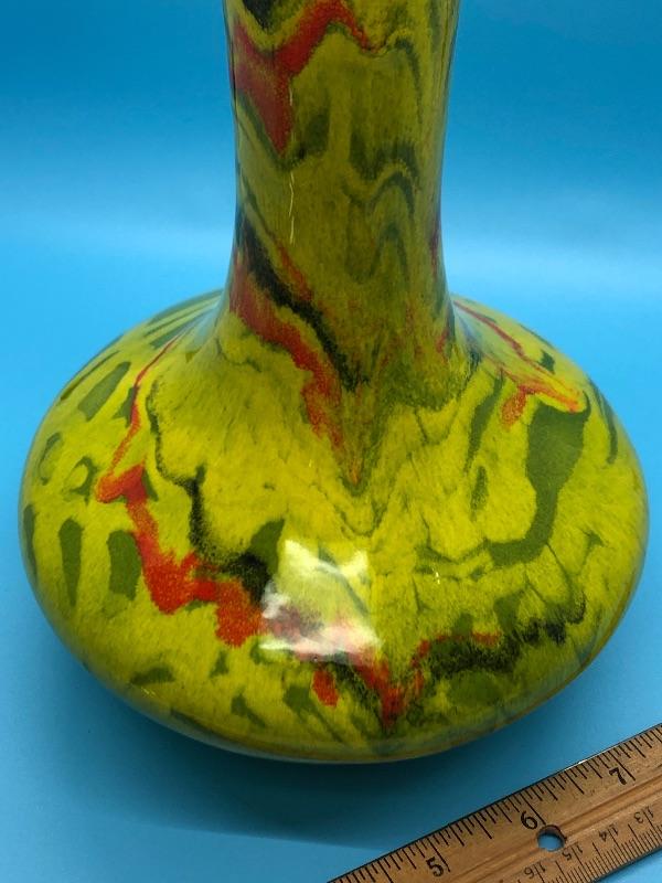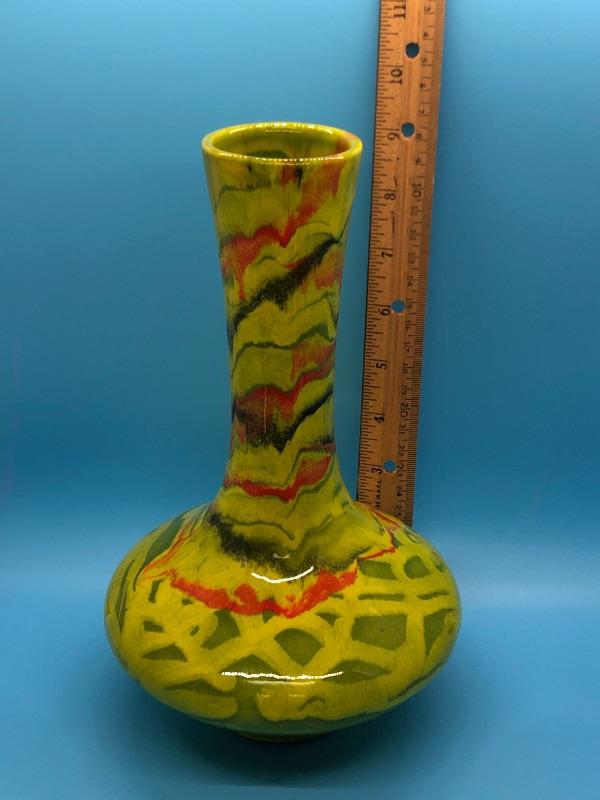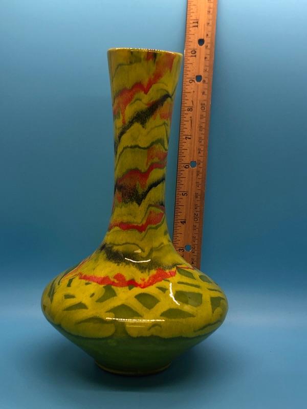 Colorful green & red dripware style pottery vase. Great condition. About 10" tall.