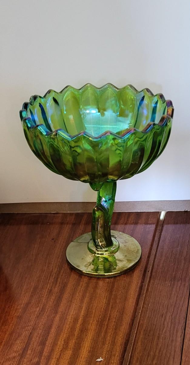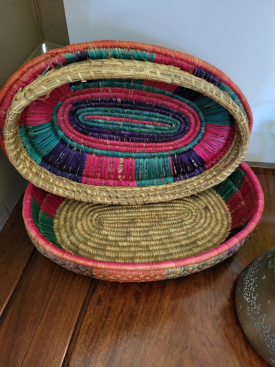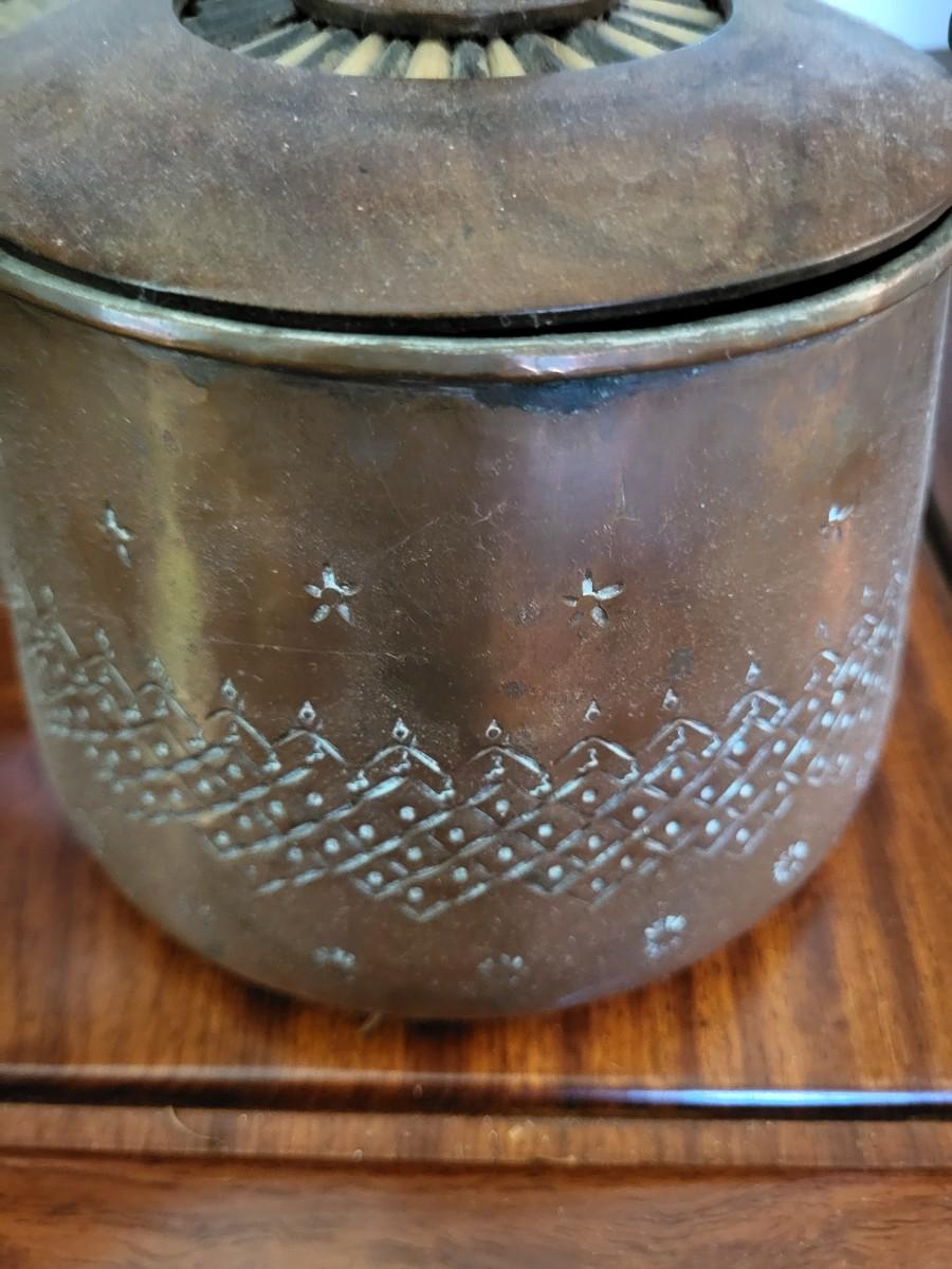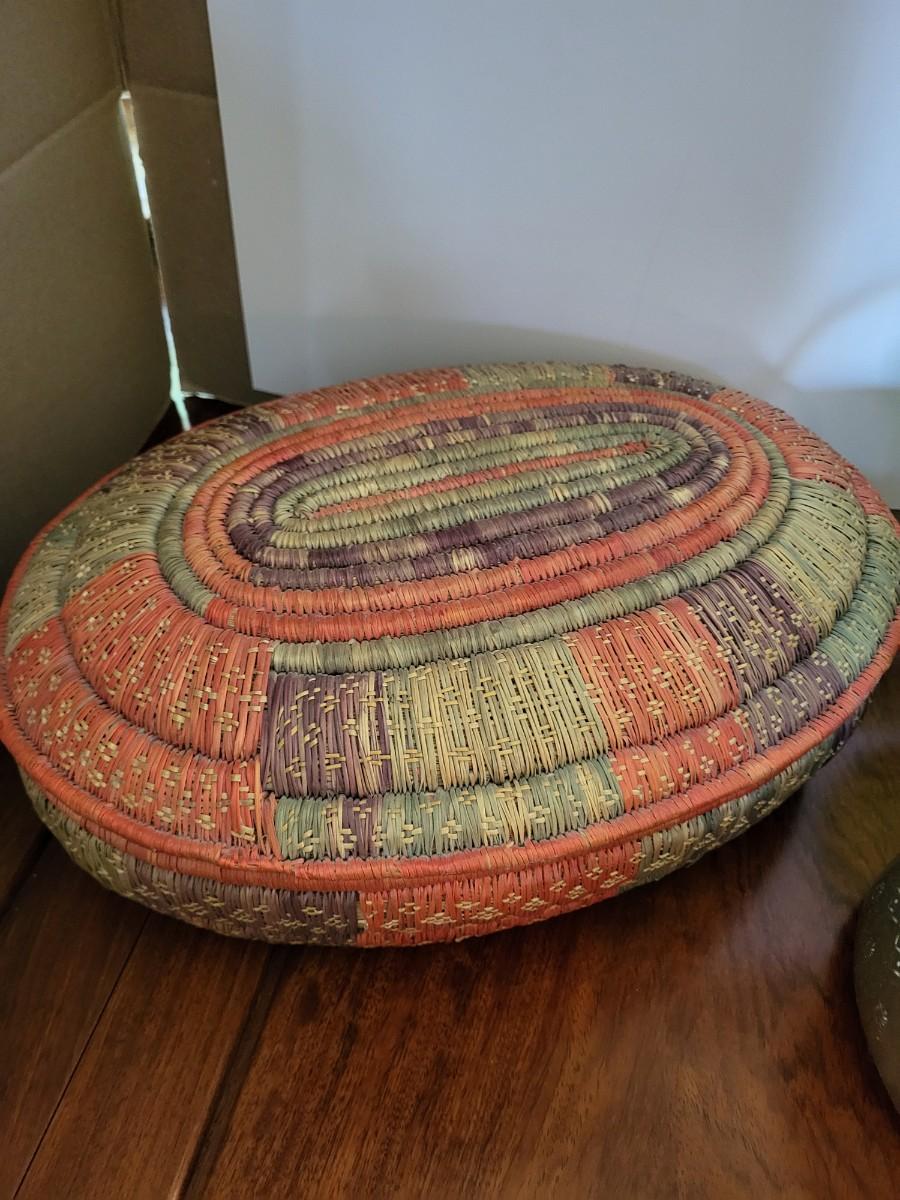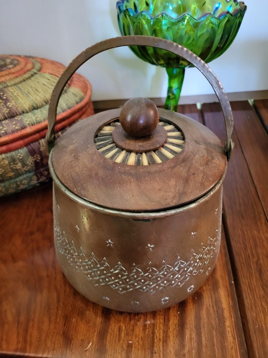 COLORFUL HAND WOVEN BASKET W/LID, CARNIVAL GLASS CANDY DISH AND BRASS BISCUIT JAR