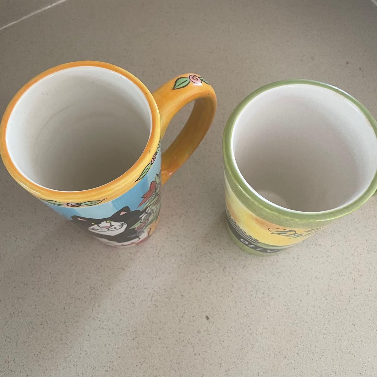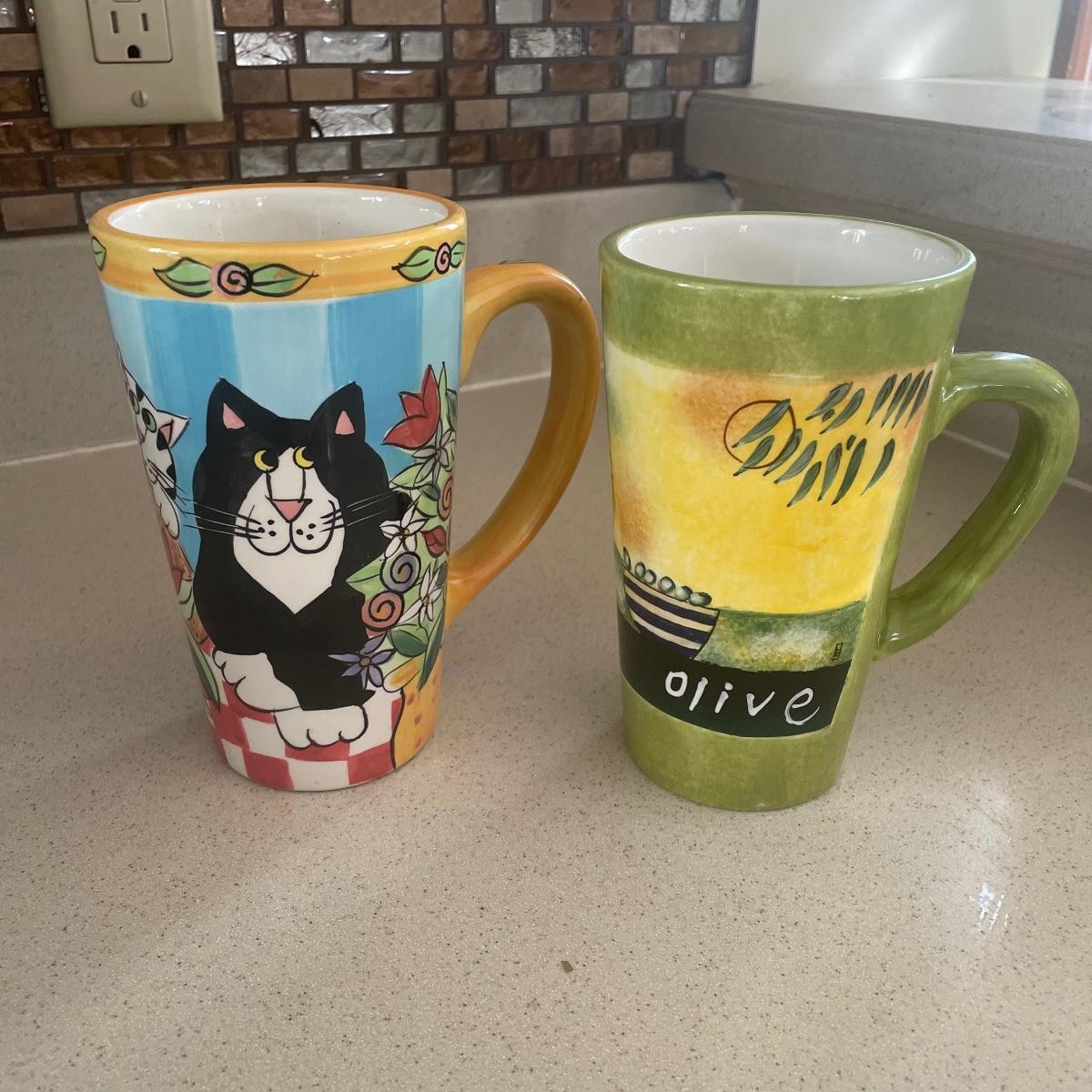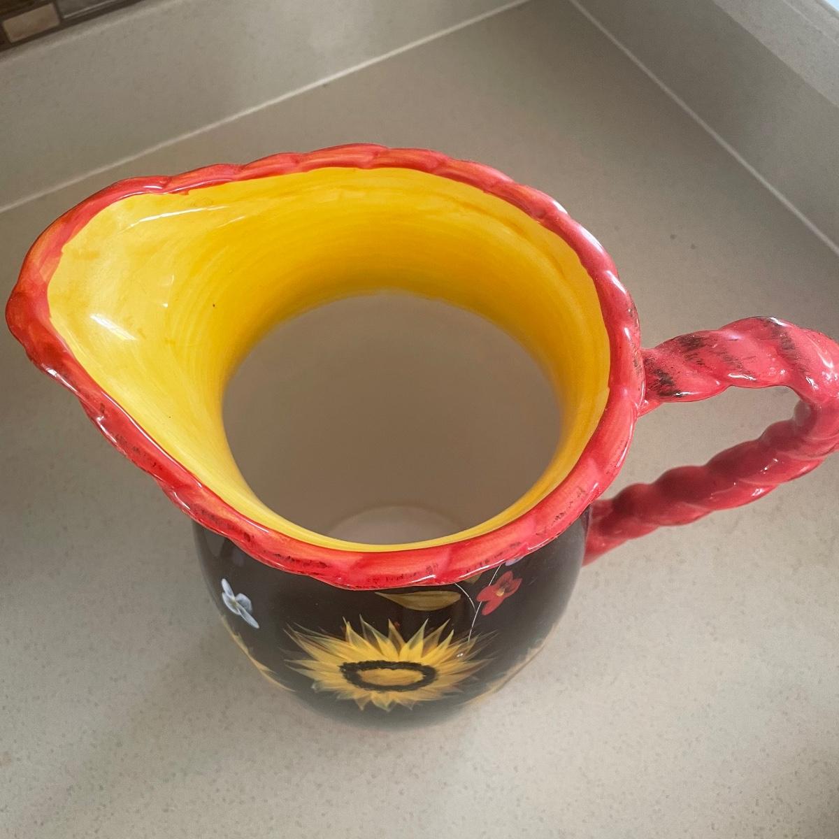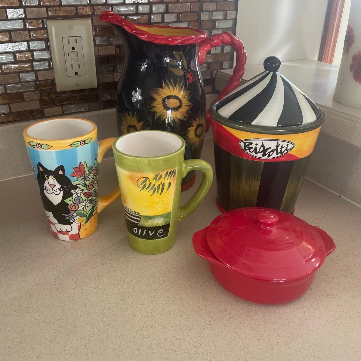 Brighten up your kitchen with this lot that includes two mugs, a large pitcher, lidded jar, a lidded terrine and an olive oil bottle (added to the lot later and not in the main pic).