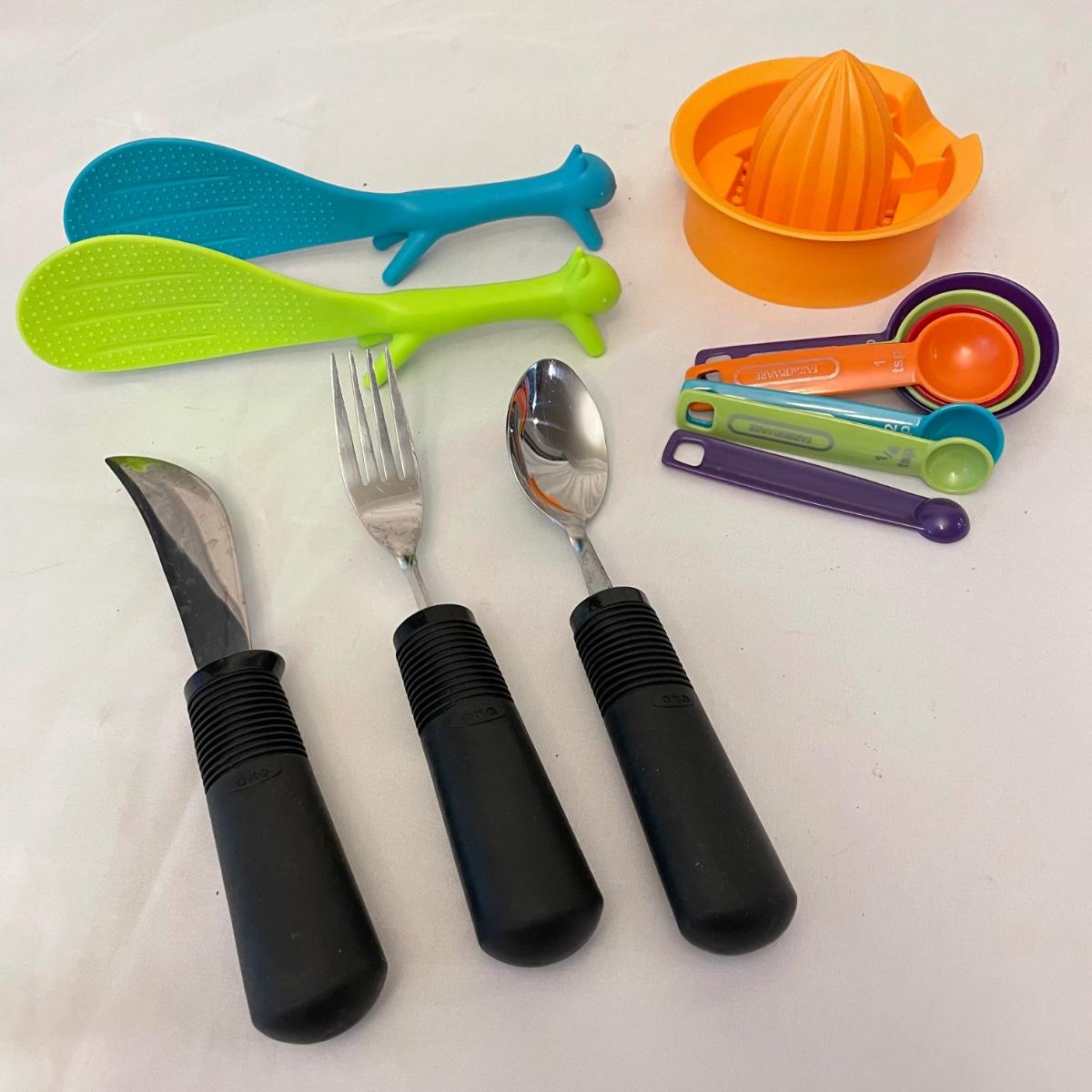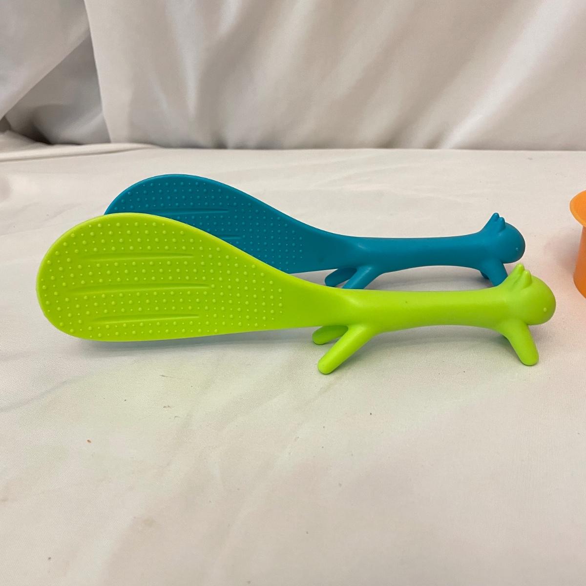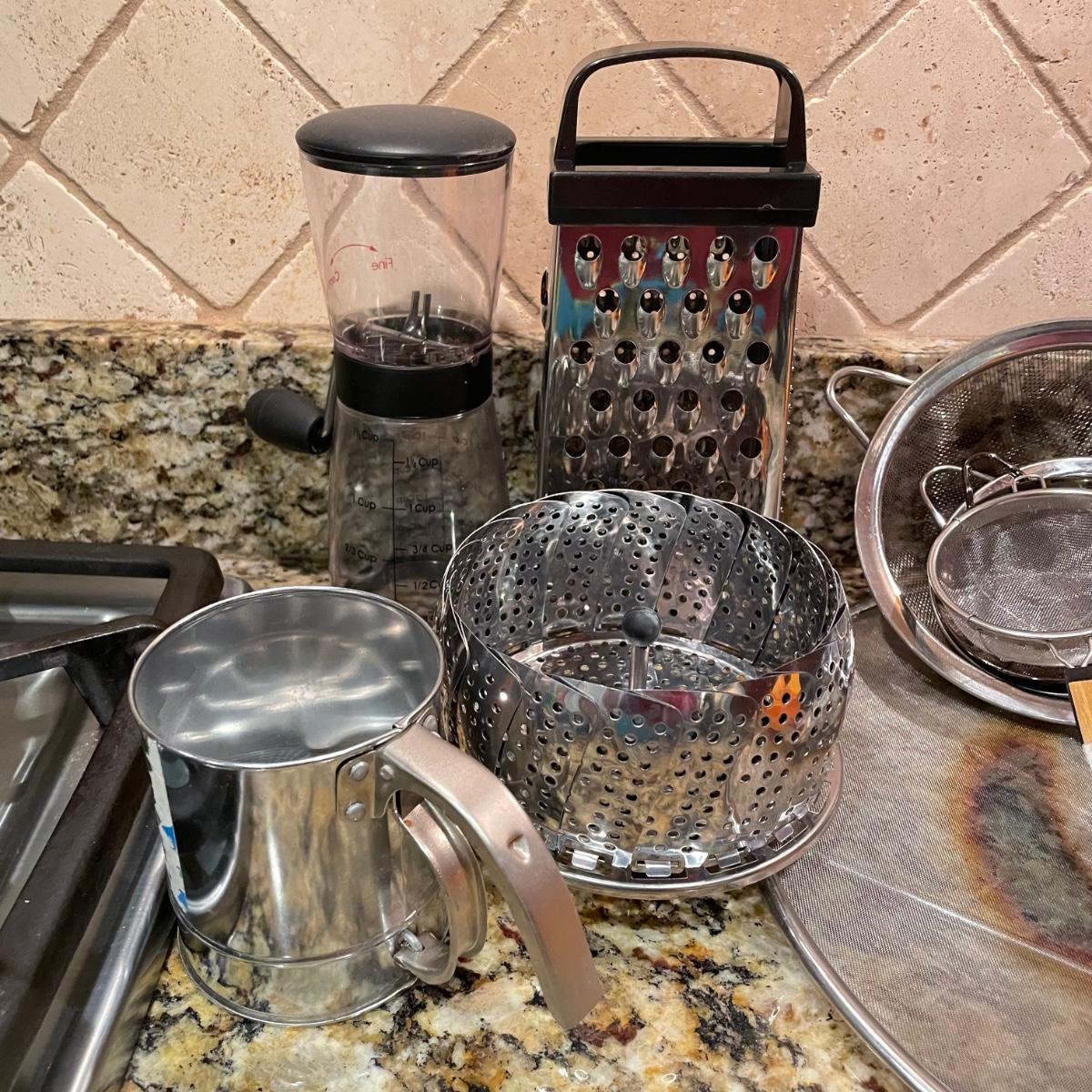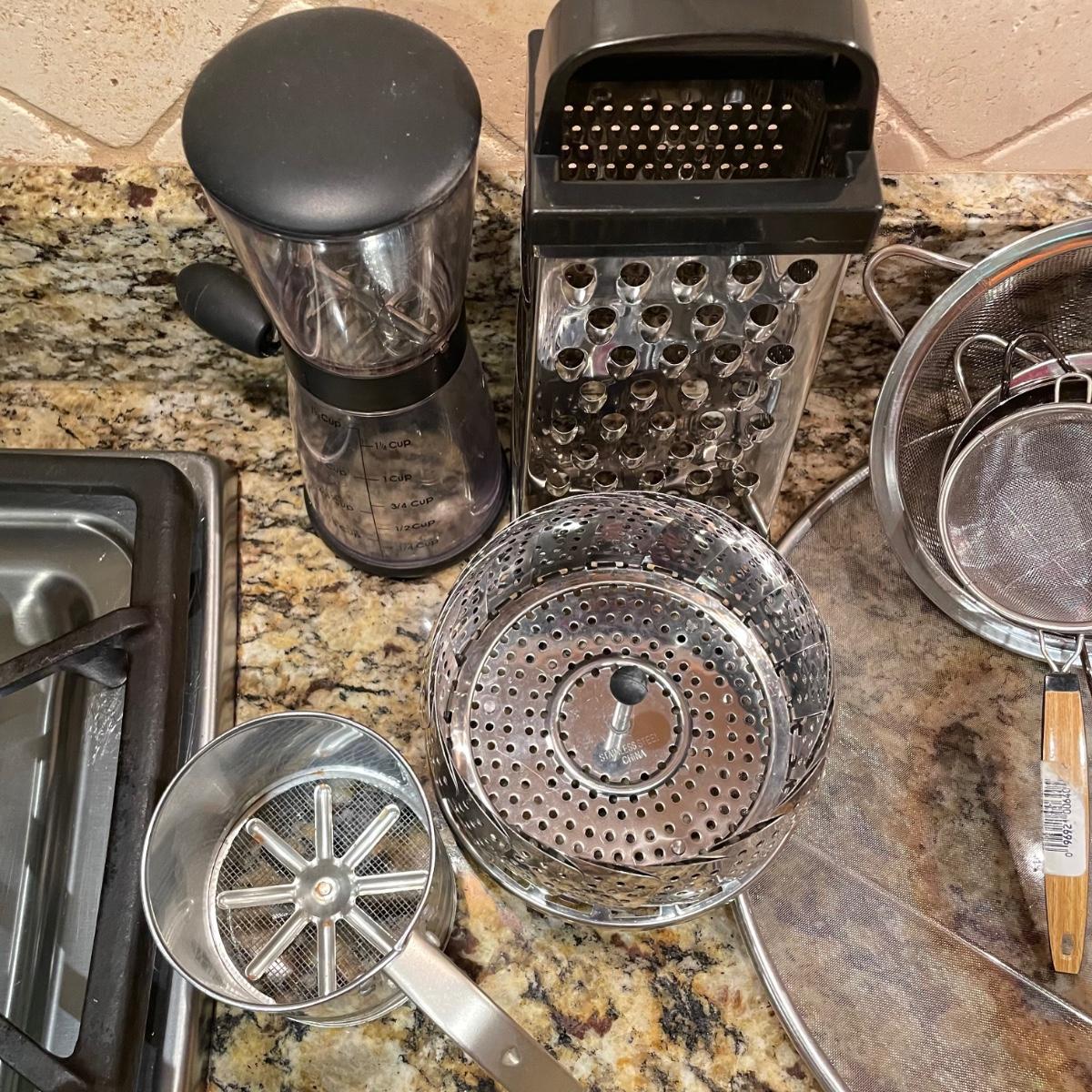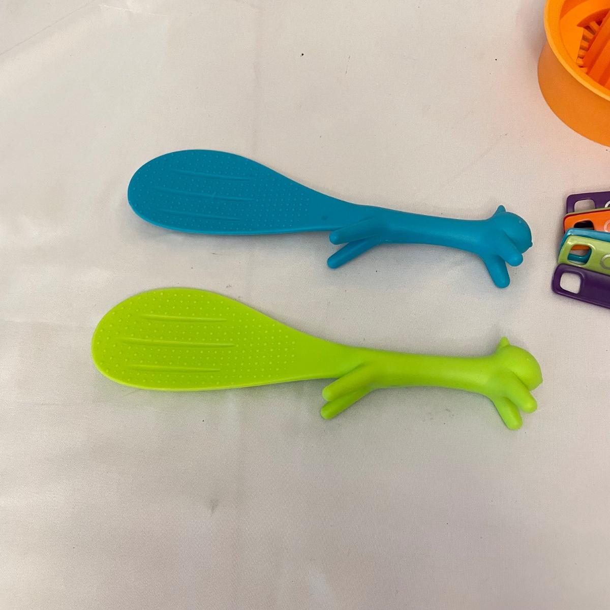 A fun and useful selection of kitchen utensils and gadgets. Two fun squirrel spoon/spatulas start the lot off, they come with legs that do not require a spoon rest. Lot also features a rainbows set of Farberware measuring spoons and three different partial sets of measuring scoops, all missing the 1/2 cup size. A 3pc thick handled flatware set, an orange plastic citrus juicer, a grease screen, multiple sifters, a steamer, grater, mashers and more. Local pick up only.