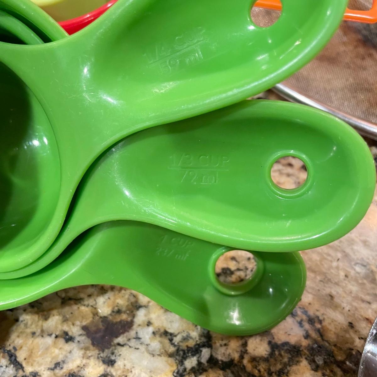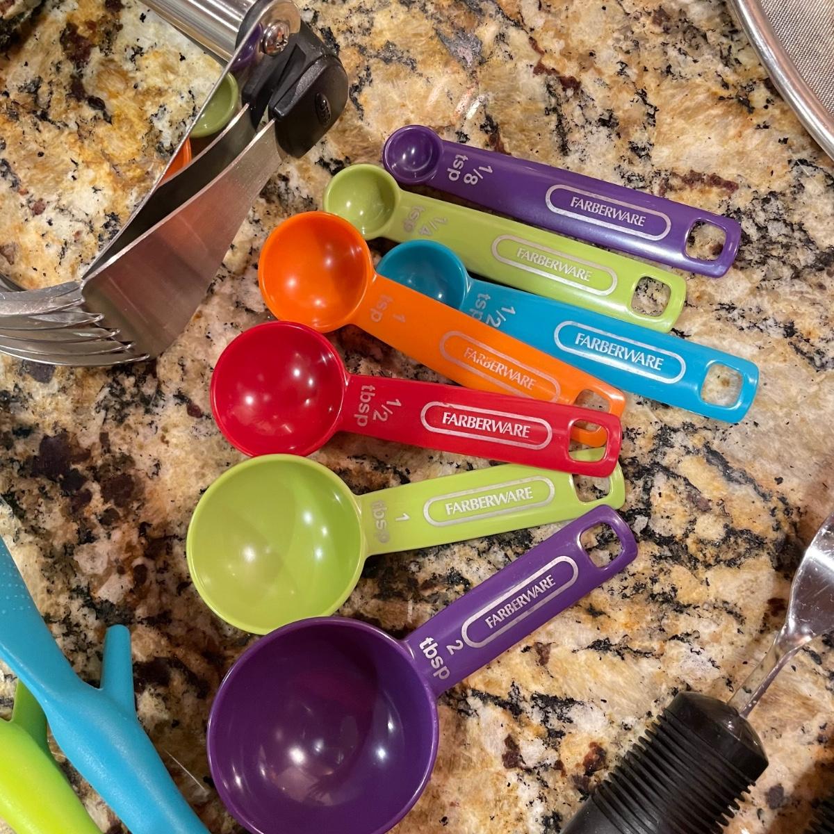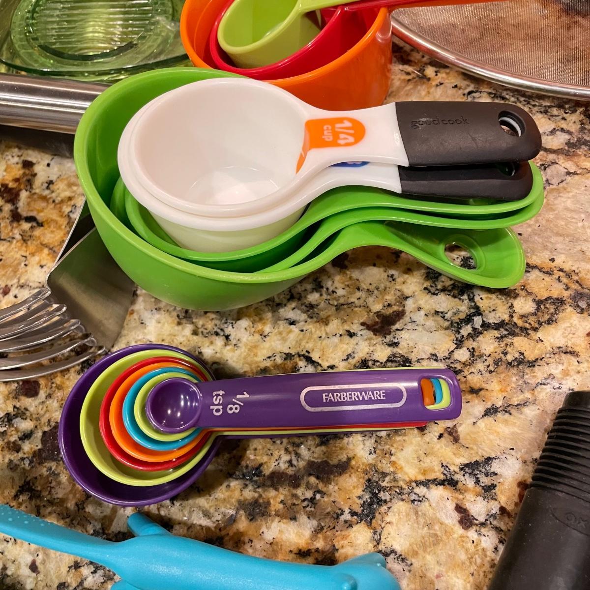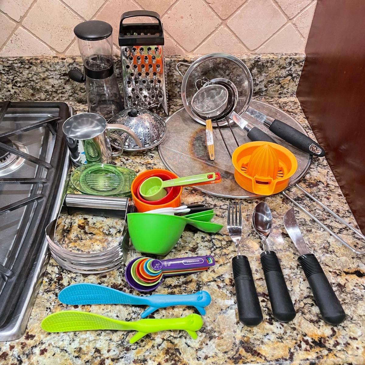 A fun and useful selection of kitchen utensils and gadgets. Two fun squirrel spoon/spatulas start the lot off, they come with legs that do not require a spoon rest. Lot also features a rainbows set of Farberware measuring spoons and three different partial sets of measuring scoops, all missing the 1/2 cup size. A 3pc thick handled flatware set, an orange plastic citrus juicer, a grease screen, multiple sifters, a steamer, grater, mashers and more. Local pick up only.