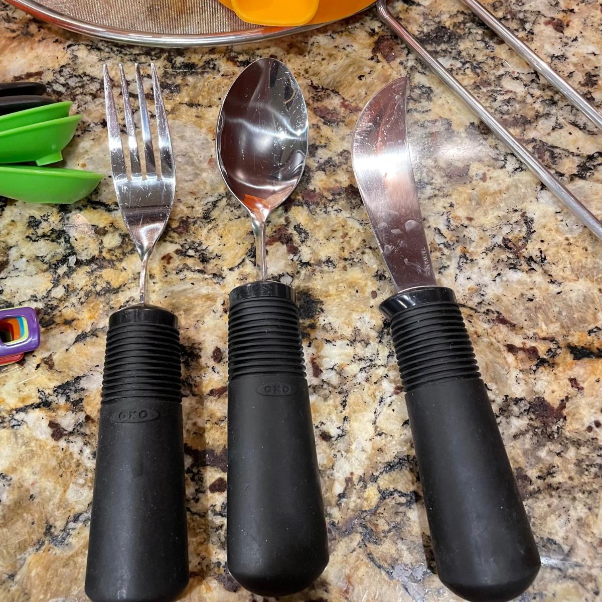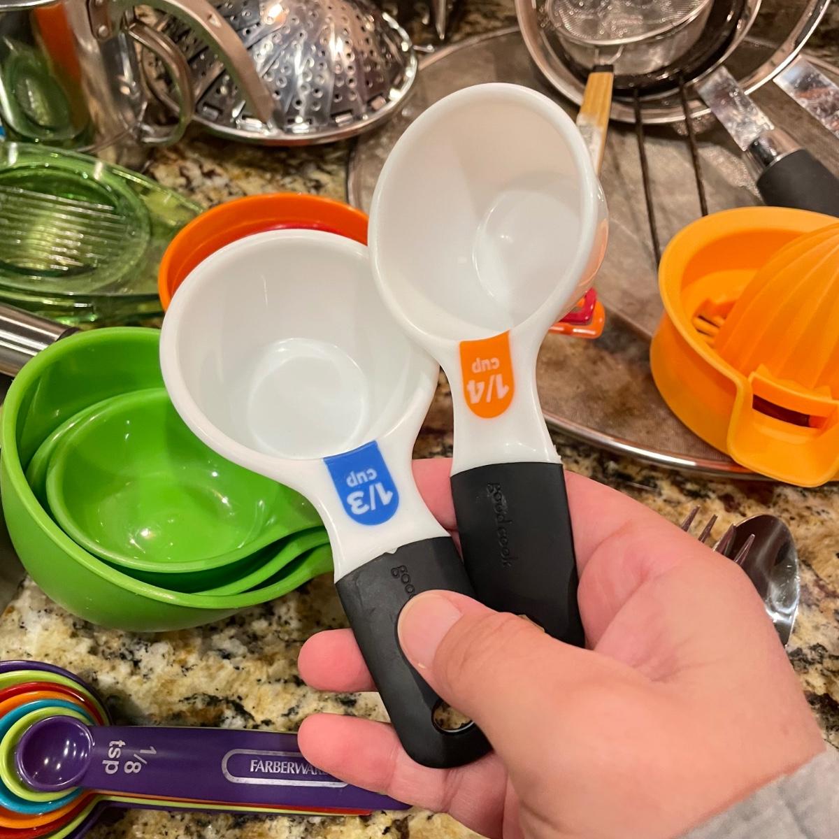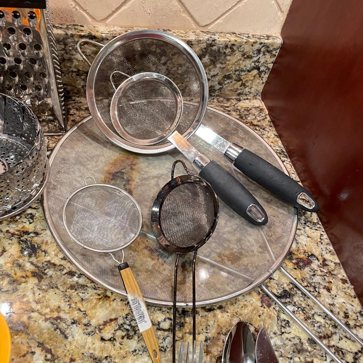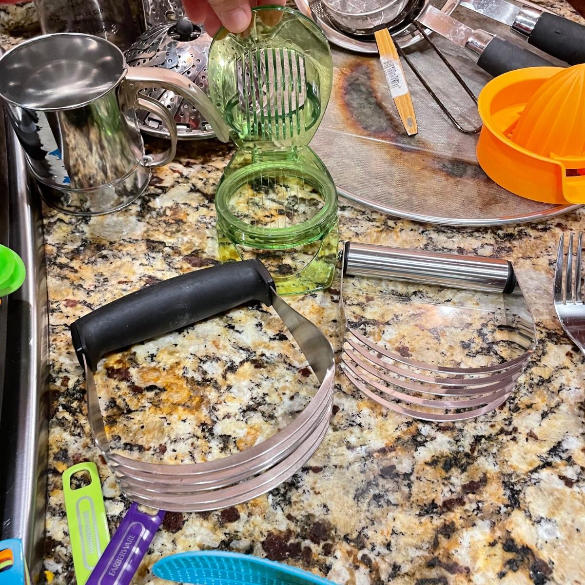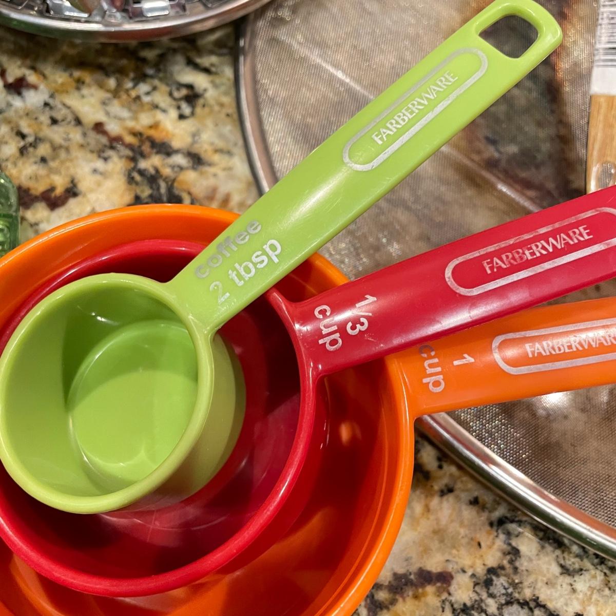 A fun and useful selection of kitchen utensils and gadgets. Two fun squirrel spoon/spatulas start the lot off, they come with legs that do not require a spoon rest. Lot also features a rainbows set of Farberware measuring spoons and three different partial sets of measuring scoops, all missing the 1/2 cup size. A 3pc thick handled flatware set, an orange plastic citrus juicer, a grease screen, multiple sifters, a steamer, grater, mashers and more. Local pick up only.