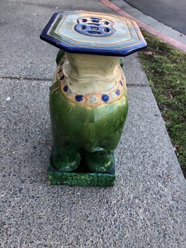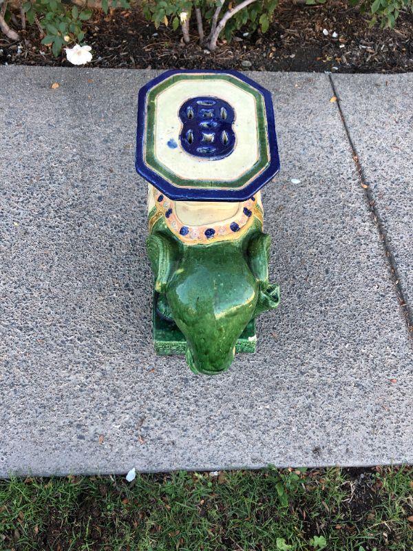 Colorful ceramic elephant plant stand. Ceramic statue great for indoor or outdoor decor. About 24” size. There is signs of age and wear, more towards the bottom.
