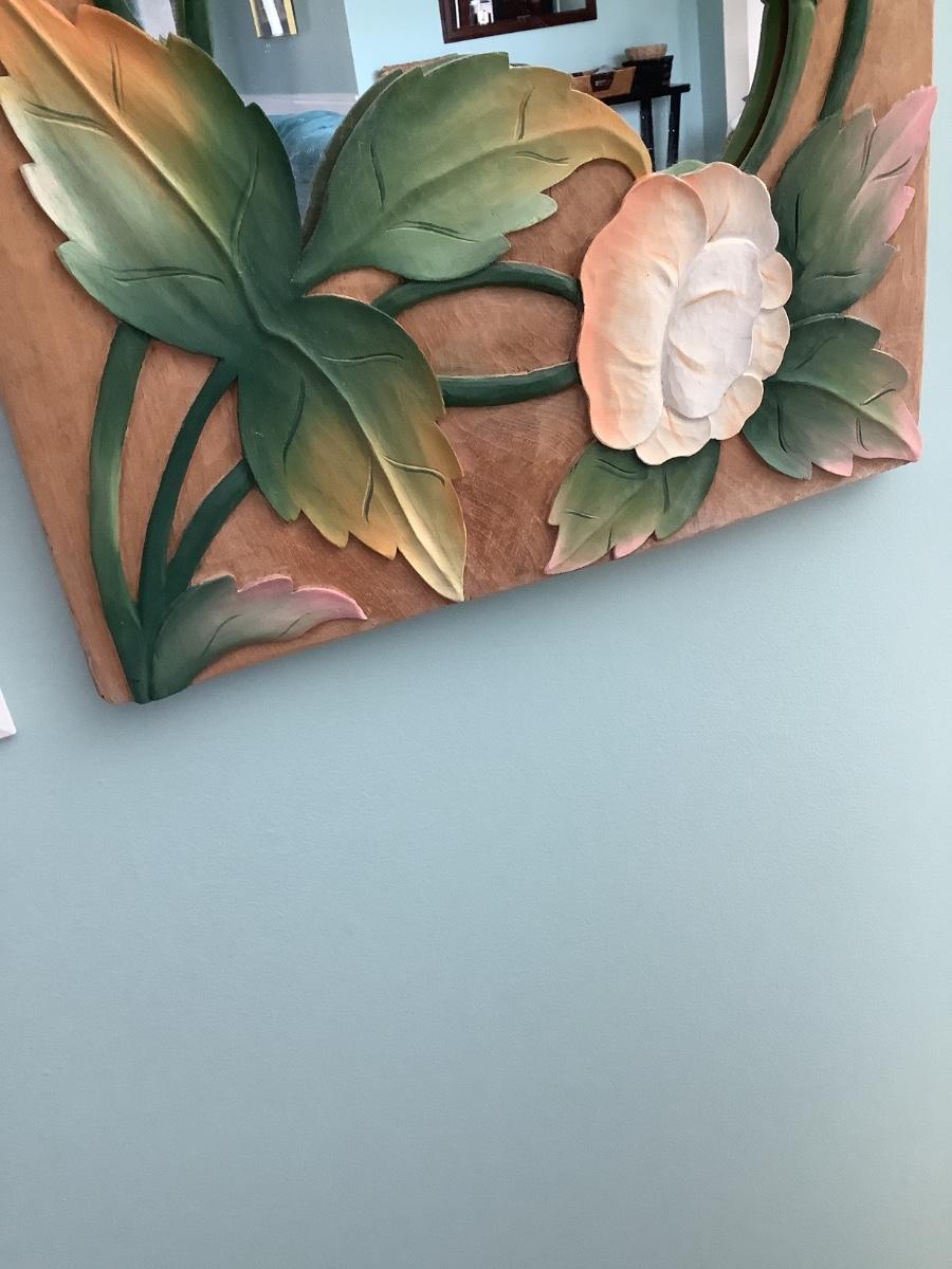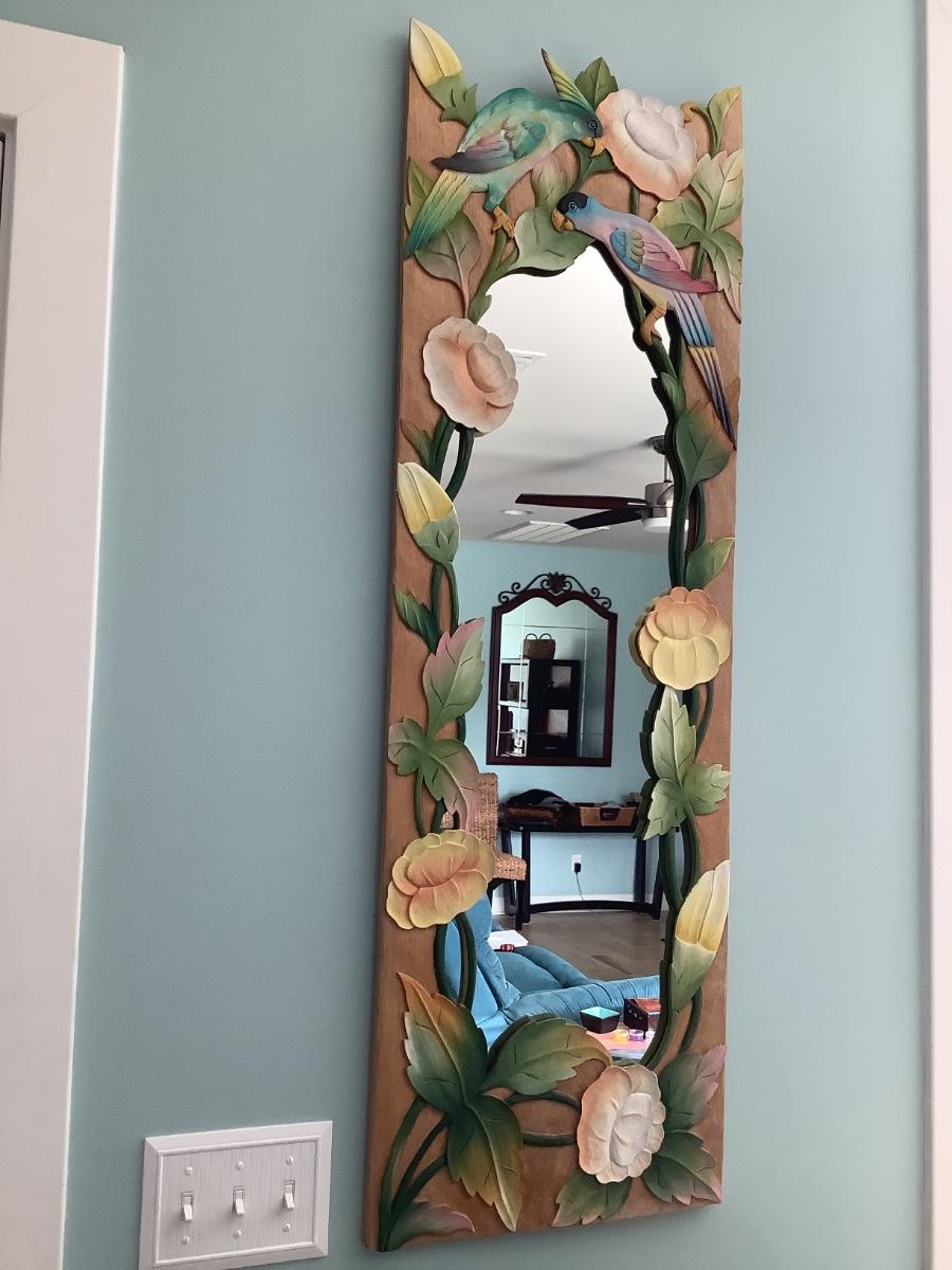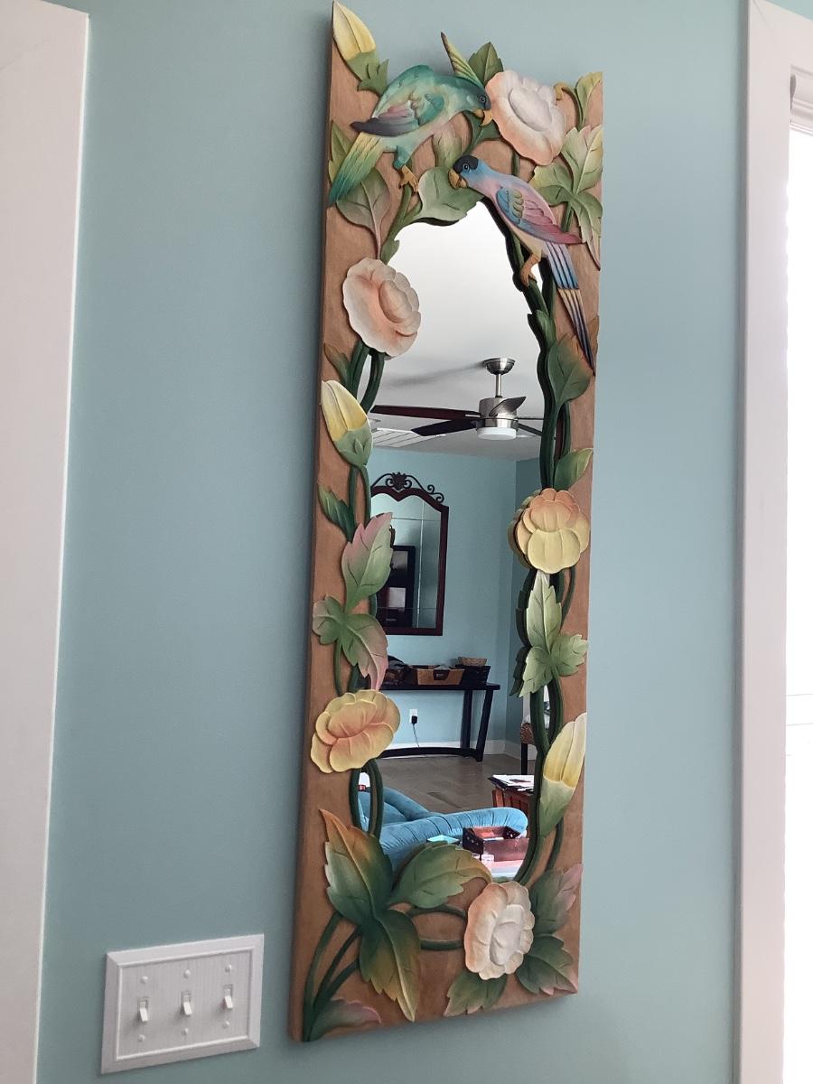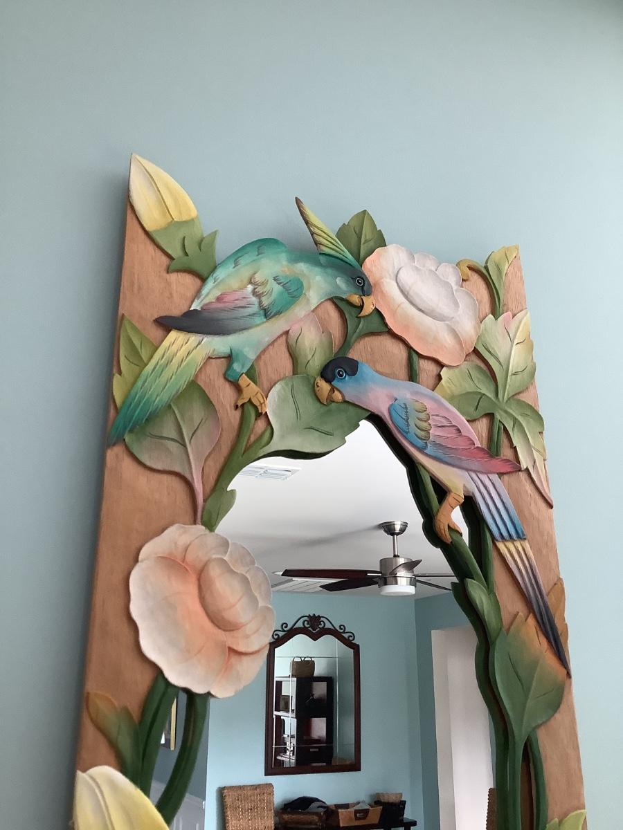 Colorful parrot mirror, natural wood & painted decor 4’H 16”W