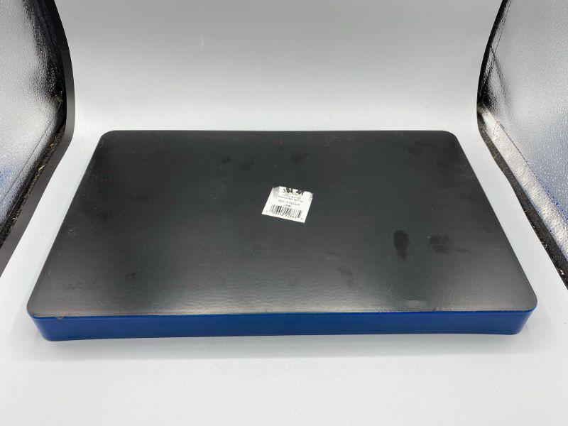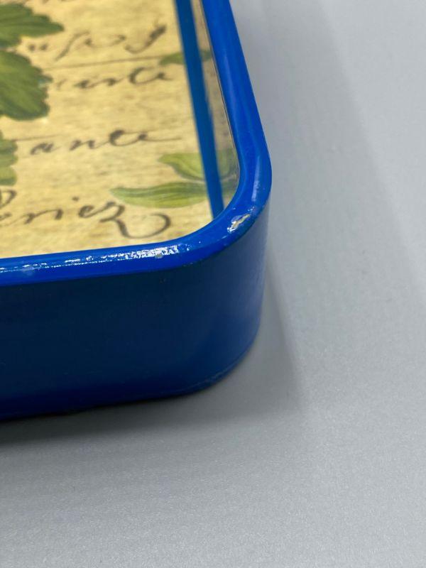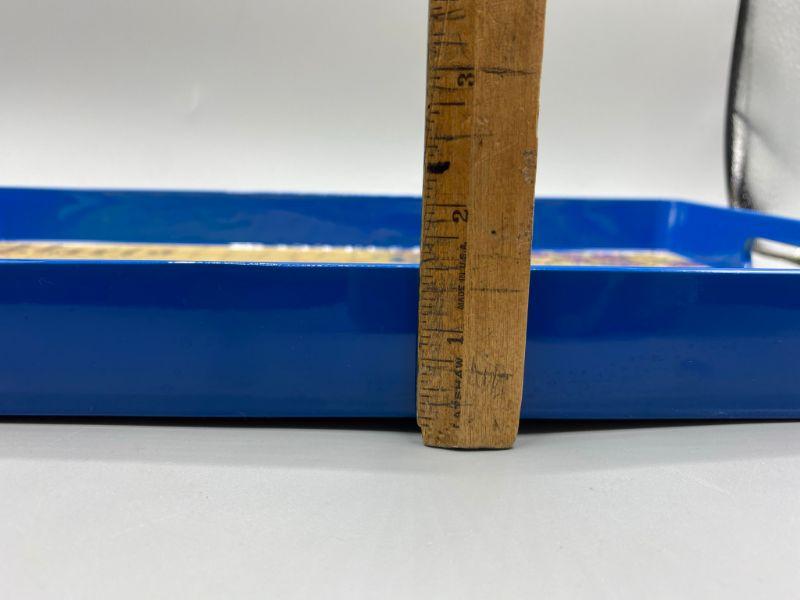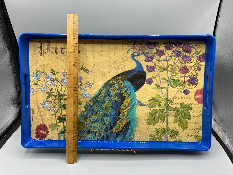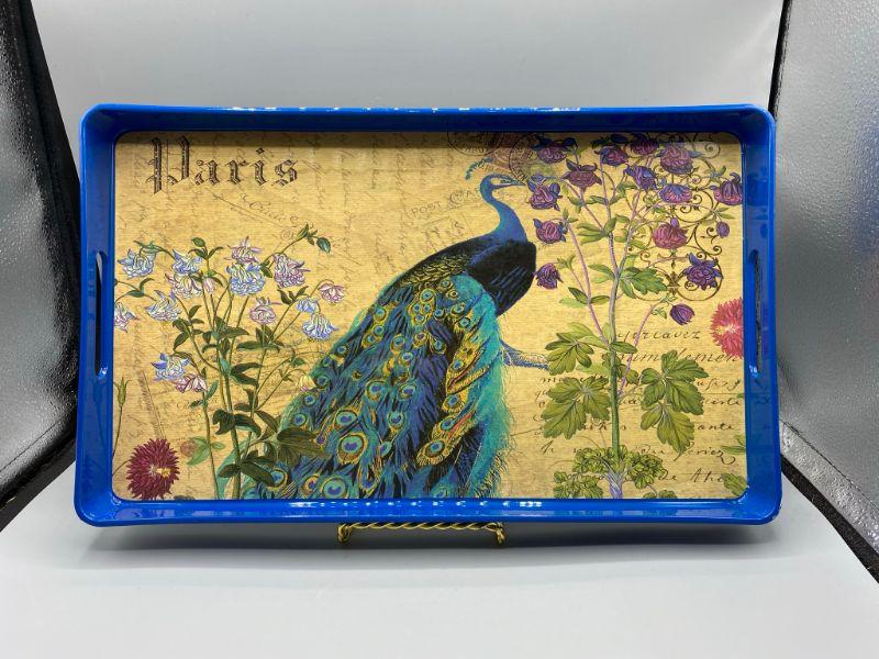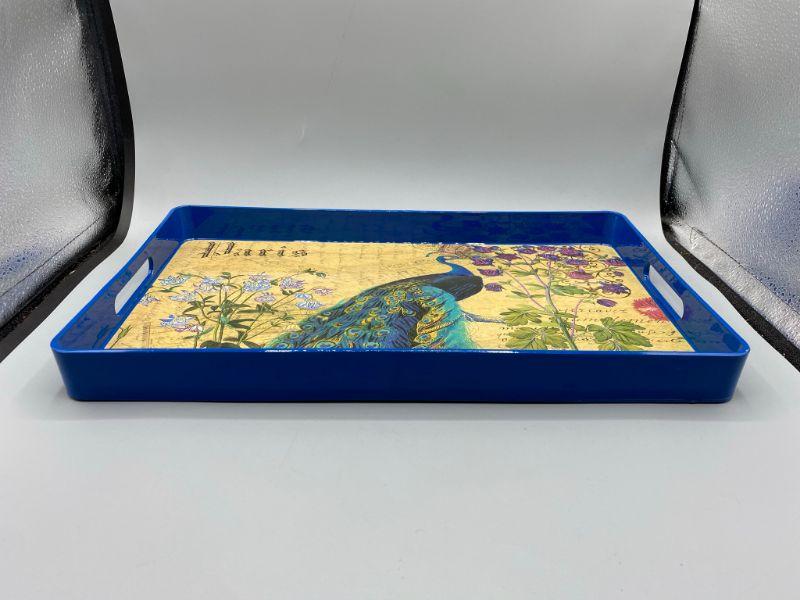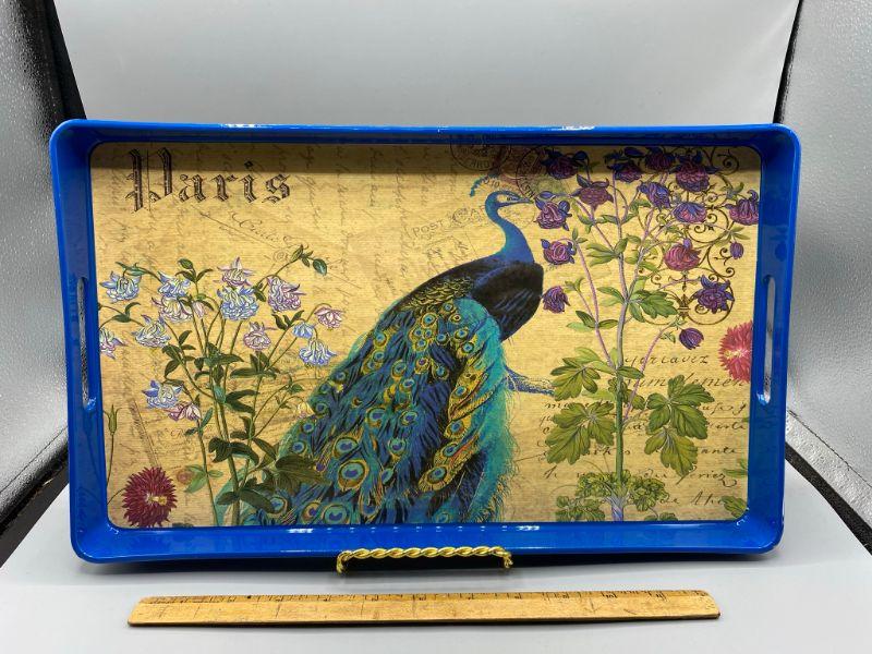 Colorful rectangular serving tray. Bright blue enamel sides. Features a peacock with flowers image on the tray. Has handle cut outs on the sides. Displays nicely. About 15".