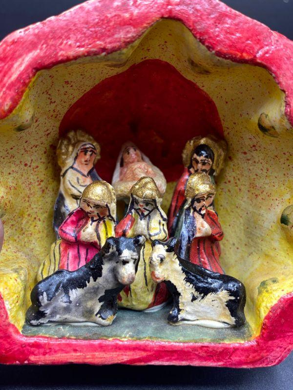 Colorful Peruvian Nativity scene. Handmade, painted inside and out. Stamped on the bottom.