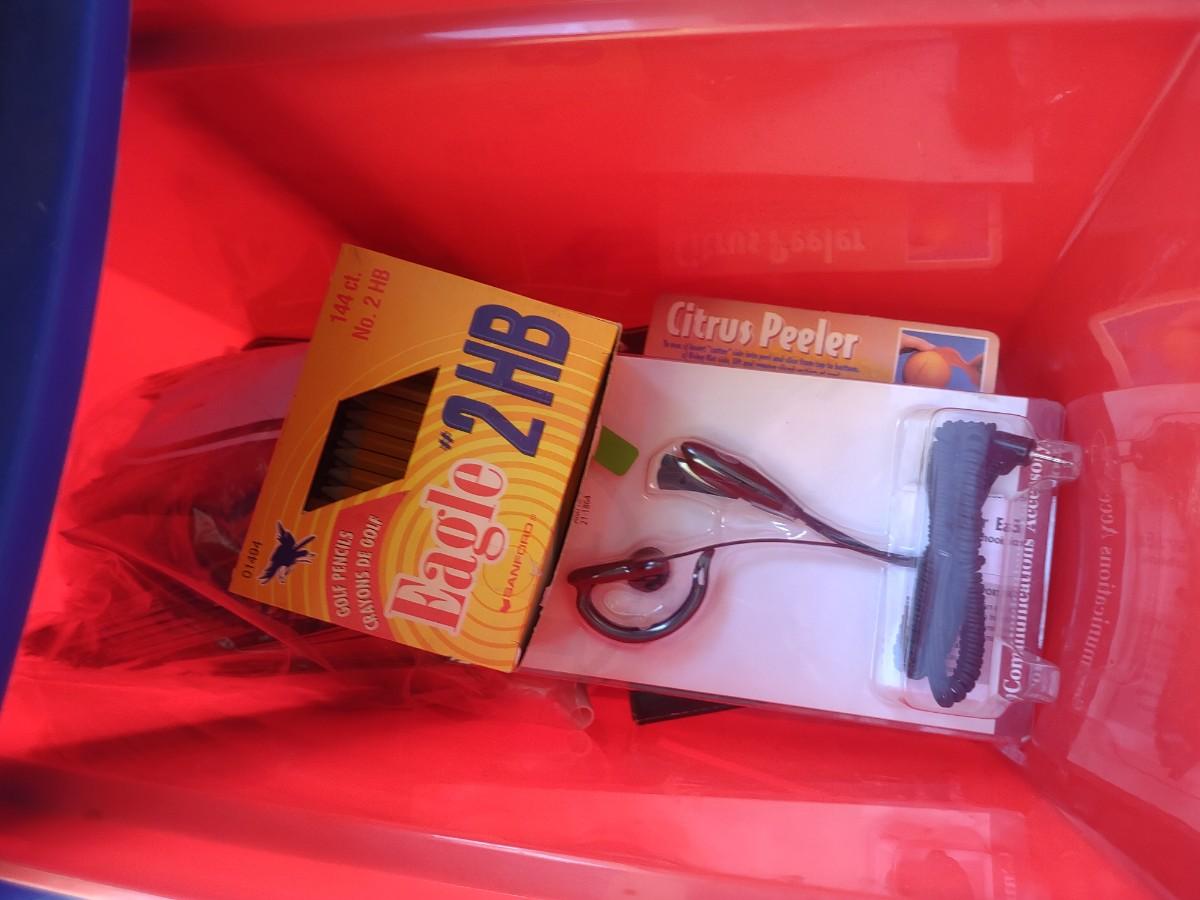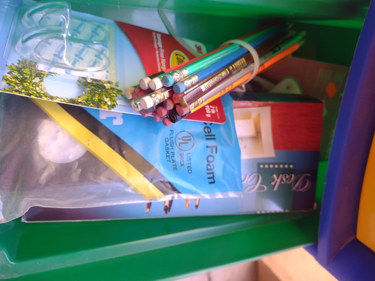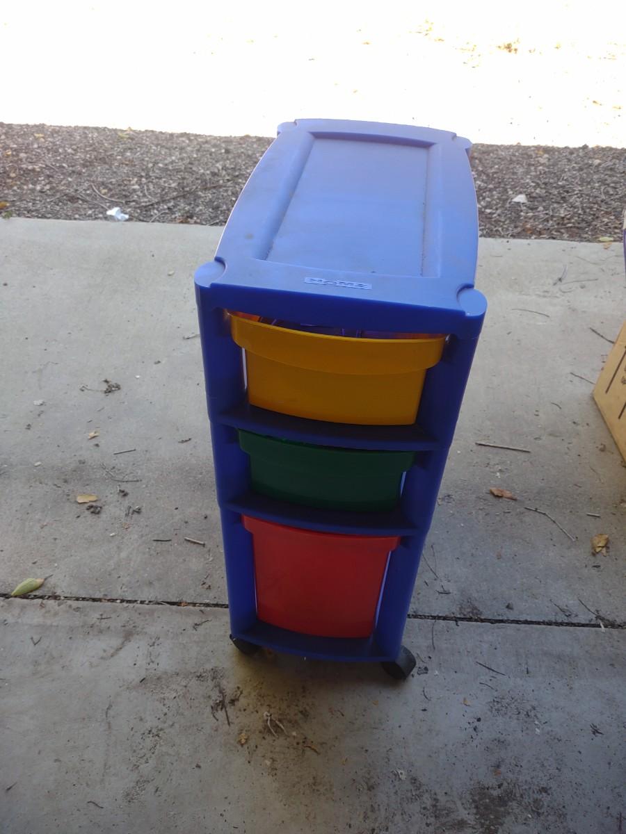 COLORFUL PLASTIC DRAWERS FILLED WITH HOUSEHOLD ITEMS